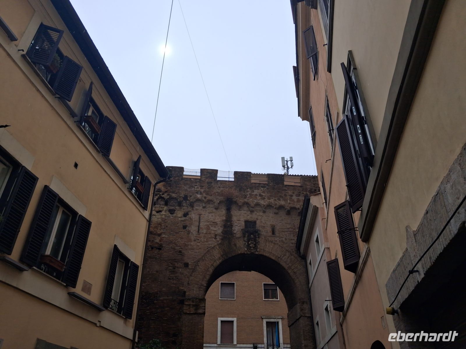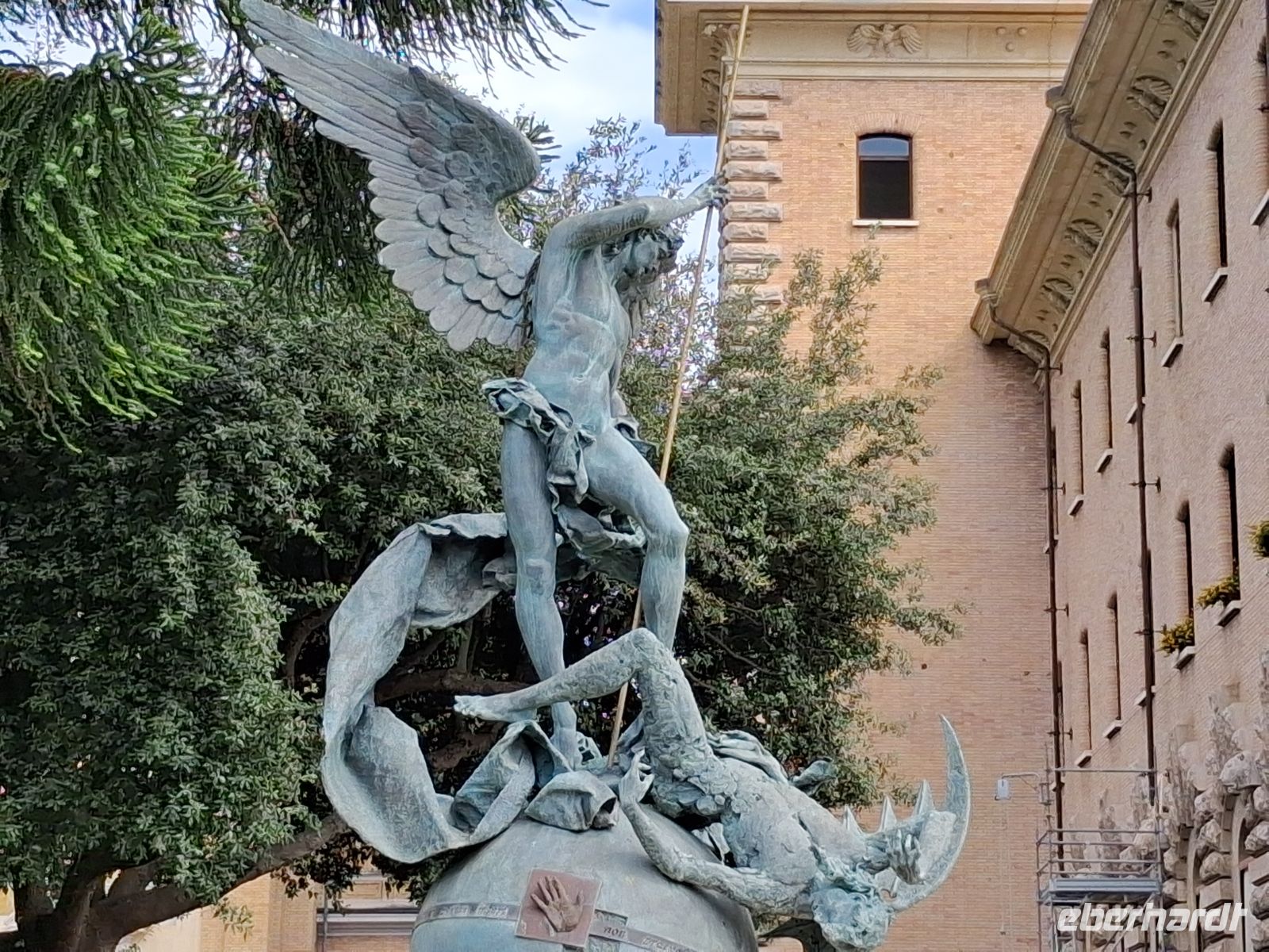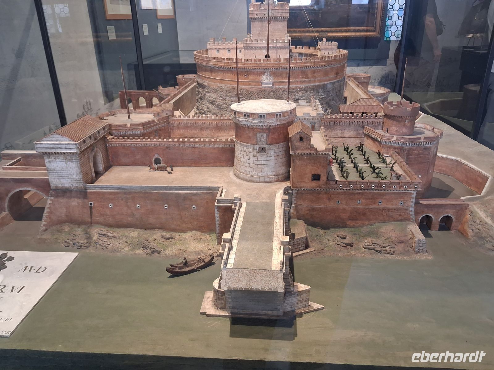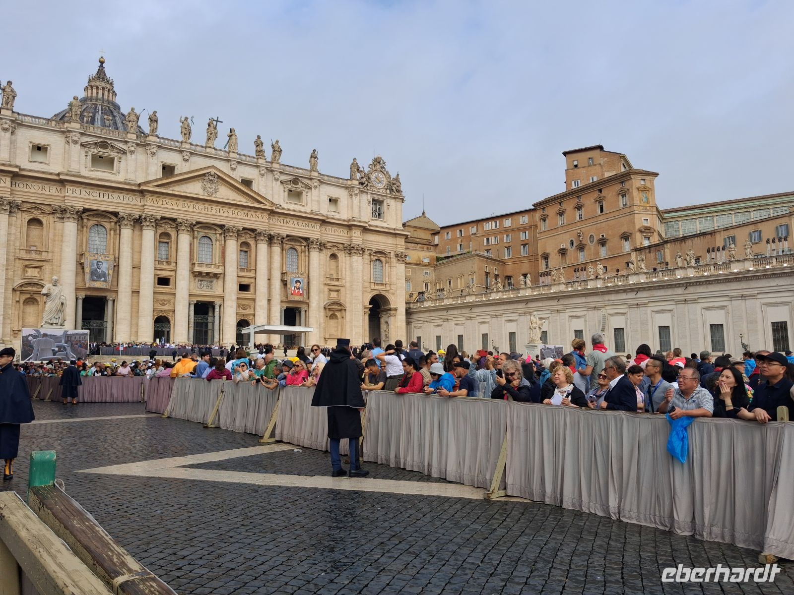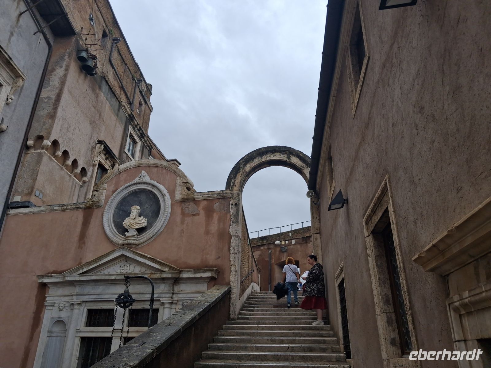 Unser Frühstück ziehen wir heute vor, um uns von unseren Chauffeuren zeitig zum Petersdom bringen zu lassen. Leider ist das Wetter heute regnerisch vorausgesagt, was sich auch bewahrheitet. Wir durchstehen gemeinsam mit unserer kämpferischen Reiseführerin - im Regen - die Zugangskontrolle zur Audienz auf dem Petersplatz. Als Papst Leo XIV. mit seinem Papstmobil durch die Reihen fährt, hat der Regen glücklicherweise nachgelassen. Wir sehen ihn ganz aus der Nähe und können die Reden auf den großen Leinwänden verfolgen. Die Stimmung der internationalen Gäste und Pilger ist aufgeregt und gespannt auf den neuen Papst. Im Anschluss sammeln wir uns und nehmen eine Stärkung in einem familiären Café in der Vatikanstadt ein. Bei leichtem Regen spazieren wir entlang am Passetto di Borgo, dem oberhalb der Straße gelegenen Übergang vom Petersdom bis zur Engelsburg. Agnieszka führt uns durch die kleinen Gassen der Altstadt im Vatikan, vorbei an Schneidergeschäften für kirchliche Würdenträger und Souvenirläden, bis wir die Engelsburg am Tiber erreichen. Hier erfahren wir Wissenswertes über die Geschichte dieses imposanten Gebäudes, das ursprünglich als Mausoleum für den Kaiser Hadrian und seine Familie erbaut wurde. In den Jahrhunderten hat es wegen seiner strategischen Lage direkt am Tiber und nah am Vatikan vielen Zwecken gedient: Das Grabgebäude wurde umgebaut zu einer Festung und diente Päpsten als Rückzugsort in Krisenzeiten. Außerdem war die Engelsburg ein Gefängnis für Staatsgefangene. Wir besichtigen das Museum, das die bewegte Geschichte aus der Kaiserzeit über das Mittelalter bis zur Renaissance und Moderne zeigt. Von ganz oben, wo die Statue des Erzengels Michael thront (der hier Papst Gregor I. erschienen sein soll), genießen wir einen atemberaubenden Blick auf den Vatikan und die Stadt Rom.