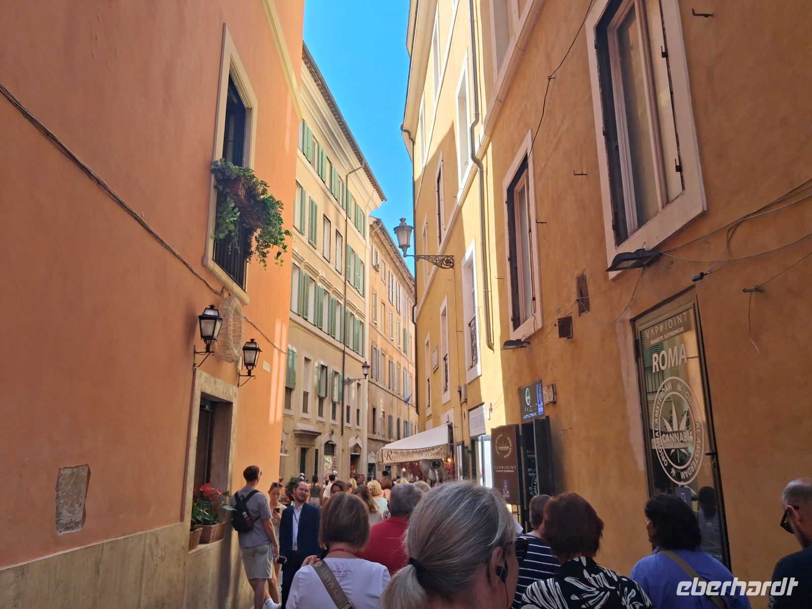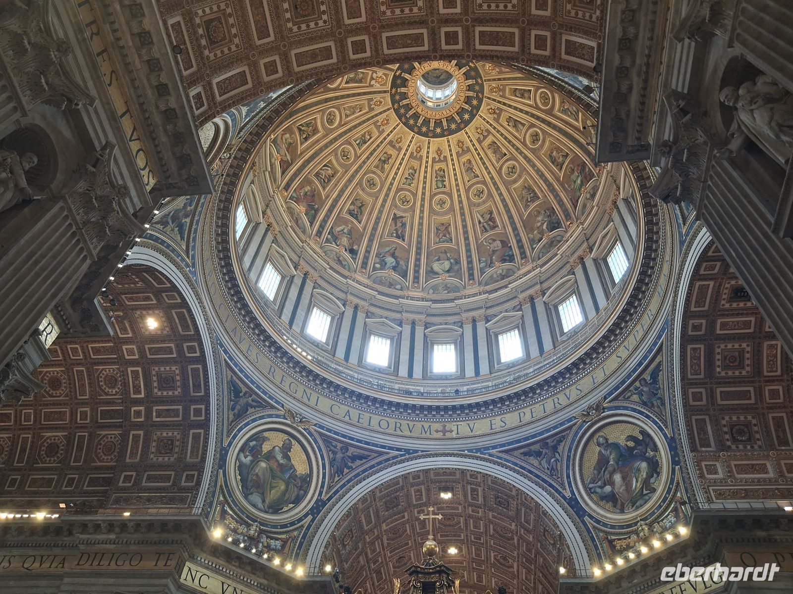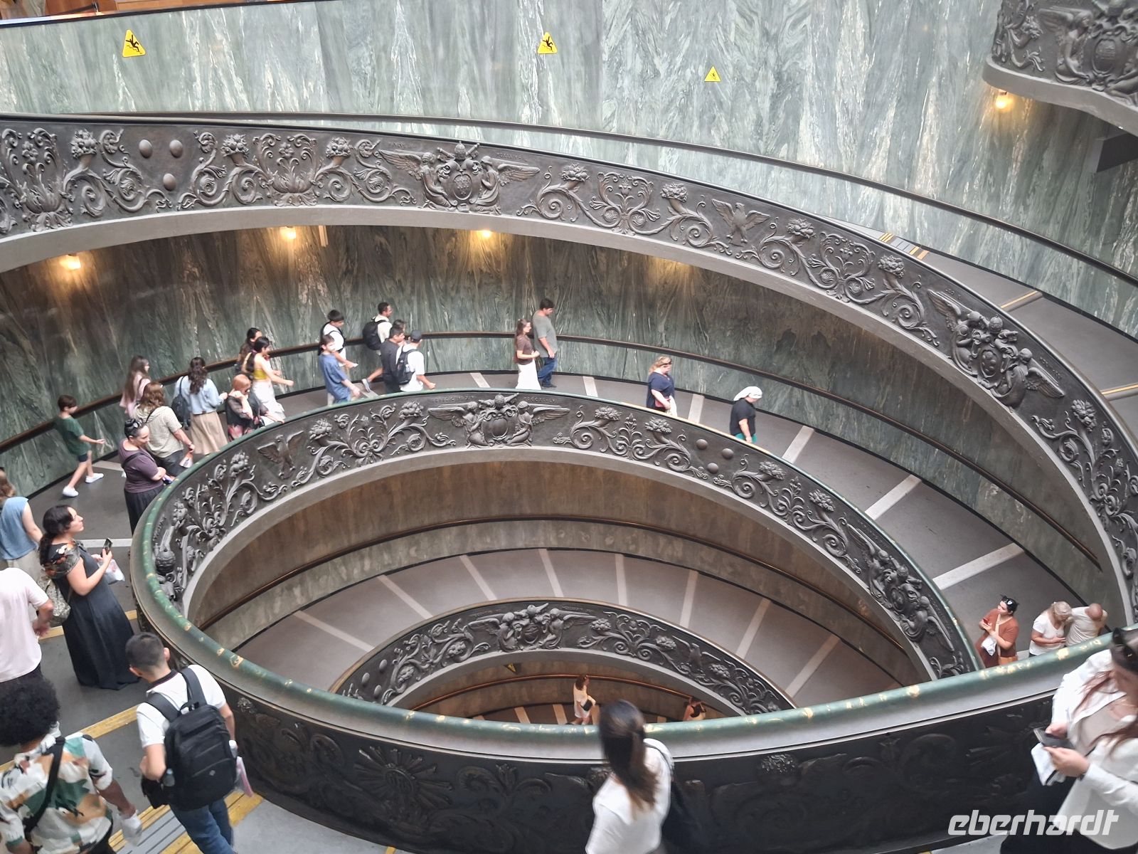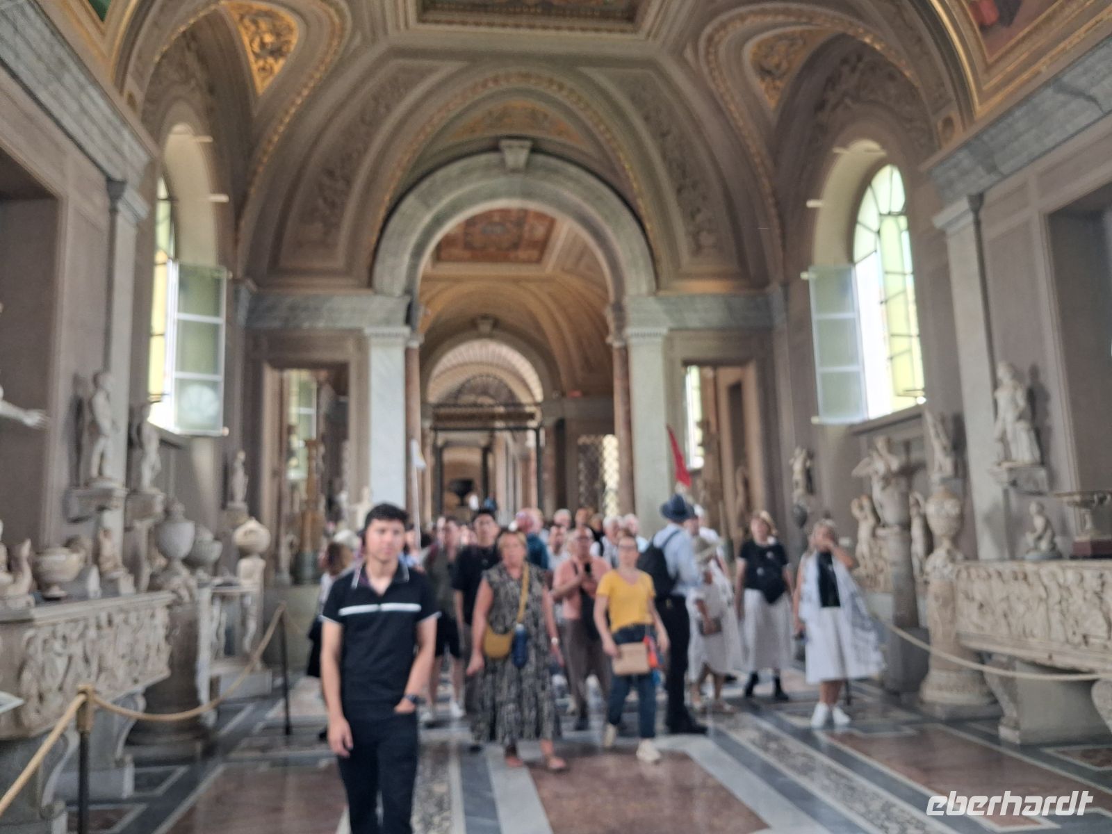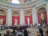 Nach dem Frühstück begeben wir uns mit der U-Bahn zu den Vatikanischen Museen, wo wir unsere Reiseführerin treffen. Die Stadt ist noch recht ruhig, da in Rom noch Ferien sind. Auf dem Weg zu den Museen schlendern wir durch ein paar Gassen und entdecken eine Pastamanufaktur, in der wir Einblick in die Herstellung großer Mengen frischer Nudeln bekommen. In den Vatikanischen Museen angekommen, ermöglichen uns unsere Sondertickets zunächst eine Busfahrt mit Audiogeräten durch die Vatikanischen Gärten. Das Licht auf die verschiedenen Bereiche des kunstvoll angelegten Parks am Morgen ist herrlich. Wir sehen kunstvoll angelegte Wege, große Brunnen, Denkmäler und Kapellen, die sich harmonisch zwischen Palmen, Pinien und Rosenbeeten erheben. Immer wieder bieten sich herrliche Ausblicke auf die Kuppel des Petersdoms, der heute ebenfalls auf dem Programm steht. Nach der Rundfahrt wechseln wir von der Natur zur Kunst: Schon der erste Eindruck in den Vatikanischen Museen ist überwältigend. Lange kunstvoll geschmückte Gänge, Statuen, Deckenmalereien, Fresken, Tapisserien und verschiedenste einzigartige Kunstwerke begegnen uns während unserer Führung. Der Höhepunkt unseres Besuchs ist die Sixtinische Kapelle - ein heiliger Ort, den wir in aller Stille genießen. Alle Blicke sind auf die Fresken von Michelangelo gerichtet. Wir genießen die leuchtenden Farben der gewaltigen Szenen aus der Schöpfungsgeschichte, bevor wir durch einen Seitenausgang direkt zum Petersdom gehen.