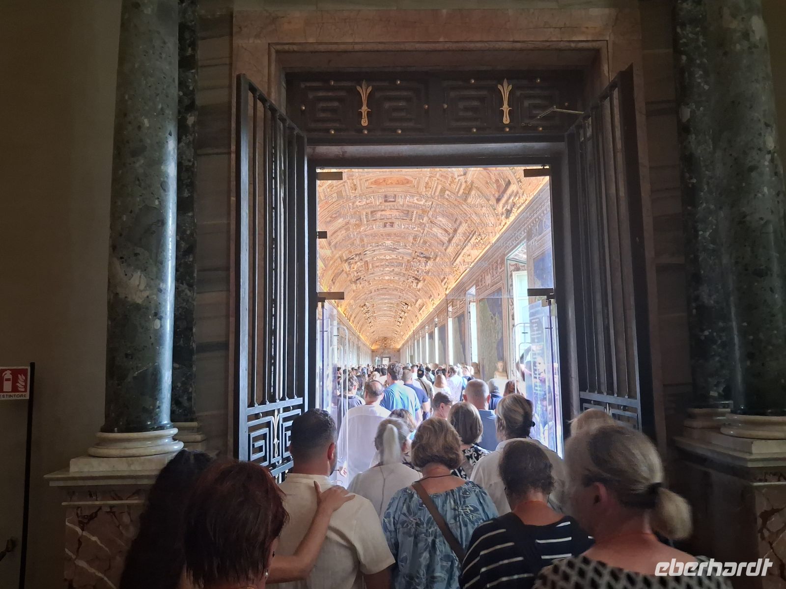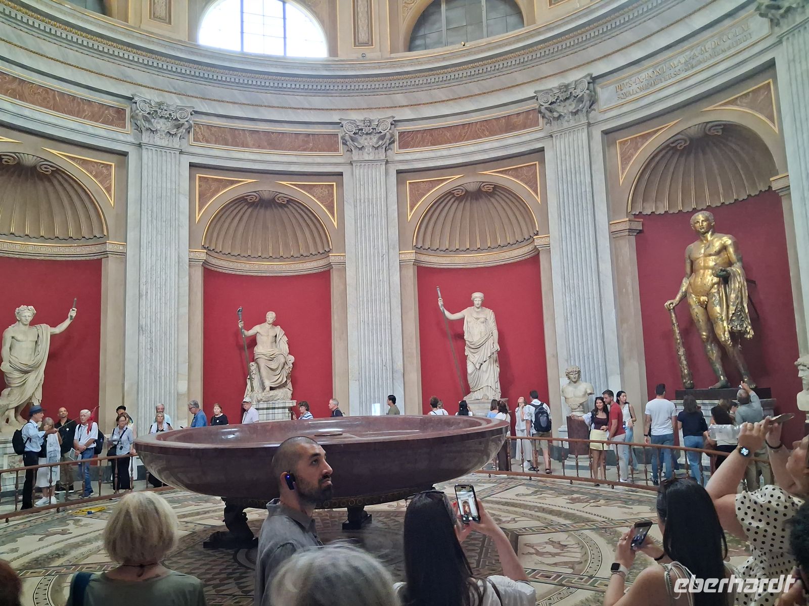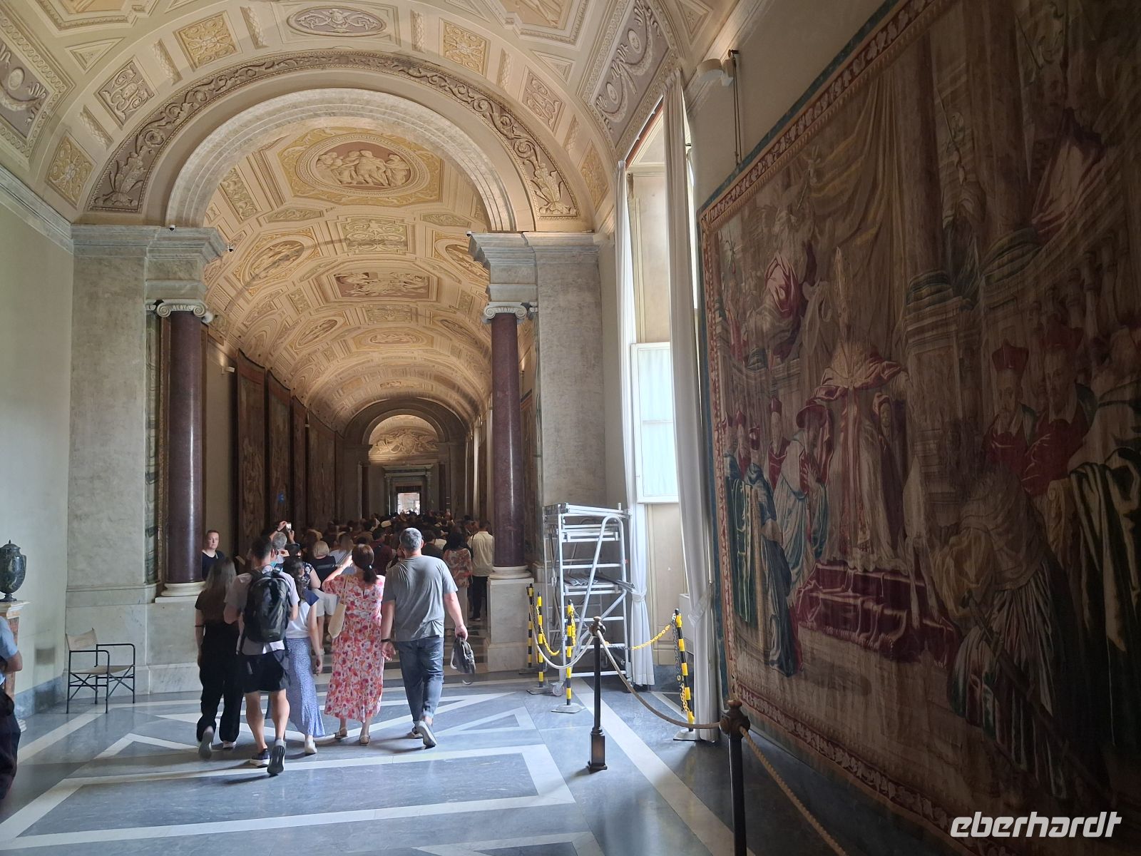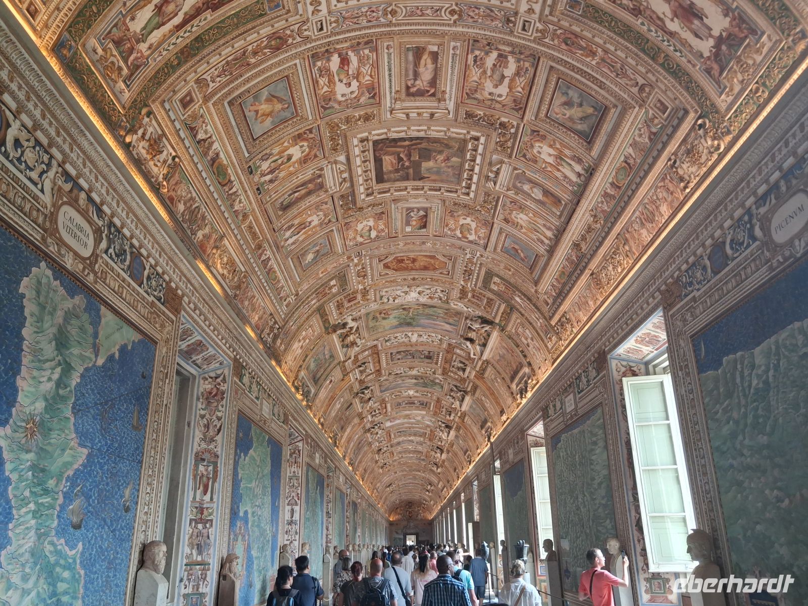 Nach dem Frühstück begeben wir uns mit der U-Bahn zu den Vatikanischen Museen, wo wir unsere Reiseführerin treffen. Die Stadt ist noch recht ruhig, da in Rom noch Ferien sind. Auf dem Weg zu den Museen schlendern wir durch ein paar Gassen und entdecken eine Pastamanufaktur, in der wir Einblick in die Herstellung großer Mengen frischer Nudeln bekommen. In den Vatikanischen Museen angekommen, ermöglichen uns unsere Sondertickets zunächst eine Busfahrt mit Audiogeräten durch die Vatikanischen Gärten. Das Licht auf die verschiedenen Bereiche des kunstvoll angelegten Parks am Morgen ist herrlich. Wir sehen kunstvoll angelegte Wege, große Brunnen, Denkmäler und Kapellen, die sich harmonisch zwischen Palmen, Pinien und Rosenbeeten erheben. Immer wieder bieten sich herrliche Ausblicke auf die Kuppel des Petersdoms, der heute ebenfalls auf dem Programm steht. Nach der Rundfahrt wechseln wir von der Natur zur Kunst: Schon der erste Eindruck in den Vatikanischen Museen ist überwältigend. Lange kunstvoll geschmückte Gänge, Statuen, Deckenmalereien, Fresken, Tapisserien und verschiedenste einzigartige Kunstwerke begegnen uns während unserer Führung. Der Höhepunkt unseres Besuchs ist die Sixtinische Kapelle - ein heiliger Ort, den wir in aller Stille genießen. Alle Blicke sind auf die Fresken von Michelangelo gerichtet. Wir genießen die leuchtenden Farben der gewaltigen Szenen aus der Schöpfungsgeschichte, bevor wir durch einen Seitenausgang direkt zum Petersdom gehen.