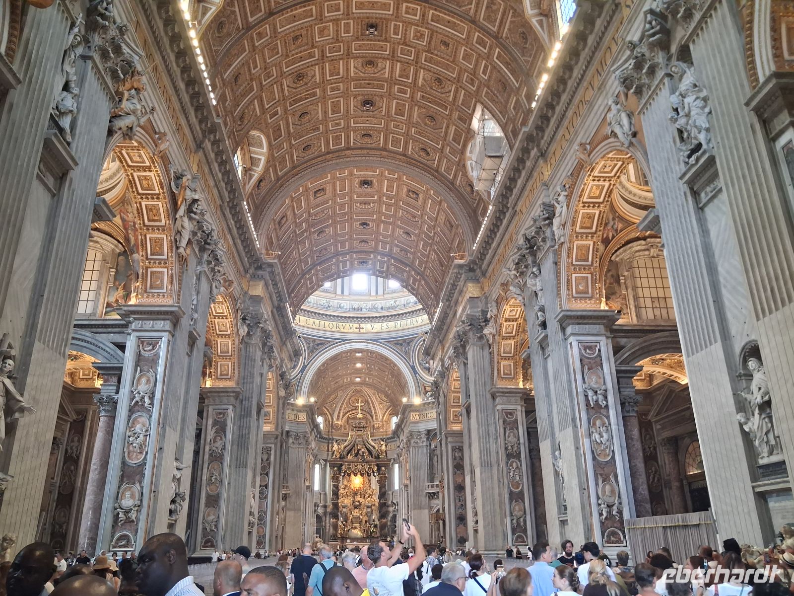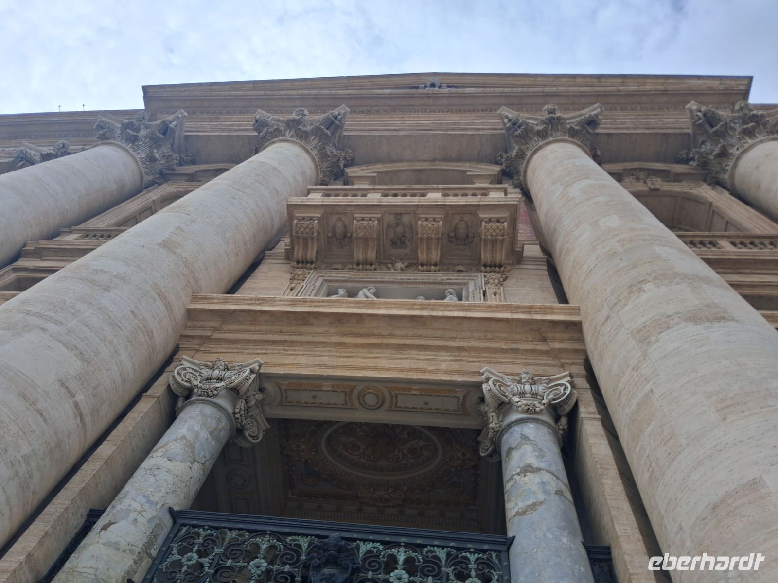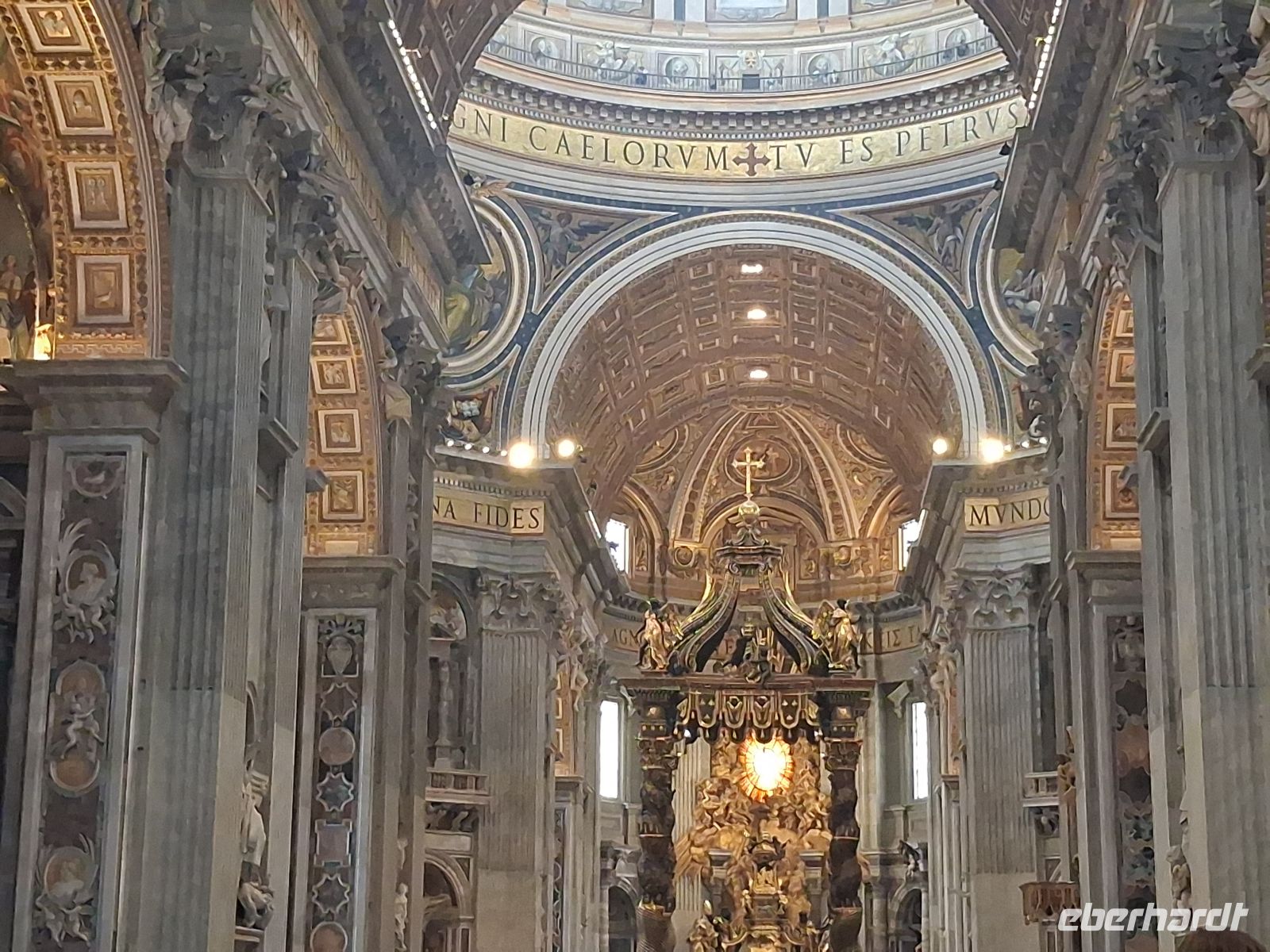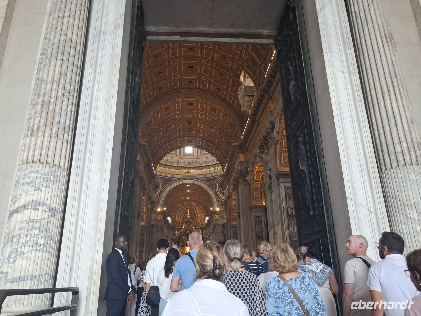 Schon beim Betreten des Petersdoms (eigentlich Peterskirche) spüren wir die überwältigende Größe und Pracht dieses Ortes. Die hohe Kuppel, die von Michelangelo entworfen wurde, zieht alle Blicke nach oben. Unsere Reiseführerin erzählt uns von der Dimension und Bedeutung der wichtigsten Kunstwerke. Ein Vorhang verdeckt zunächst den Bereich hinter der noch bis zum 6. Januar 2026 geöffneten Heiligen Tür, denn dieser Weg ist für die Pilger reserviert. Im Januar wird die Rückseite wieder zugemauert. Nach der Führung zum Baldachin und zu einzelnen herausragenden Kunstwerken haben wir Gelegenheit, durch die Heilige Tür zu treten und die Pietà von Michelangelo zu bestaunen, die er mit nur 23 Jahren aus einem einzigen Marmorstein erschaffen hat.