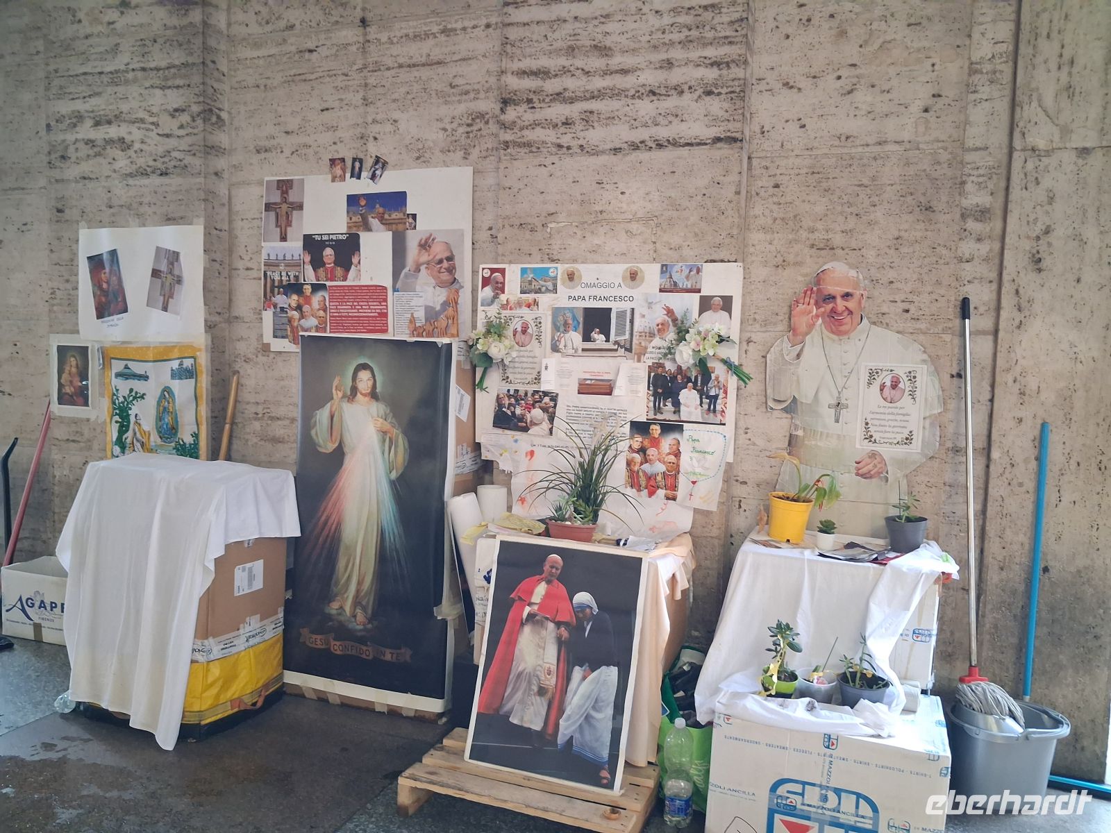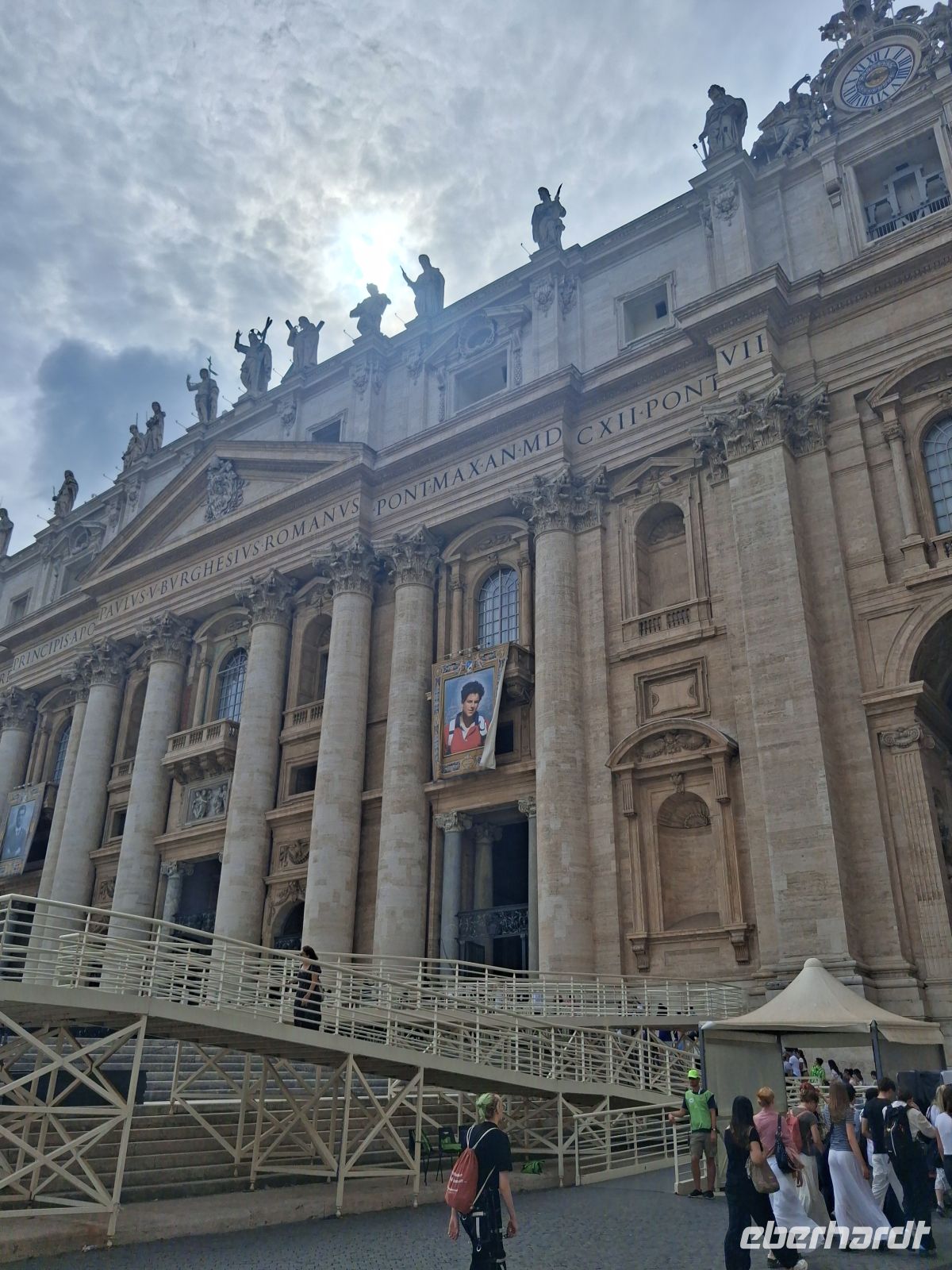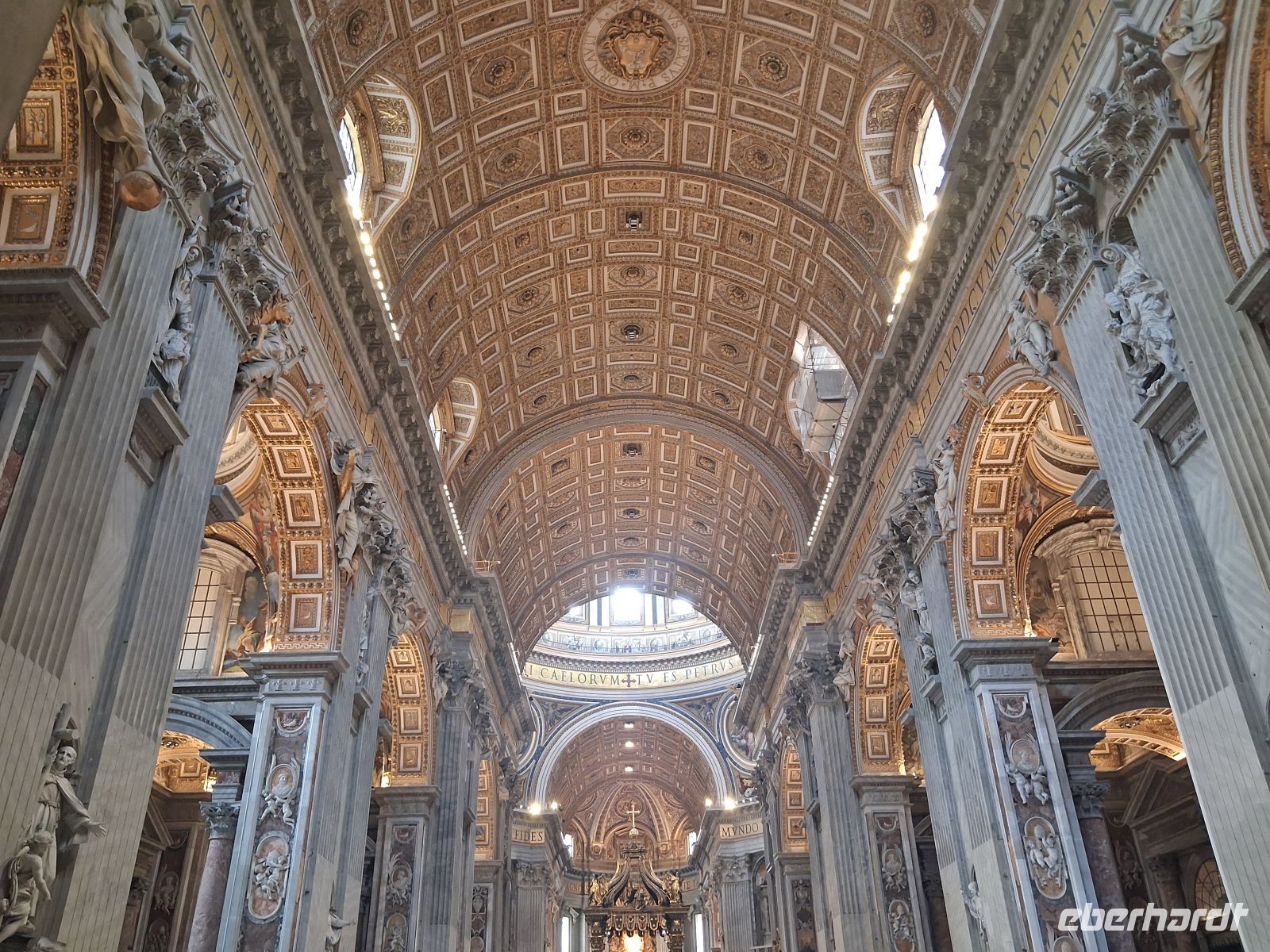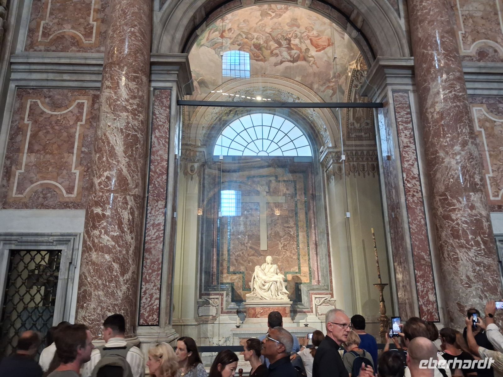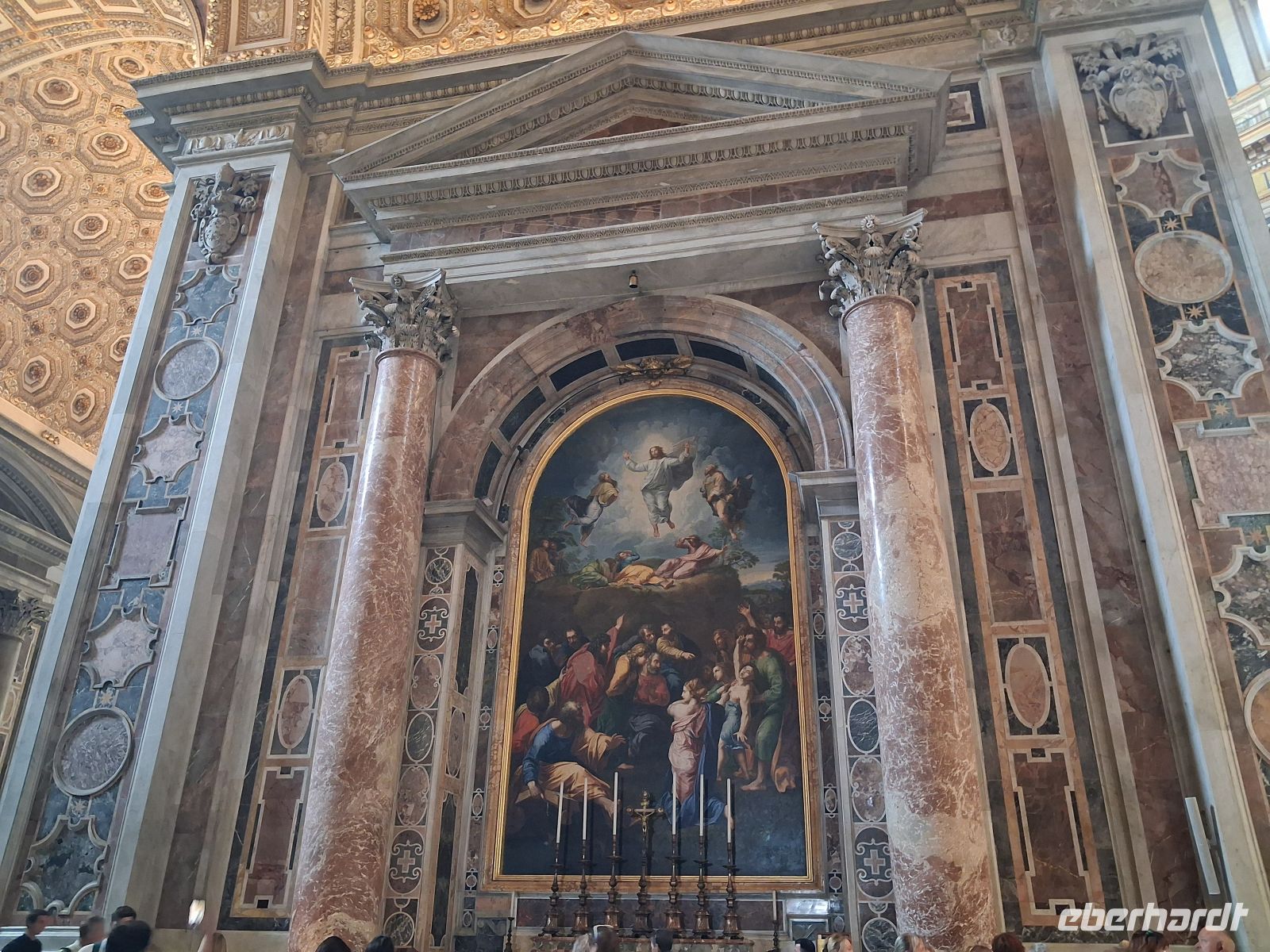 Schon beim Betreten des Petersdoms (eigentlich Peterskirche) spüren wir die überwältigende Größe und Pracht dieses Ortes. Die hohe Kuppel, die von Michelangelo entworfen wurde, zieht alle Blicke nach oben. Unsere Reiseführerin erzählt uns von der Dimension und Bedeutung der wichtigsten Kunstwerke. Ein Vorhang verdeckt zunächst den Bereich hinter der noch bis zum 6. Januar 2026 geöffneten Heiligen Tür, denn dieser Weg ist für die Pilger reserviert. Im Januar wird die Rückseite wieder zugemauert. Nach der Führung zum Baldachin und zu einzelnen herausragenden Kunstwerken haben wir Gelegenheit, durch die Heilige Tür zu treten und die Pietà von Michelangelo zu bestaunen, die er mit nur 23 Jahren aus einem einzigen Marmorstein erschaffen hat.