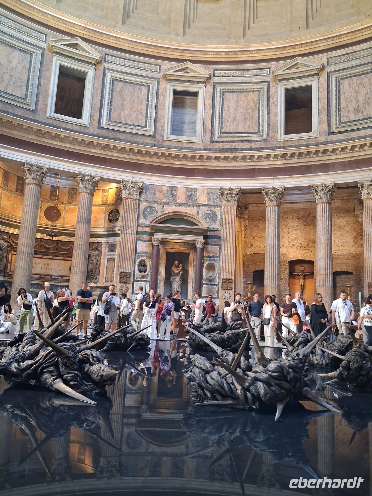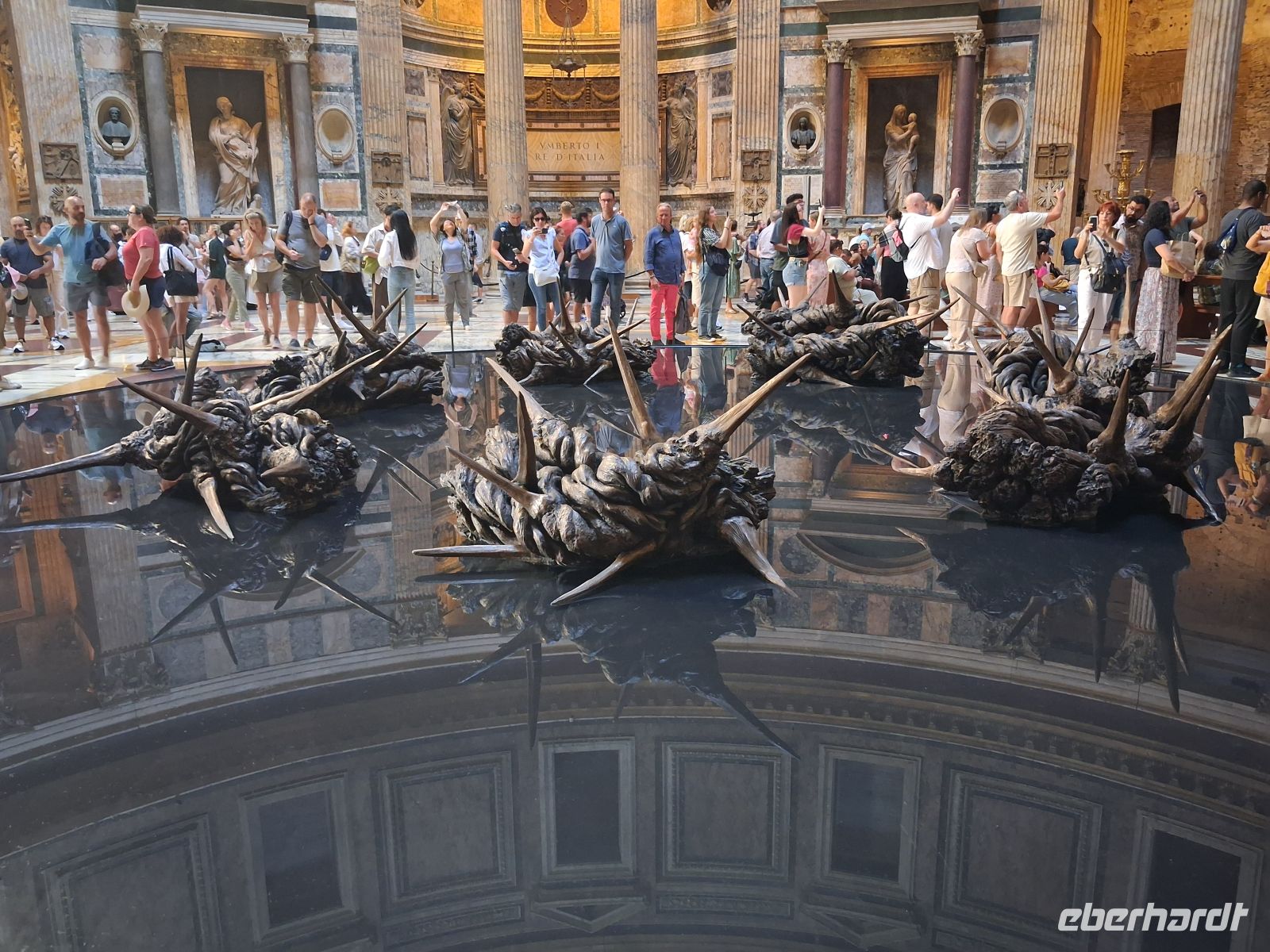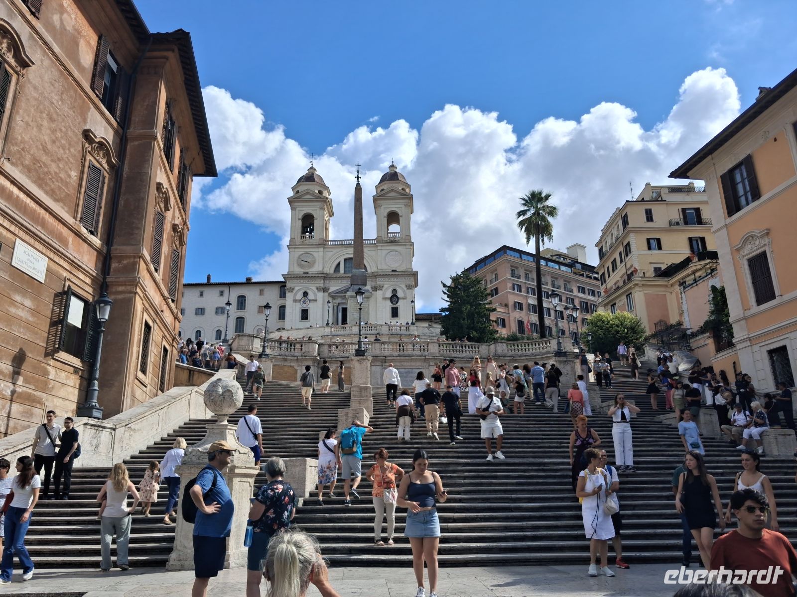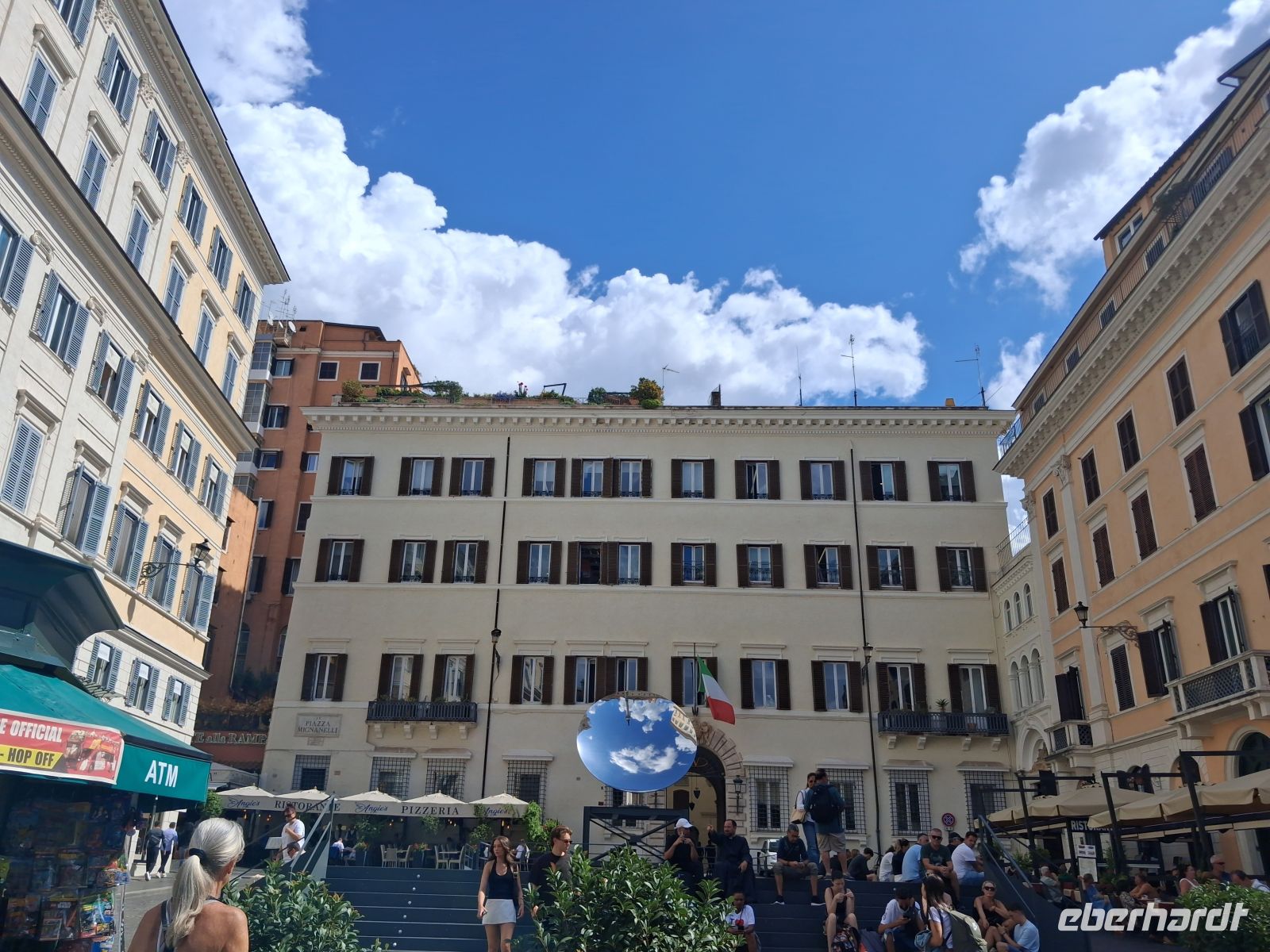 Die Sonne ist zurück. Nach dem Frühstück fahren wir mit der U-Bahn gemeinsam zur Piazza del Popolo, wo wir auf unsere Reiseführerin treffen. Die Piazza del Popolo ist einer der größten Plätze Roms und beliebter Treffpunkt der Römer. Wir erfahren von Agnieszka welche berühmten Filme hier in den 50- und 60er Jahren gedreht wurden und was sich geschichtlich hier abgespielt hat. Wir gehen die Stufen zum Pincio-Park hinauf und freuen uns auf die herrliche Aussicht. Vorbei an Steineichen, Kaki-Bäumen, Feigenbäumen und Kapernbüschen erreichen wir die Villa Medici auf dem Pincio-Hügel. Unser Spazierweg führt uns bis zur Dreifaltigkeitskirche Trinità dei Monti, die oberhalb der sogenannten Spanischen Treppe liegt - wir sind mitten im Herzen von Rom angelangt. Wir gehen die Treppe langsam hinunter und genießen den Blick nach unten und oben. Wir haben etwas Freizeit, um durch die Via Condotti zu schlendern und den wunderschönen Blick zurück auf die breiten Stufen der Spanischen Treppe zu genießen. Auf unserem Weg zum Trevi-Brunnen erklärt Agnieszka uns weitere Sehenswürdigkeiten. Nach einer Mittagspause erreichen wir ein weiteres Highlight: das Pantheon. Das Pantheon, ein sowieso spektakuläres Bauwerk, beherbergt aktuell auch eine moderne Installation mit dem Titel "Corona Gloriae". Das aus sieben Teilen in der Mitte platzierte Kunstwerk, das eine zerbrochene Dornenkrone darstellt, ist Teil des österreichischen Beitrags zum Heiligen Jahr 2025.