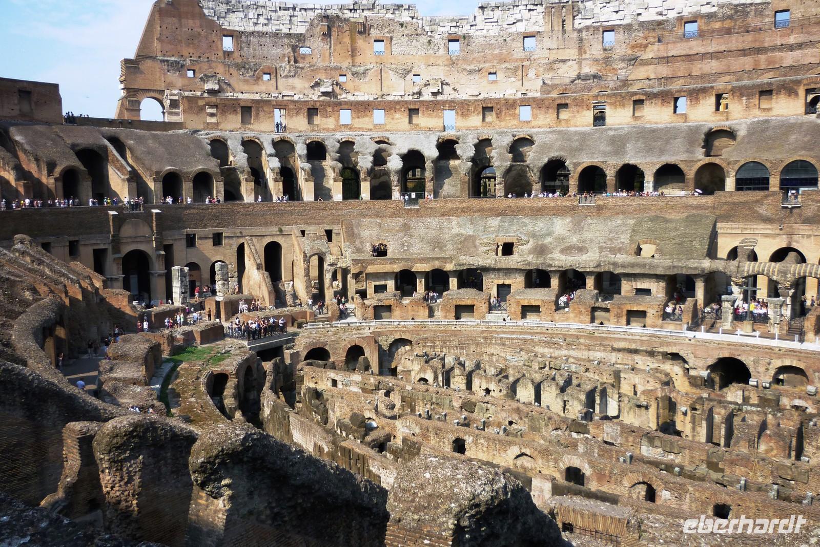 Nach einer Fahrt durch belebte Straßen und Stadtviertel gelangten wir bis zur Piazza Venezia und trafen dort auf unsere Stadtführerin Agnieszka, die uns schon erwartete. Mit ihr stiegen wir auf den Kapitolsplatz und bewunderten, wie alle Besucher zu jeder Zeit, die geniale, in sich schwingende Konzeption dieses Platzes durch Michelangelo. Im Kapitolinischem Museum sahen wir uns die Original-Statue des Mark Aurel sowie andere berühmte Kunstwerke an, darunter auch Porträt-Plastiken aus römischer Zeit. Unser anschließender Besuch führte uns ins Kolosseum, der Kampf-Spielstätte aus der Zeit 80 n. Chr. Dieser gigantische Bau liegt heute wie ein fast restlos ausgenommener Körper vor uns, man kann aber noch die ursprünglichen Funktionen der Gemäuer und düsteren Gänge erahnen. Trotzdem ist es nahezu unglaublich, dass menschliche Schöpferkraft schon vor 2000 Jahren imstande war, solche Bauwerke hervorzubringen. Vor allem das ausgeklügelte Treppen- und Gangsystem, das den Zuschauer schnell an seinen bestimmten Platz brachte (bei ca. 50.000 Besuchern), verursacht auch heute noch großes Grübeln. Viel Neues ist bei dieser Art von Architektur in den letzten Jahrhunderten nicht hinzugekommen, dieses Monument wird ein ewiger Topos sein.