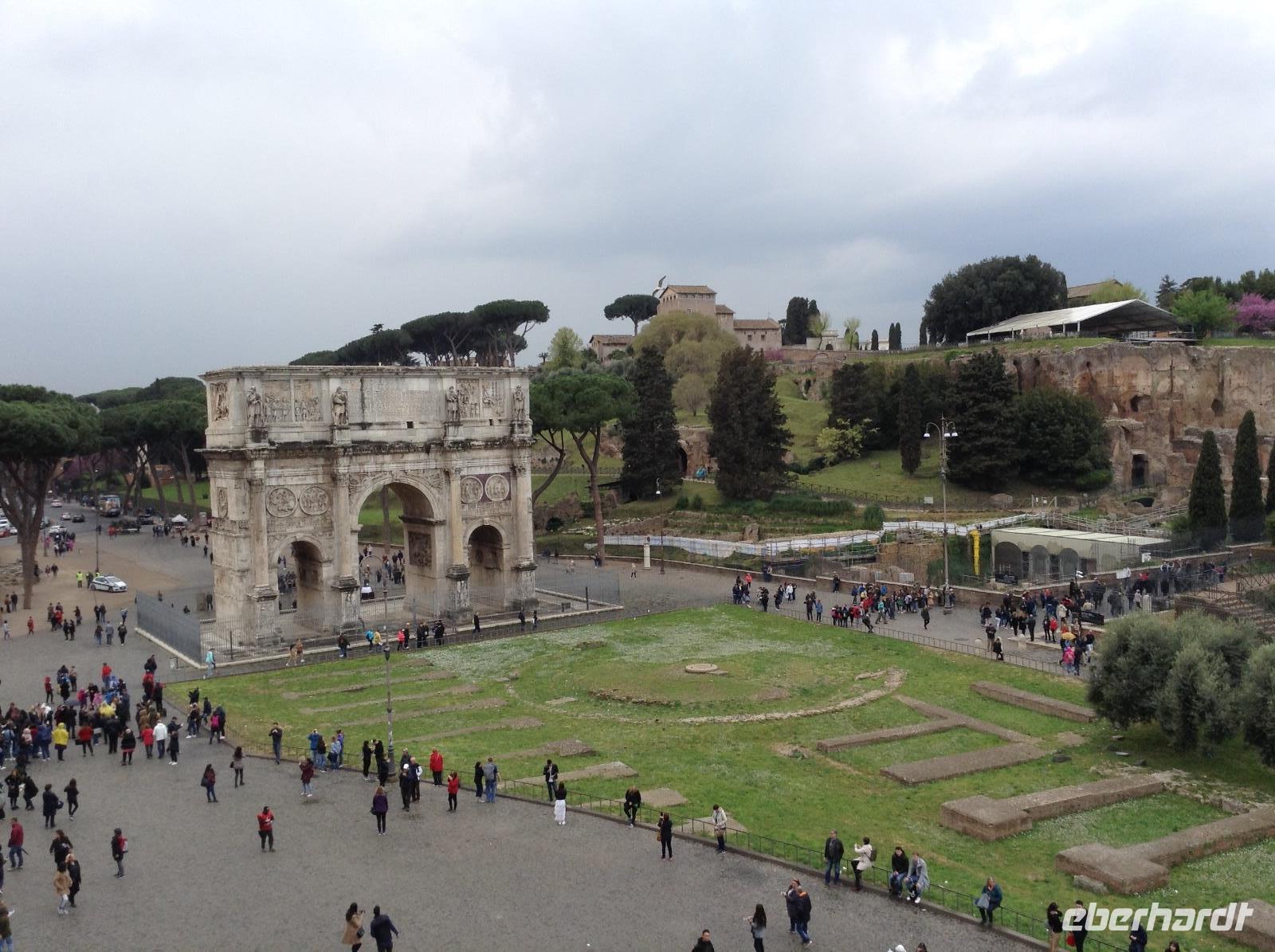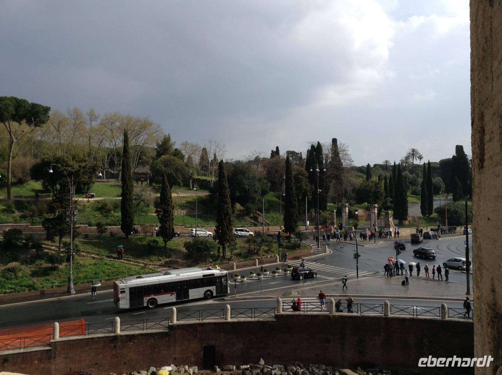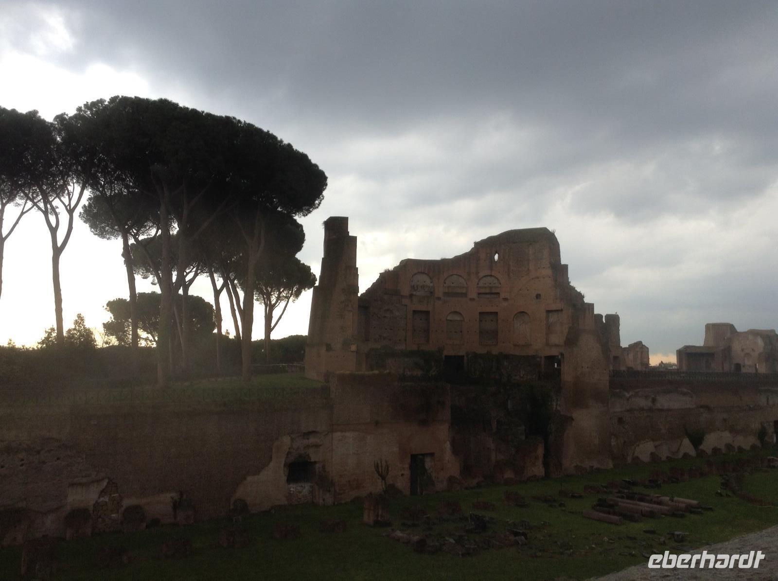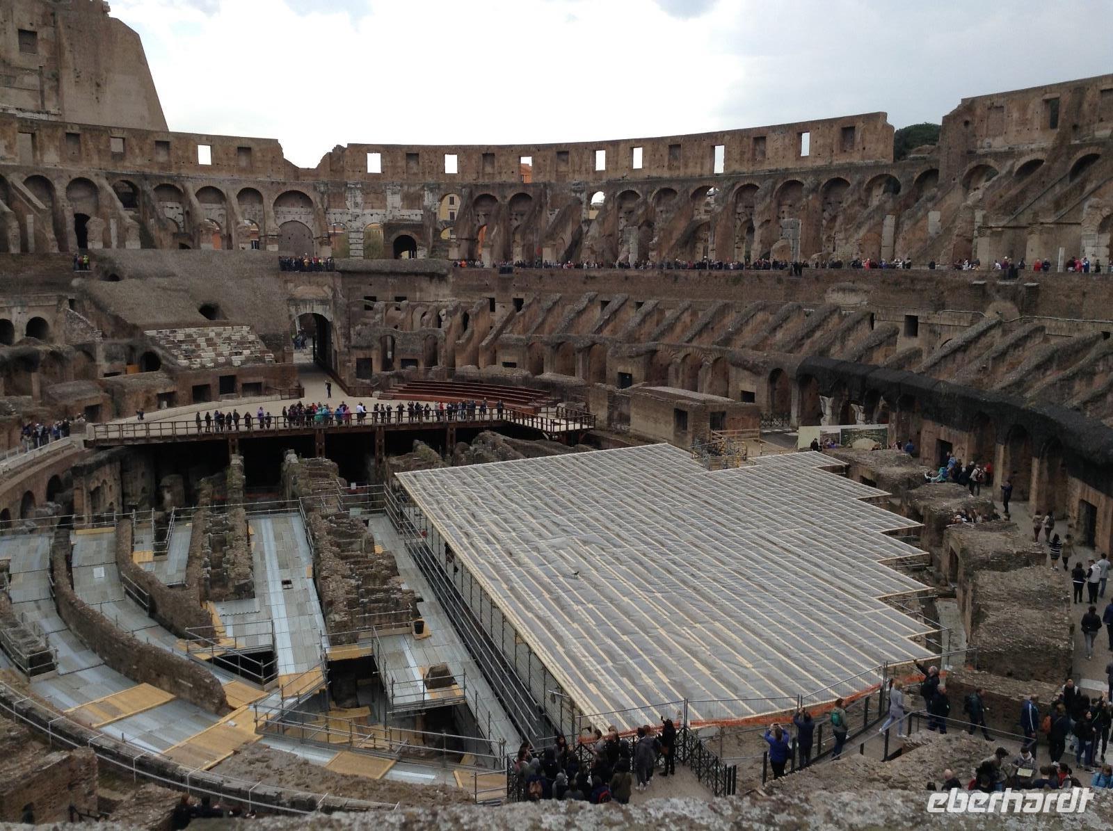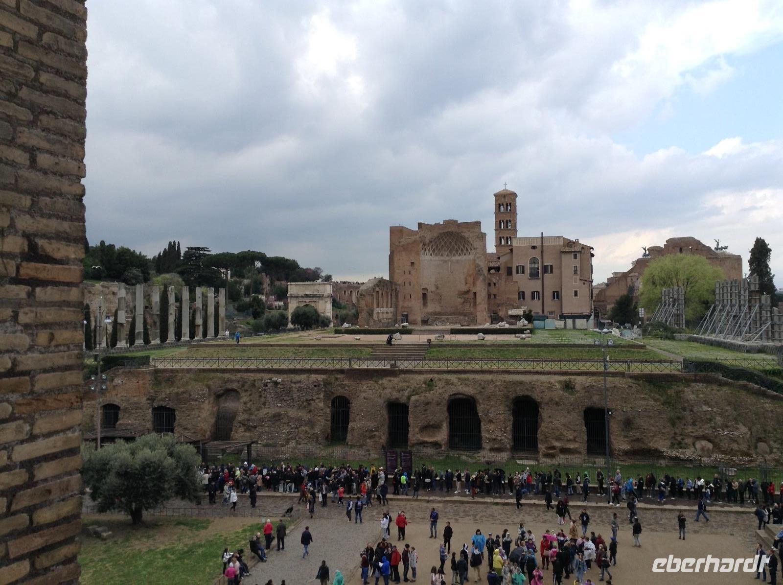 Die Ausflugsprogramme der einzelnen Gruppen waren für die nächsten Tage inhaltlich gleich, nur zeitlich versetzt. Mit meiner Gruppe 3 ging es am Morgen ein erstes Mal gemeinsam zur Metro, die Station Laurentina war ganz in der Nähe des Hotels und damit ein guter Ausgangspunkt für alle Unternehmungen. Wir fuhren bis zur Station Colosseum, stiegen dort aus und wurden von unserem Rom-Stadtführer Norbert herzlich empfangen. Nach ersten wunderbaren Fotos von der Aussenansicht der alten Arena stand dann die Innenbesichtigung als erstes auf dem Plan. Eine erste Sicherheitskontrolle erfolgte, dann konnten wir das gigantische alte Bauwerk betreten und gemeinsam besichtigen. Wir waren überwältigt von diesen Eindrücken und von der Größe. Vom oberen Stockwerk aus hatten wir einen tollen Ausblick hinüber zum Palatinhügel und dem Forum Romanum. Genau dorthin ging es im Anschluß.Wir stiegen den Palatin-Hügel (einer der 7 Hügel von Rom) hinauf und spazierten entlang der Reste des alten Kaiserpalastes, bevor wir auf einer tollen Aussichtsplattform eine wunderschöne Aussicht auf das Forum Romanum und in Richtung Kapitols-Hügel mit dem Rathaus und dem Nationaldenkmal hatten. Wir waren fasziniert, auch wenn es inzwischen ab und zu regnete. Anschließend ging es die Treppe hinab ins Forum Romanum und wir standen mitten zwischen alten Tempelanlagen auf dem einstigen Hauptplatz des alten Roms.