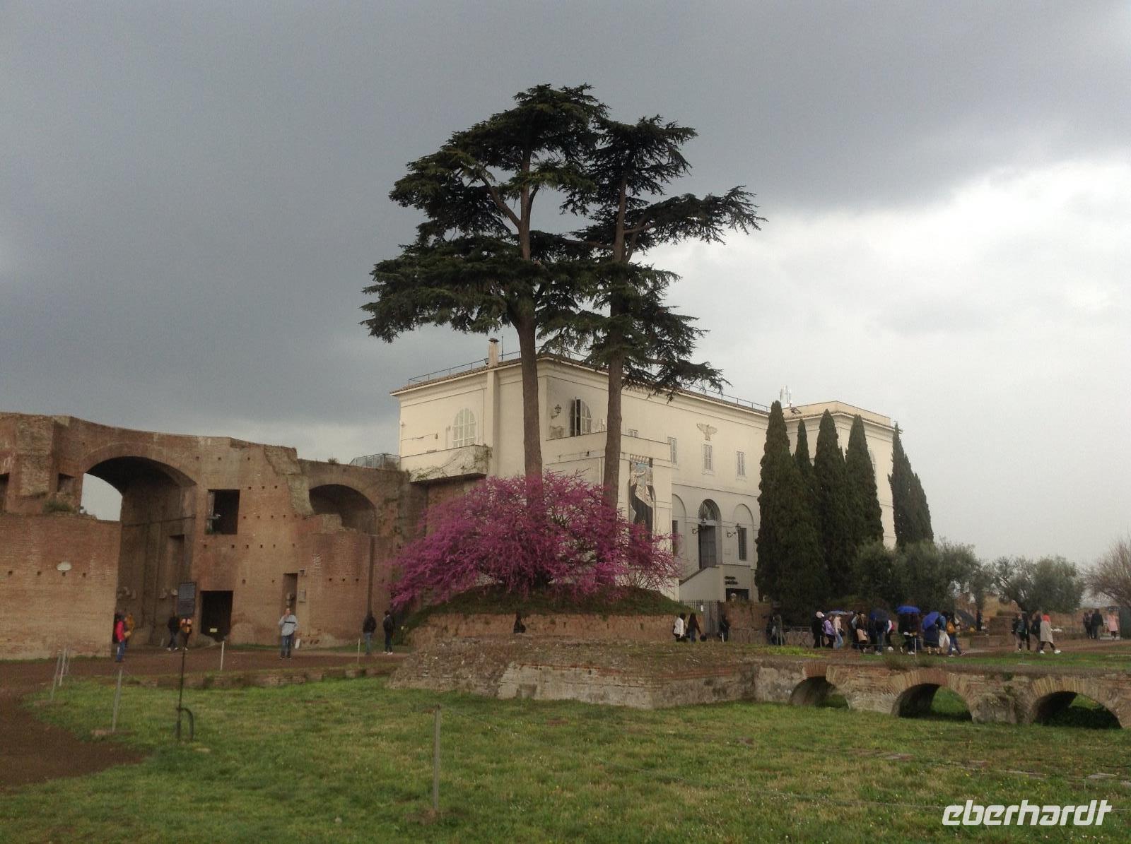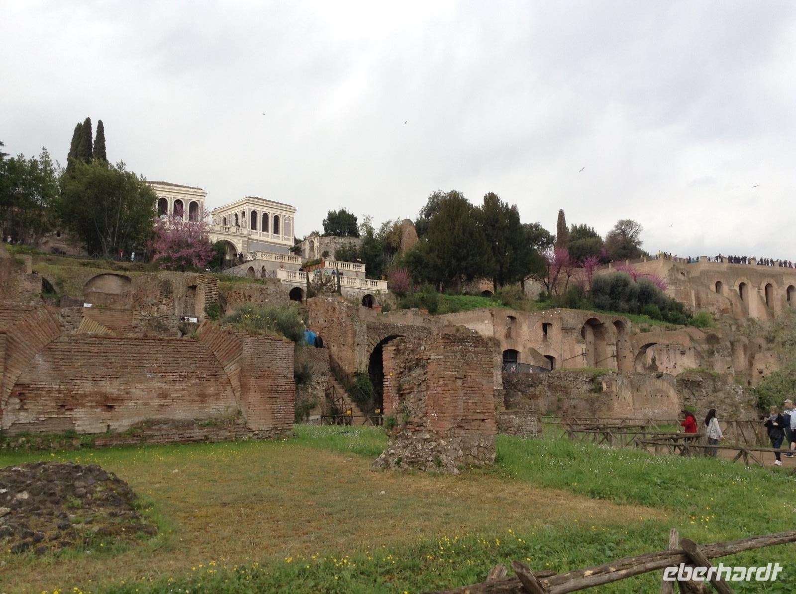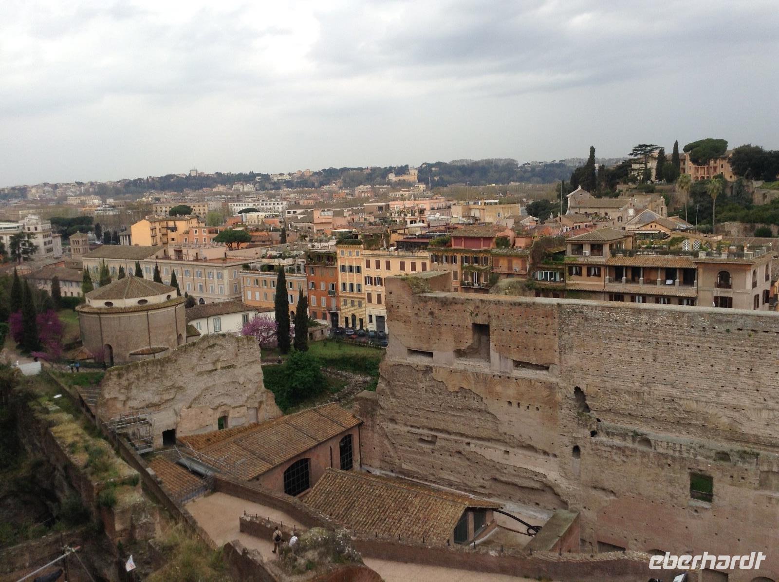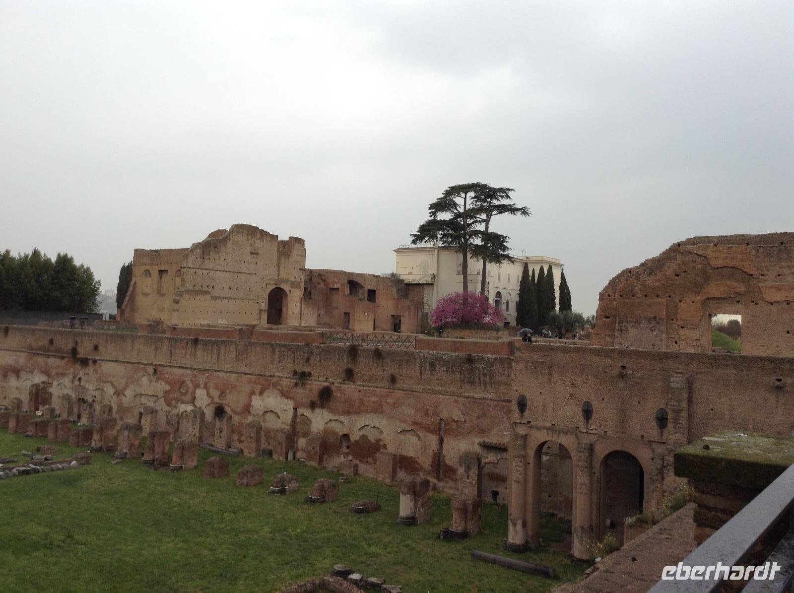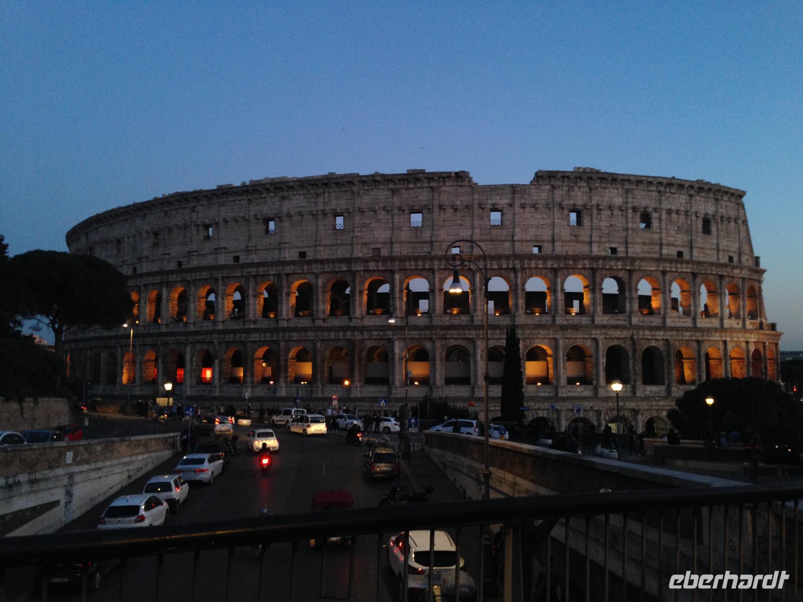 Die Ausflugsprogramme der einzelnen Gruppen waren für die nächsten Tage inhaltlich gleich, nur zeitlich versetzt. Mit meiner Gruppe 3 ging es am Morgen ein erstes Mal gemeinsam zur Metro, die Station Laurentina war ganz in der Nähe des Hotels und damit ein guter Ausgangspunkt für alle Unternehmungen. Wir fuhren bis zur Station Colosseum, stiegen dort aus und wurden von unserem Rom-Stadtführer Norbert herzlich empfangen. Nach ersten wunderbaren Fotos von der Aussenansicht der alten Arena stand dann die Innenbesichtigung als erstes auf dem Plan. Eine erste Sicherheitskontrolle erfolgte, dann konnten wir das gigantische alte Bauwerk betreten und gemeinsam besichtigen. Wir waren überwältigt von diesen Eindrücken und von der Größe. Vom oberen Stockwerk aus hatten wir einen tollen Ausblick hinüber zum Palatinhügel und dem Forum Romanum. Genau dorthin ging es im Anschluß.Wir stiegen den Palatin-Hügel (einer der 7 Hügel von Rom) hinauf und spazierten entlang der Reste des alten Kaiserpalastes, bevor wir auf einer tollen Aussichtsplattform eine wunderschöne Aussicht auf das Forum Romanum und in Richtung Kapitols-Hügel mit dem Rathaus und dem Nationaldenkmal hatten. Wir waren fasziniert, auch wenn es inzwischen ab und zu regnete. Anschließend ging es die Treppe hinab ins Forum Romanum und wir standen mitten zwischen alten Tempelanlagen auf dem einstigen Hauptplatz des alten Roms.