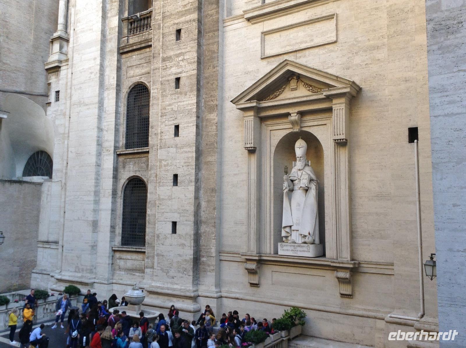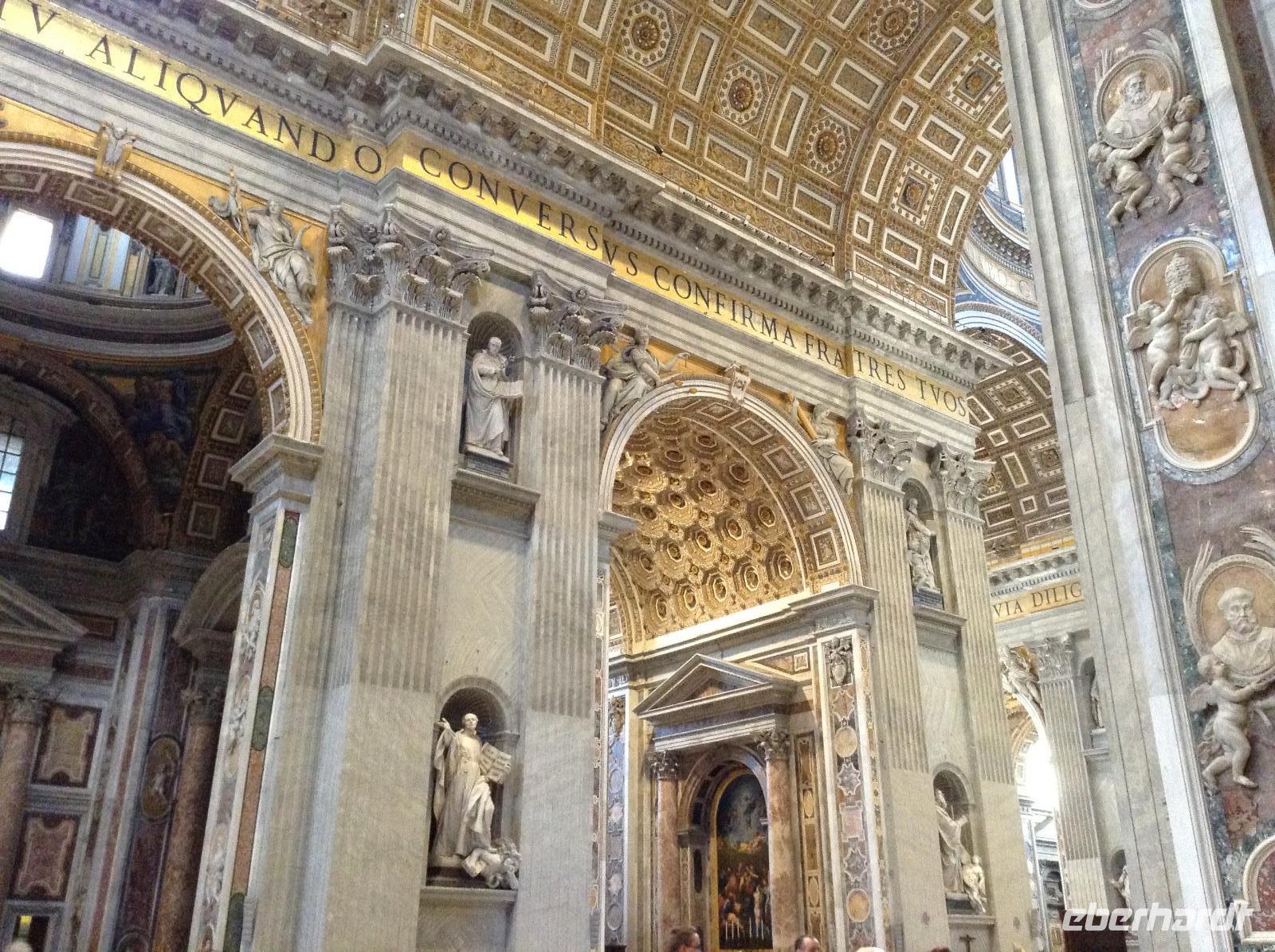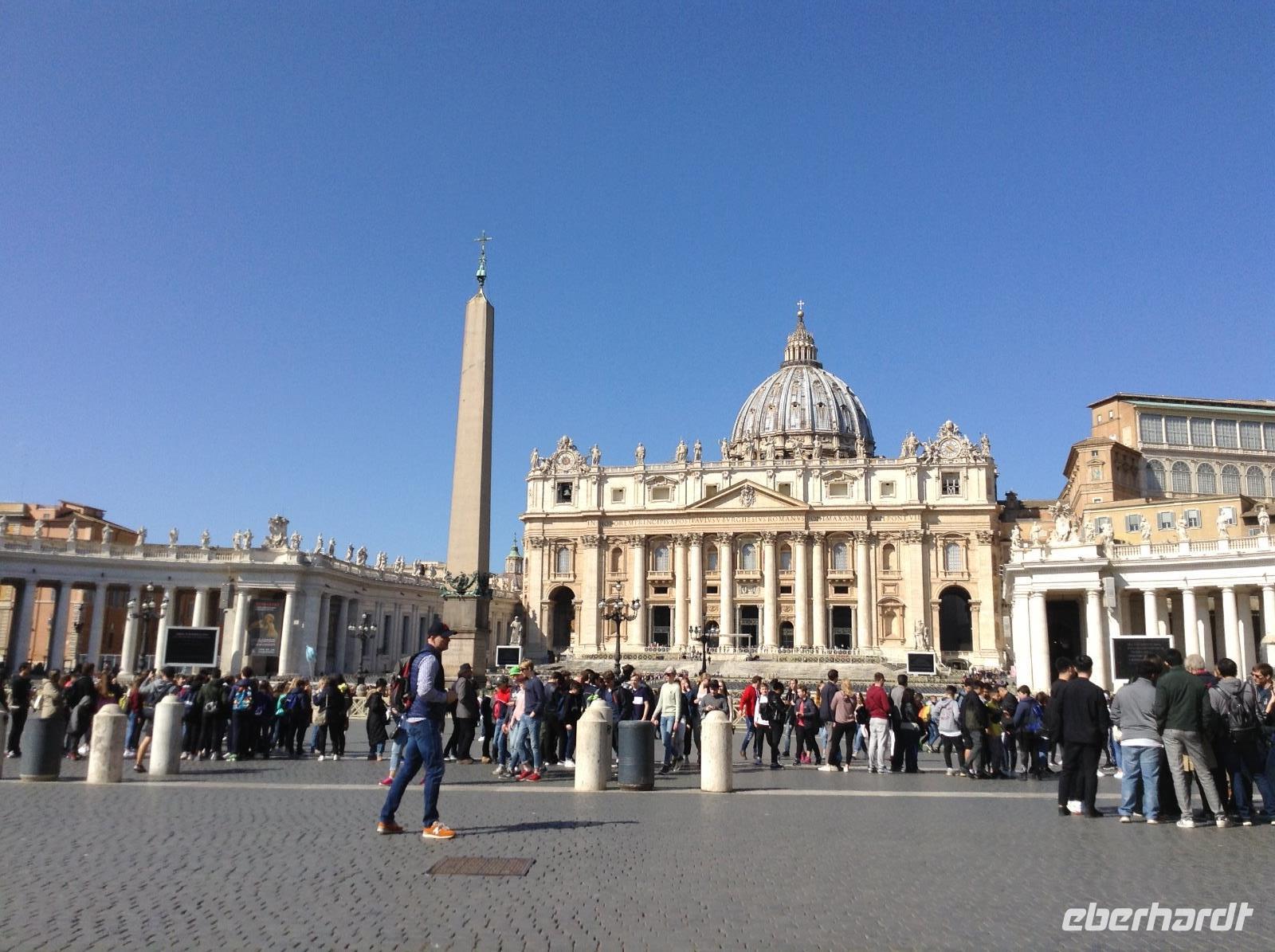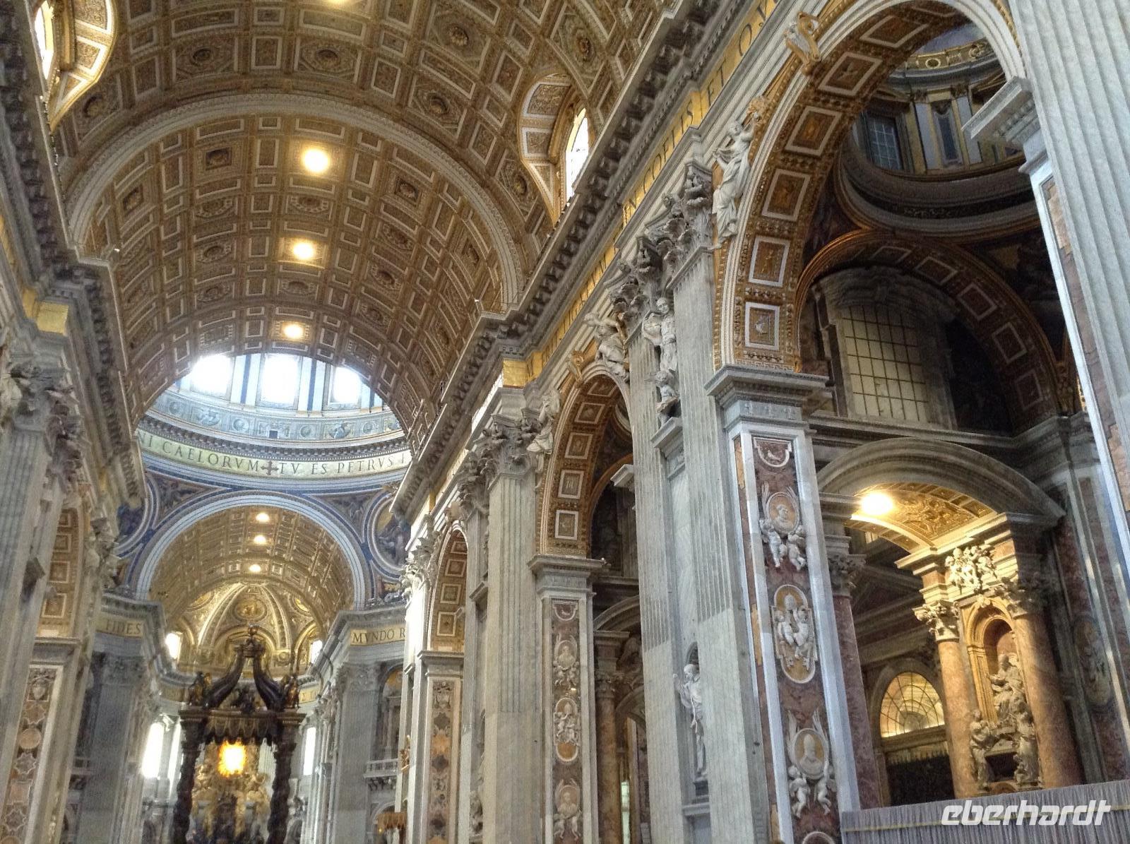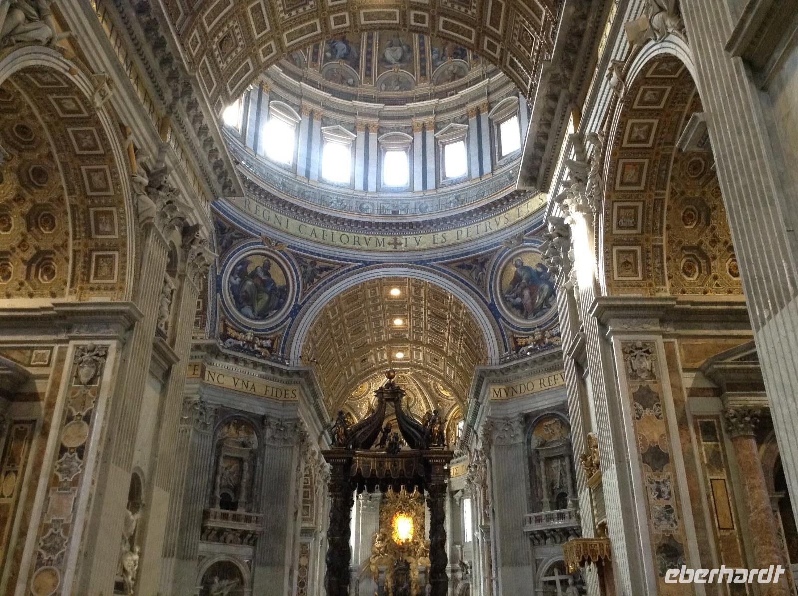 Zunächst waren wir tief beeindruckt von der Größe dieser tollen Basilika, für die einst Papst Julius II. 1506 den Grundstein legte. Die mit 187 m längste Basilika der Welt hat 11 Kapellen, 45 Altäre, zwei 76 m lange Querschiffe, eine riesige Kuppel und zahlreiche Kunstwerke. Wir wußten nicht, wo wir zuerst hinschauen sollten. Norbert zeigte und erklärte uns die wichtigsten Dinge, es war kaum alles zu erfassen. Im Dom endete dann auch unsere heutige Führung und jeder konnte individuell nacharbeiten, wozu er Lust hatte. Einige Gäste wagten hinterher den Gang auf die Kuppel und wurden bei blauem Himmel und Sonnenschein mit einem fantastischen Ausblick belohnt.