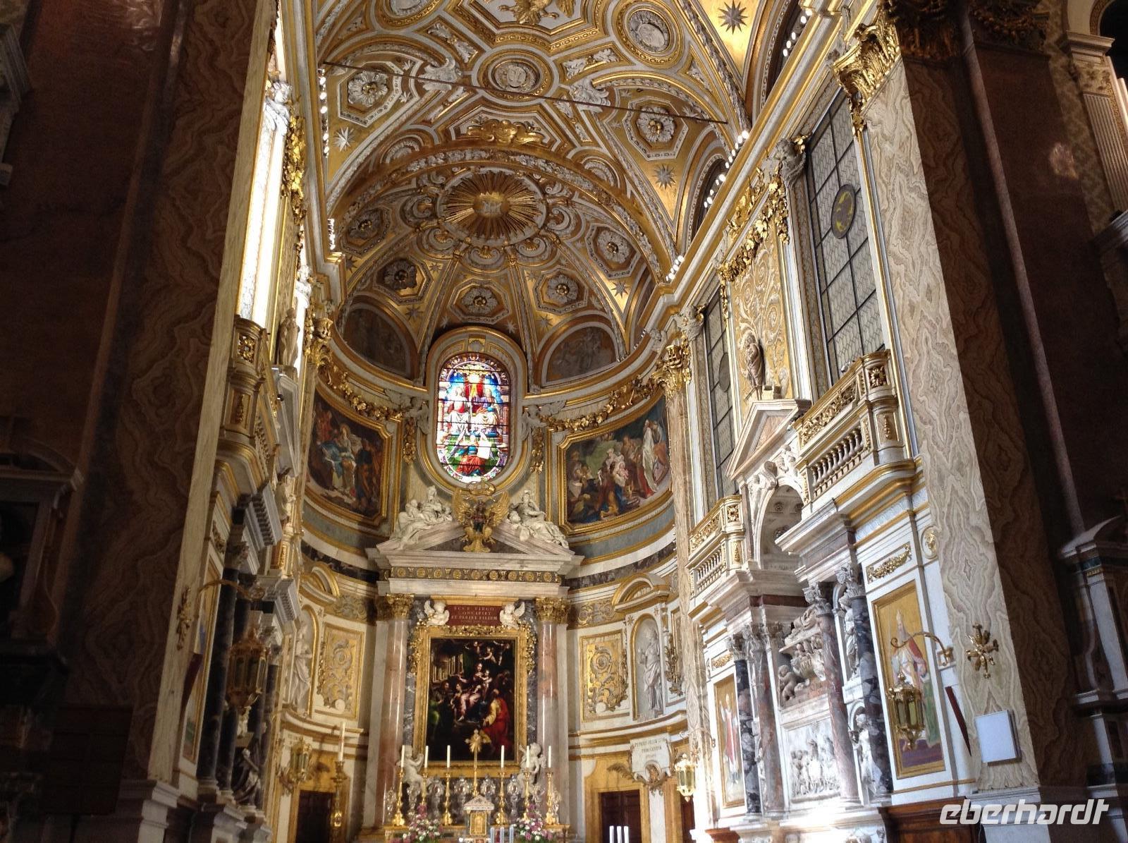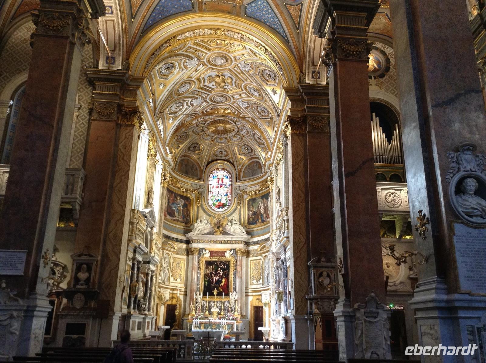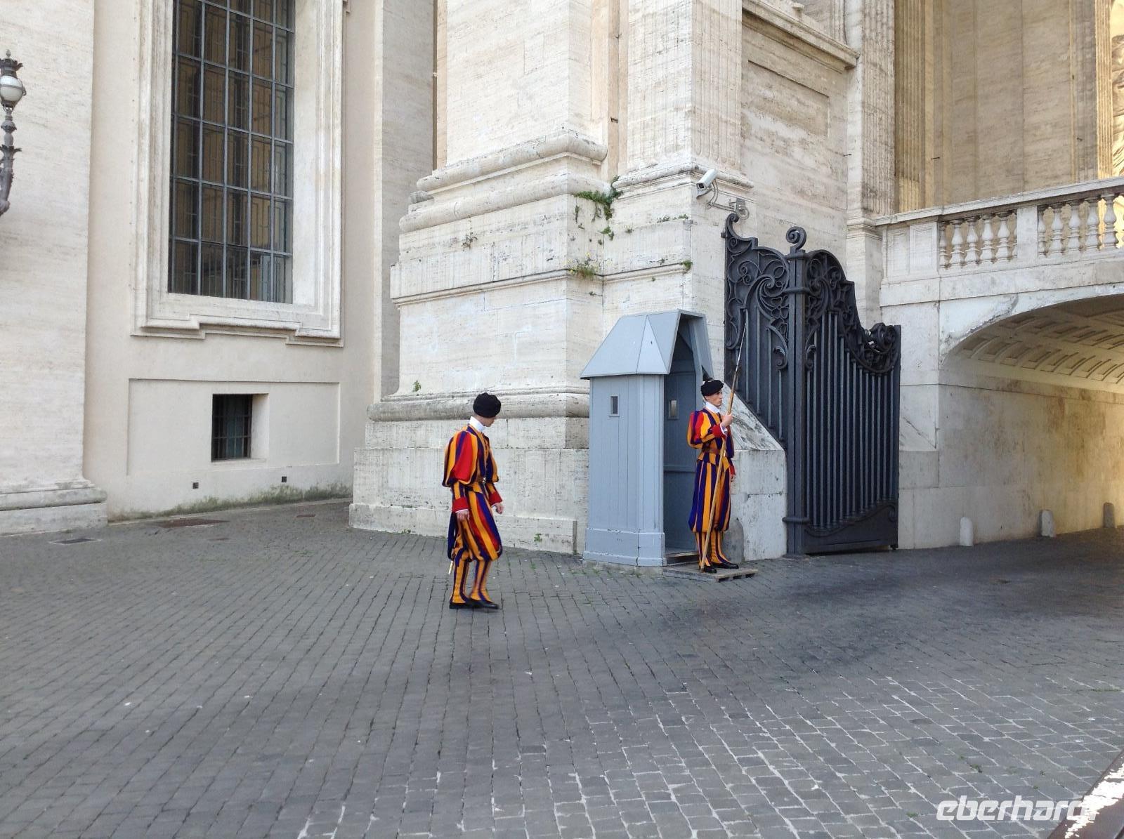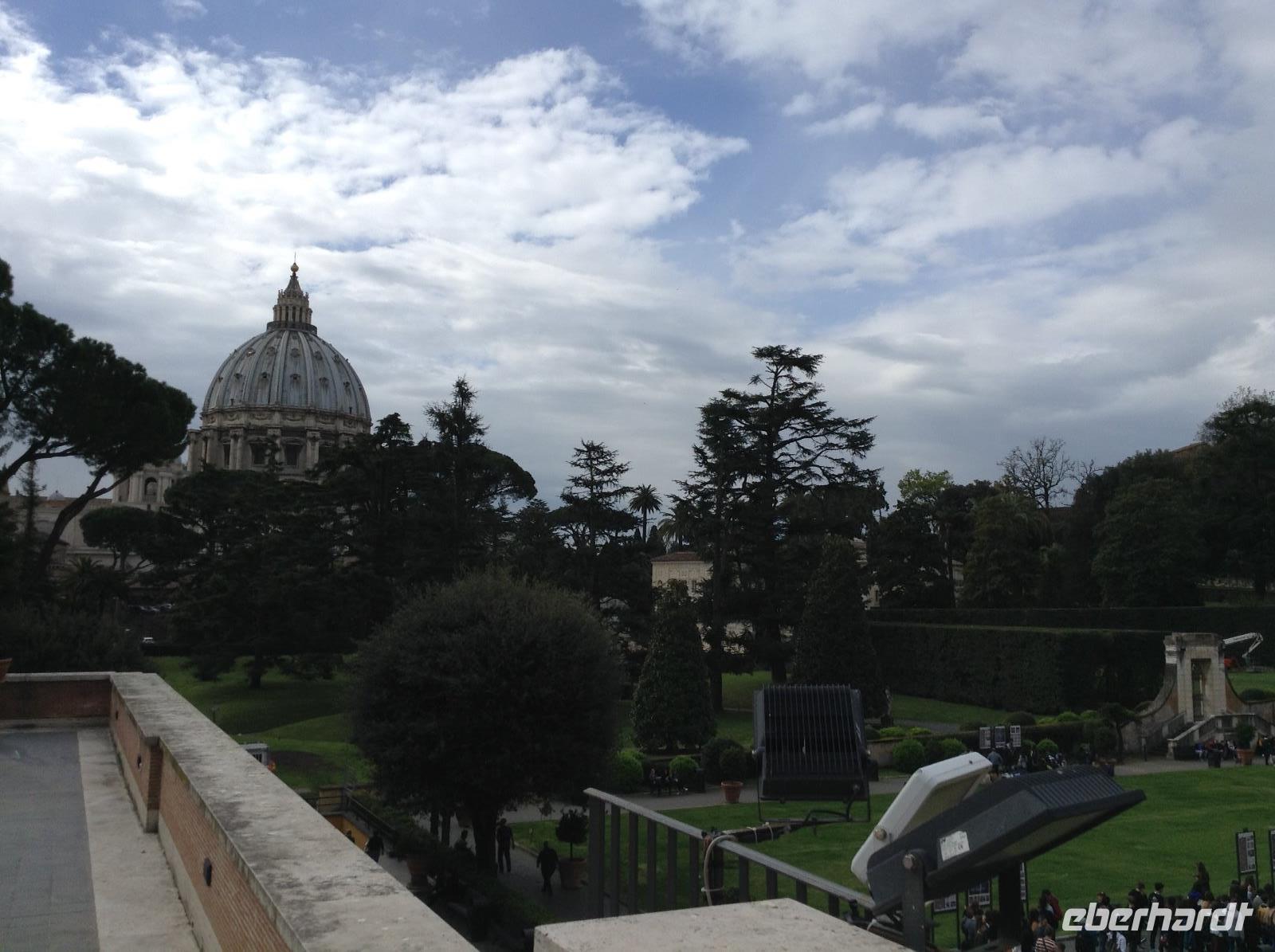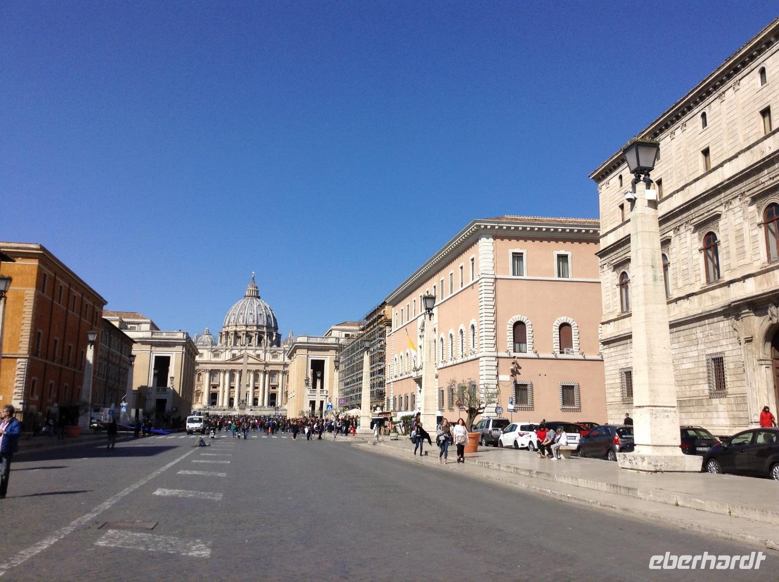 Zunächst waren wir tief beeindruckt von der Größe dieser tollen Basilika, für die einst Papst Julius II. 1506 den Grundstein legte. Die mit 187 m längste Basilika der Welt hat 11 Kapellen, 45 Altäre, zwei 76 m lange Querschiffe, eine riesige Kuppel und zahlreiche Kunstwerke. Wir wußten nicht, wo wir zuerst hinschauen sollten. Norbert zeigte und erklärte uns die wichtigsten Dinge, es war kaum alles zu erfassen. Im Dom endete dann auch unsere heutige Führung und jeder konnte individuell nacharbeiten, wozu er Lust hatte. Einige Gäste wagten hinterher den Gang auf die Kuppel und wurden bei blauem Himmel und Sonnenschein mit einem fantastischen Ausblick belohnt.