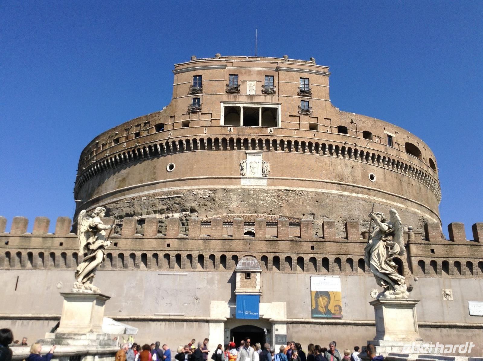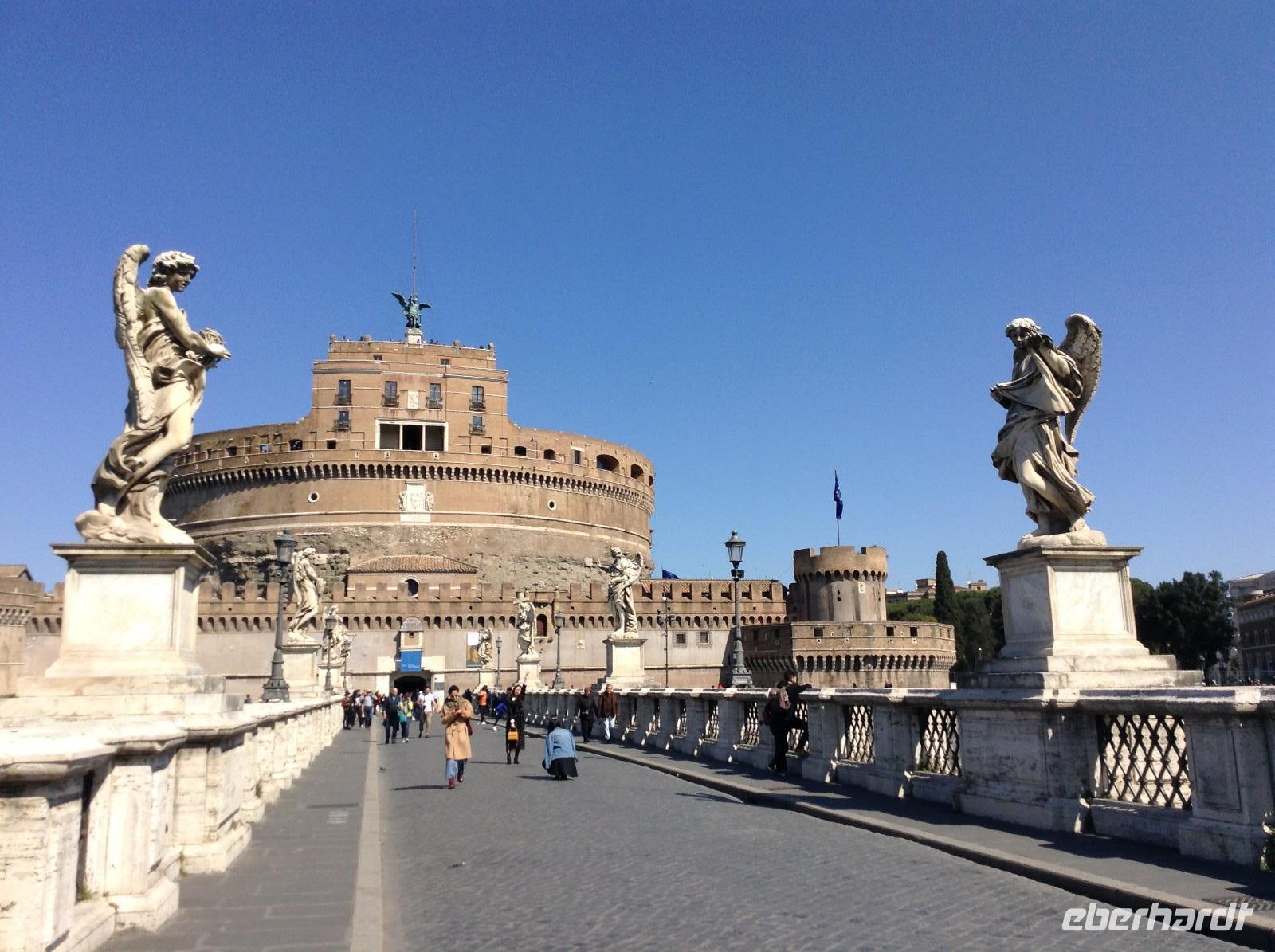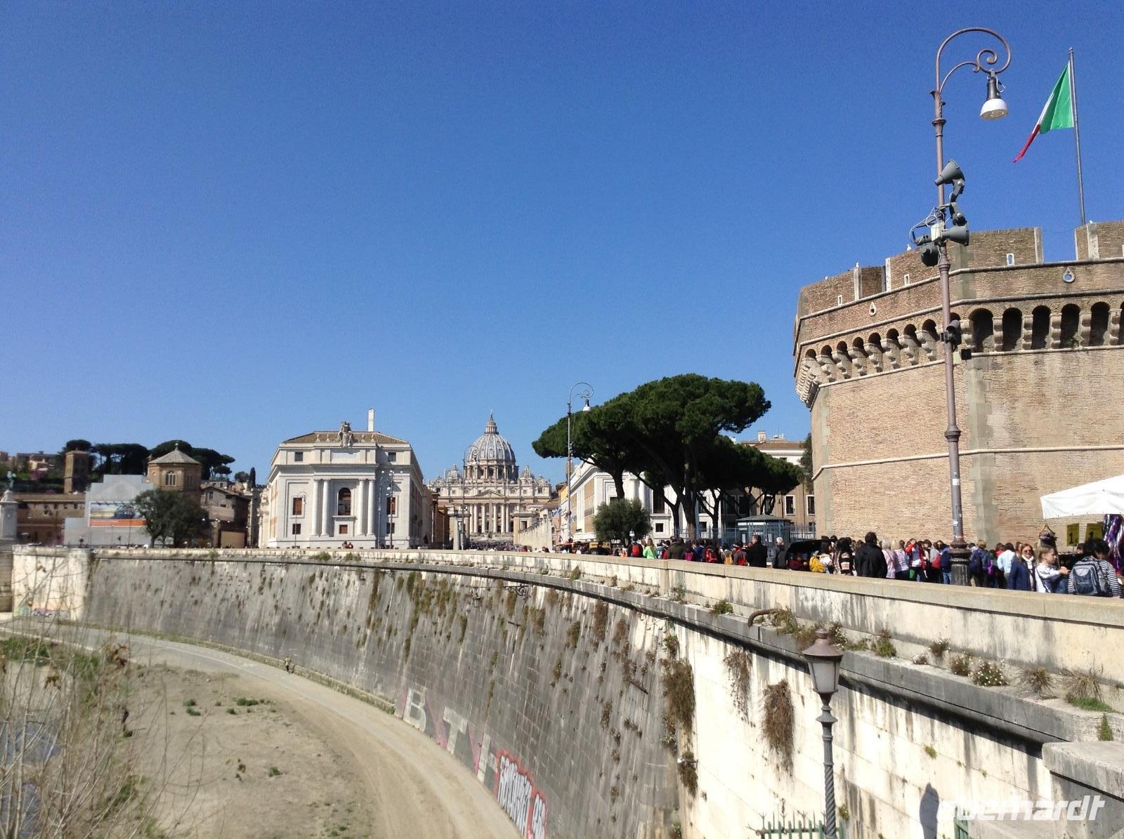 Noch einmal fuhren wir mit der Metro bis zur Station Ottaviano, dort empfing uns Norbert zum letzten gemeinsamen Besichtigungstag. Wir spazierten in Richtung Petersplatz und sahen uns von da aus den Dom und den prächtigen Platz an, den Bernini im 17. Jahrhundert erschuf. Von da aus bummelten wir die Via della Cinciliazione in Richtung Tiber und kamen dabei an einem Filmset vorbei, es wurde gerade ein neuer Filmdreh vorbereitet. An der Engelsburg angekommen, konnten wir gut die Mauern des alten geheimen Verbindungsweges zwischen Petersdom und Engelsburg sehen. Vor der Engelsburg spielten Strassenmusiker und wir lauschten einwenig. Die Engelsburg, ein faszinierender Bau, den Kaiser Hadrian einst im Jahr 139 als Mausoleum bauen liess, diente später Verteidigungszwecken, als Gefängnis und auch zu kaiserlichen Wohnzwecken. Wir betrachteten das Eingangsportal und schlenderten gemeinsam weiter über die Engelsbrücke in Richtung Altstadtgassen. Die Engelsbrücke, die von 10 weißen Marmorengeln von Bernini gesäumt ist, zählt zu den schönsten Brücken Roms.