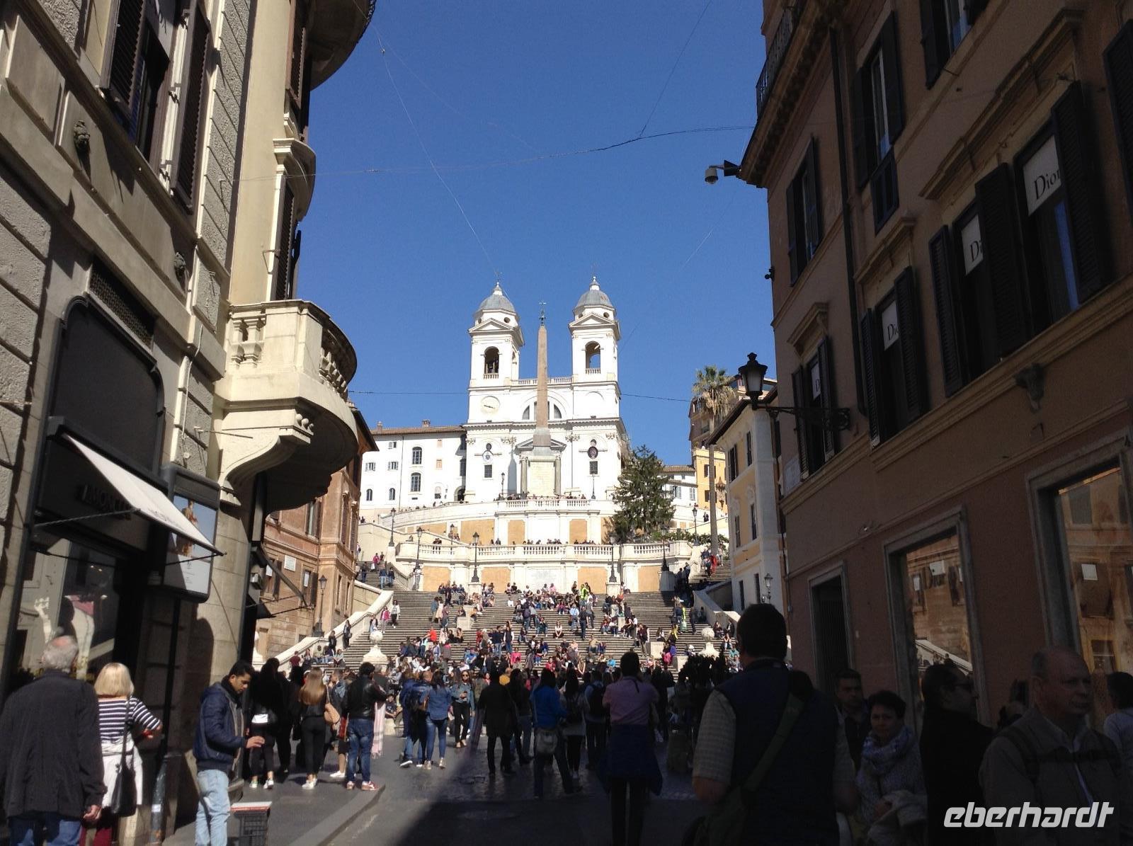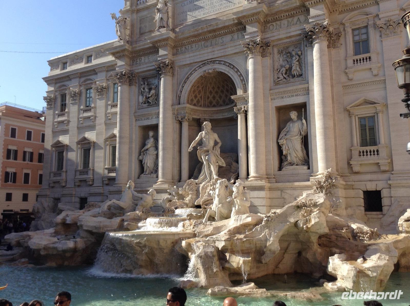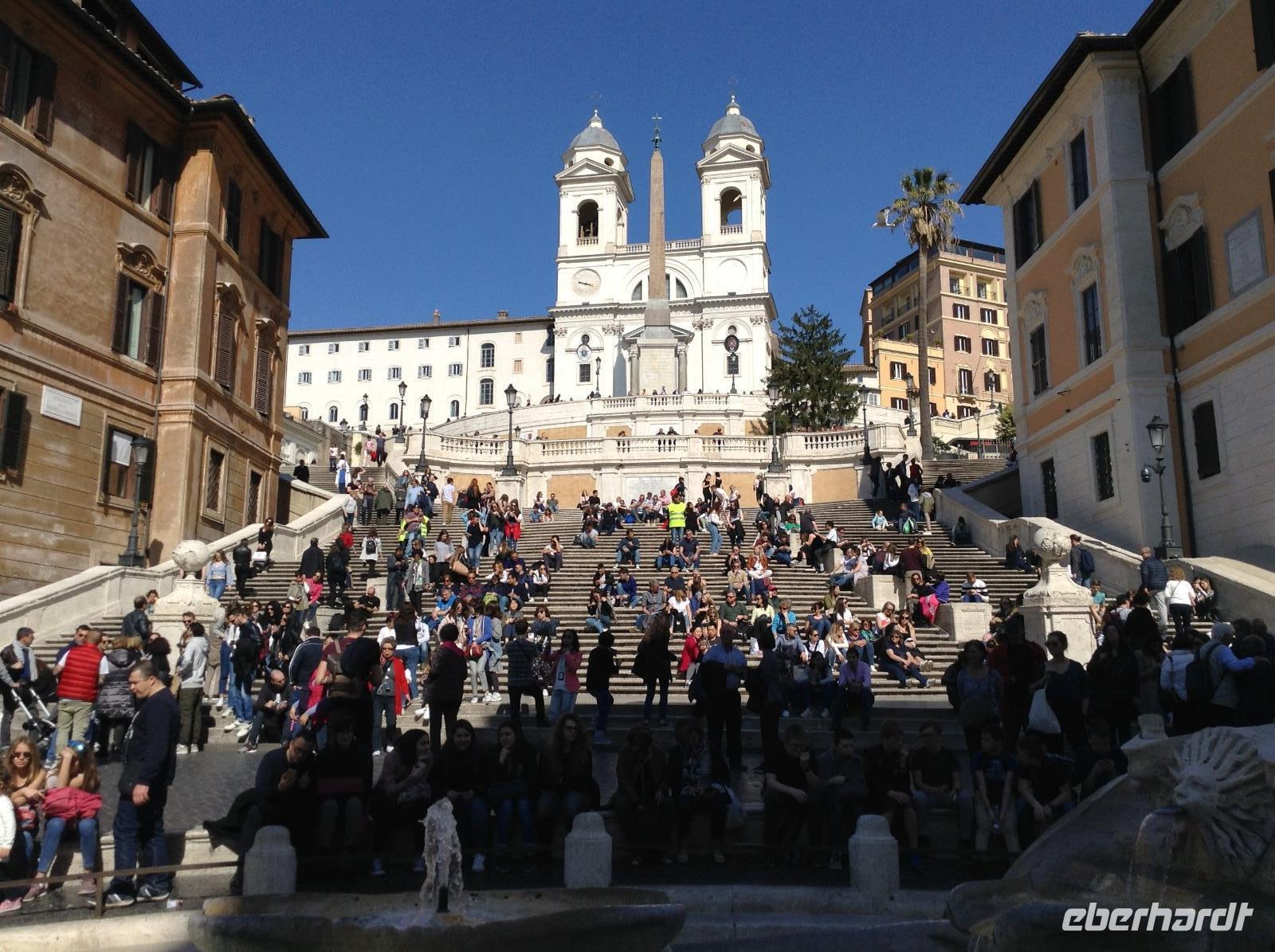 Wir machten Halt in einer der zahlreichen Marien-Kirchen der Stadt, später noch in der Kirche der deutschen Gemeinde. Rom's Kirchen sind wundervoll und bildschön, jede davon ein Museum und toll ausgestattet. Später standen wir auf einem der schönsten Plätz in der Altstadt, Piazza Navona. Unsere Blicke streiften die bunten Häuser ringsum und die beiden üppig gestalteten Brunnen. Weiter ging es zum Pantheon, einem Tempel, den Kaiser Hadrian einst errichten ließ. Im Mittelalter wurde der Bau zur Kirche umgestaltet und ist mit seiner riesigen 43 m hohen Kuppel und der 9 m großen Öffnung etwas ganz besonderes. Zu den besonderen Schätzen zählen auch die Grabmale mehrerer italienischer Könige und das Grab von Raffael. Es war Zeit für die Mittagspause, die wir in den Gassen um das Pantheon verbrachten. Nach dem Mittag standen noch 2 Besichtigungspunkte an: die Spanische Treppe und der Trevibrunnen. Das waren natürlich noch 2 Attraktionen, die jeden Rom-Besucher magisch anziehen, so auch uns. Und ehe wir am Trevibrunnen unsere Führung beendeten, durften wir nicht verpassen, die Münzen über die Schultern in das Wasser zu werfen und damit unser Versprechen abzugeben, hierher wiederzukommen. Es gab noch eine Menge zu sehen in der Stadt und alle Gäste hatten ihre Ideen, den letzten Tag in Rom gebührend ausklingen zu lassen. Es gab einen ganz romantischen Sonnenuntergang an diesem Abend.