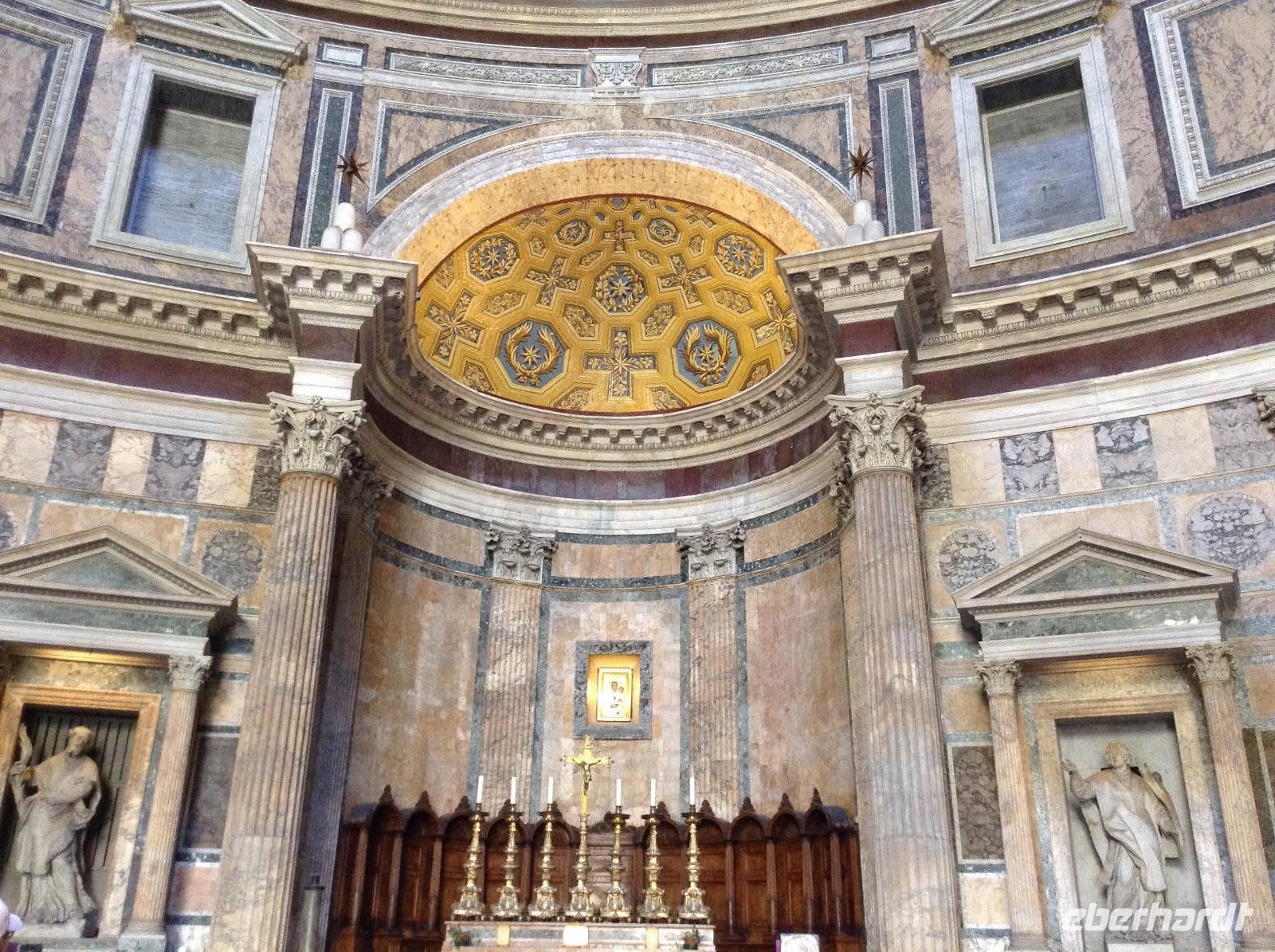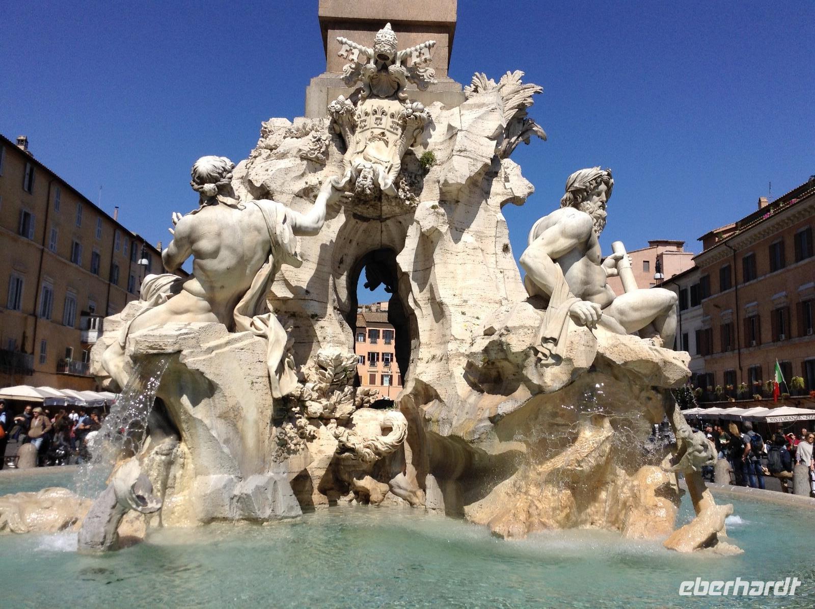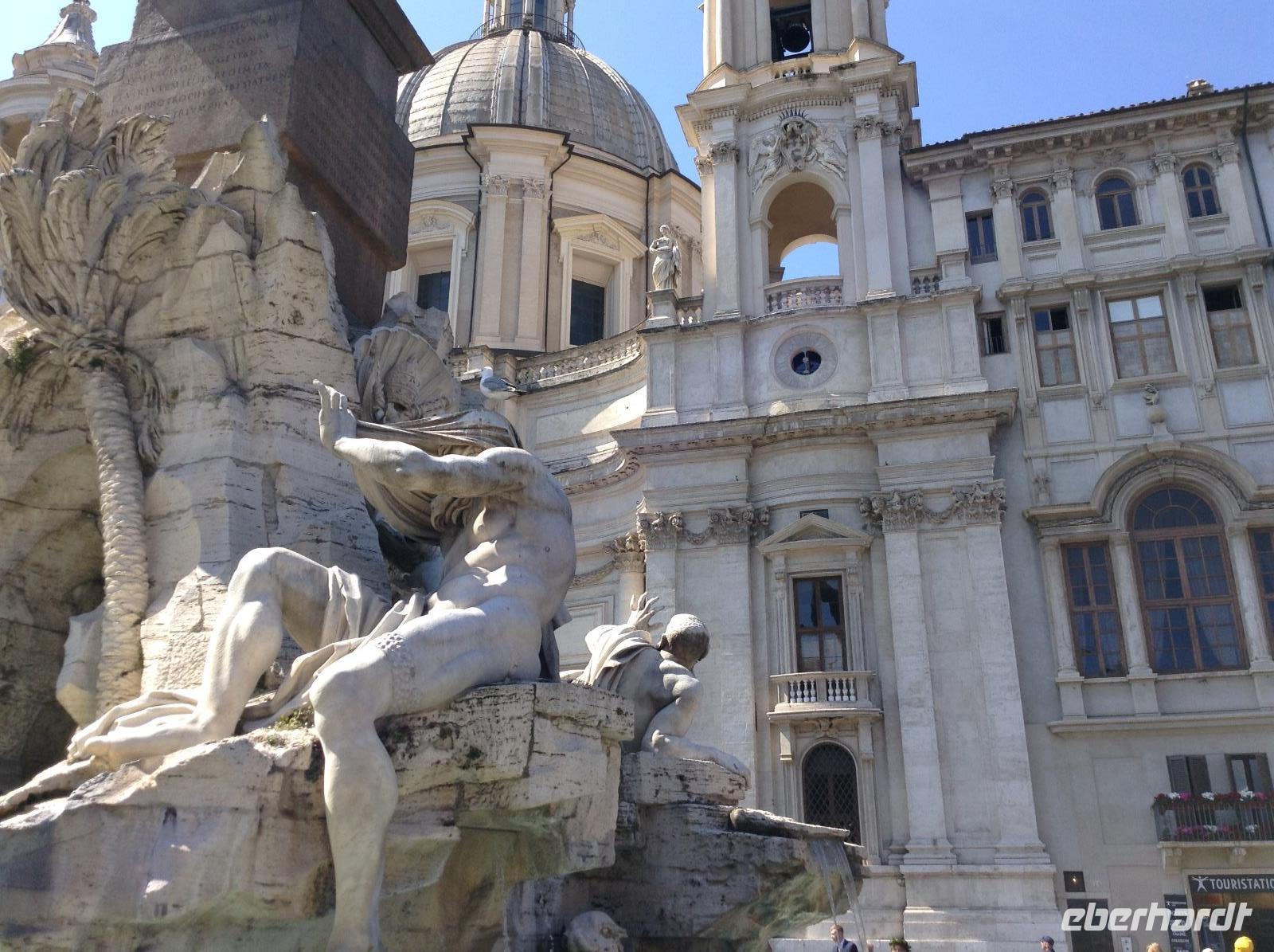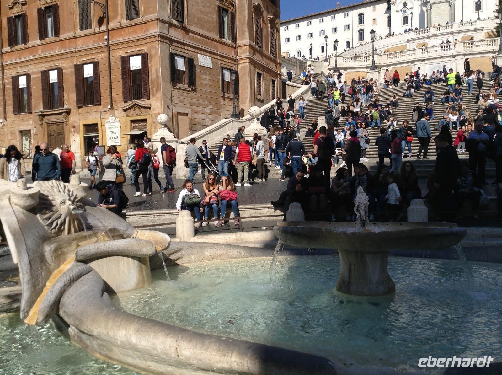 Wir machten Halt in einer der zahlreichen Marien-Kirchen der Stadt, später noch in der Kirche der deutschen Gemeinde. Rom's Kirchen sind wundervoll und bildschön, jede davon ein Museum und toll ausgestattet. Später standen wir auf einem der schönsten Plätz in der Altstadt, Piazza Navona. Unsere Blicke streiften die bunten Häuser ringsum und die beiden üppig gestalteten Brunnen. Weiter ging es zum Pantheon, einem Tempel, den Kaiser Hadrian einst errichten ließ. Im Mittelalter wurde der Bau zur Kirche umgestaltet und ist mit seiner riesigen 43 m hohen Kuppel und der 9 m großen Öffnung etwas ganz besonderes. Zu den besonderen Schätzen zählen auch die Grabmale mehrerer italienischer Könige und das Grab von Raffael. Es war Zeit für die Mittagspause, die wir in den Gassen um das Pantheon verbrachten. Nach dem Mittag standen noch 2 Besichtigungspunkte an: die Spanische Treppe und der Trevibrunnen. Das waren natürlich noch 2 Attraktionen, die jeden Rom-Besucher magisch anziehen, so auch uns. Und ehe wir am Trevibrunnen unsere Führung beendeten, durften wir nicht verpassen, die Münzen über die Schultern in das Wasser zu werfen und damit unser Versprechen abzugeben, hierher wiederzukommen. Es gab noch eine Menge zu sehen in der Stadt und alle Gäste hatten ihre Ideen, den letzten Tag in Rom gebührend ausklingen zu lassen. Es gab einen ganz romantischen Sonnenuntergang an diesem Abend.