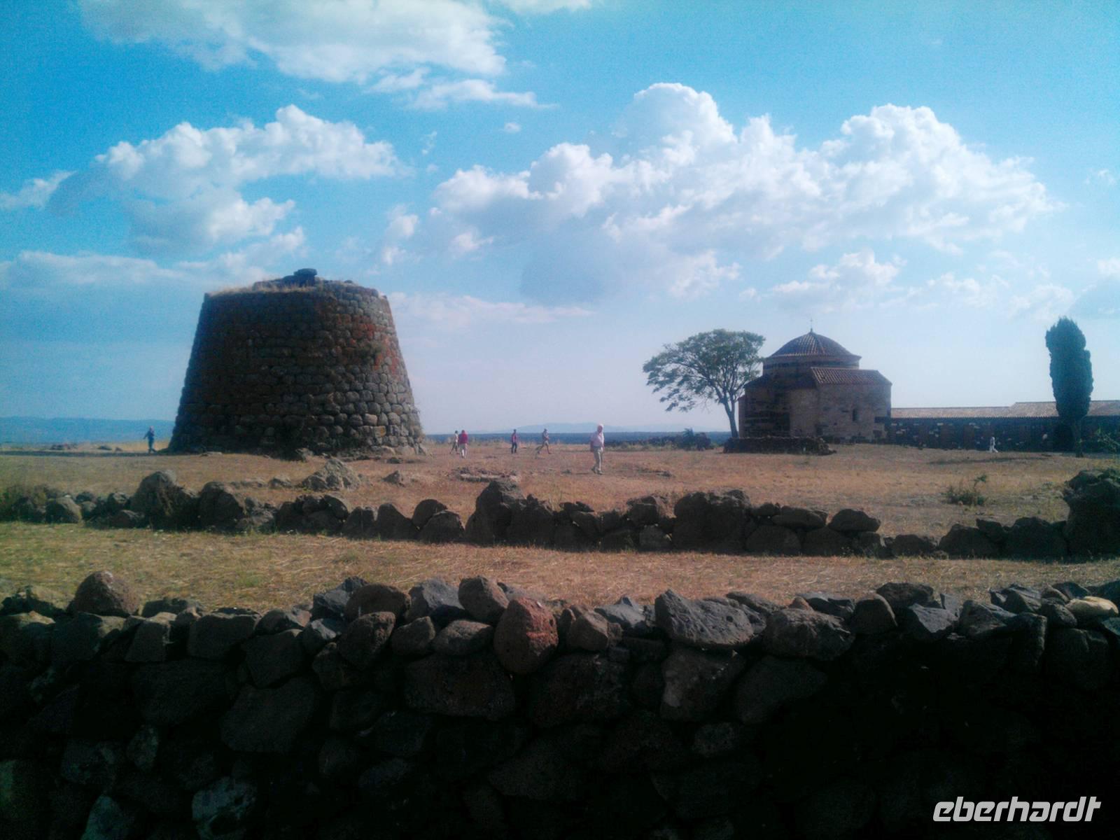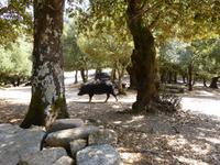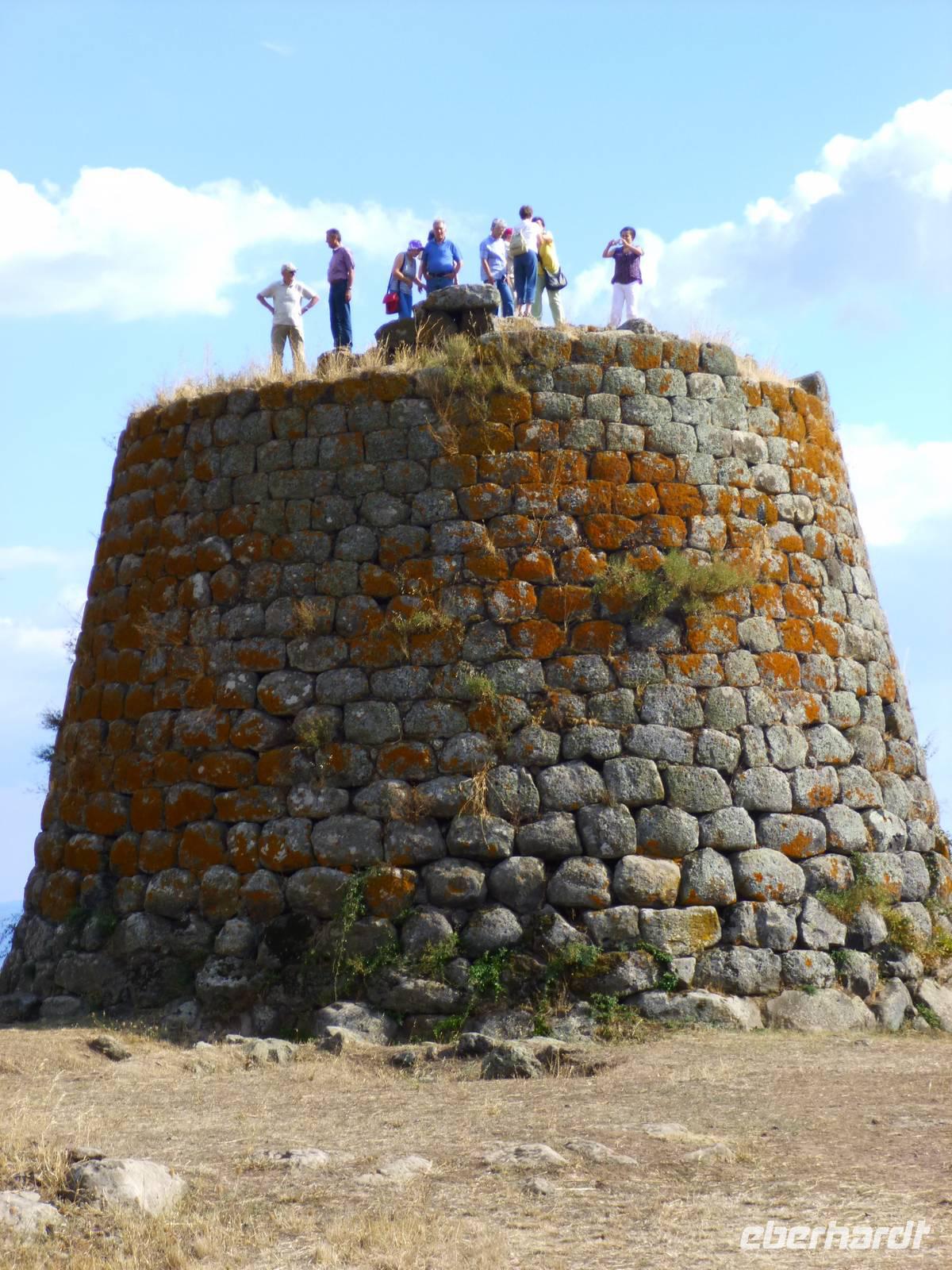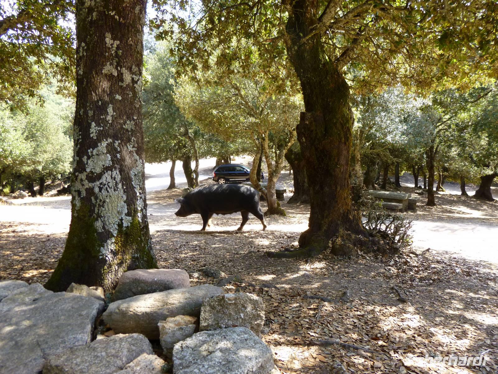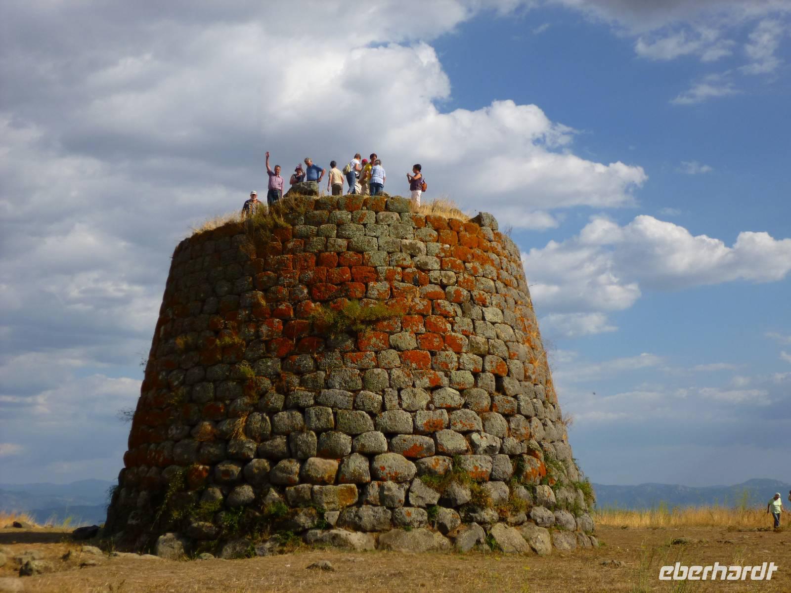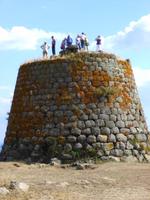 Nach einem ersten Fotostop an der zerklüfteten Küste der Gallura sind wir auch bald schon in Porto Cervo. Wie gewohnt bummeln wir durch diesen schönen Ort, der vor ca.40 Jahren für die Superreichen geschaffen wurde bis zur Kirche Stella Maris. Wir bewundern die Kleinode in der Kirche und erfreuen uns an den vielen blühenden Pflanzen auf unseren Weg zurück zum Bus. Weiter geht unsere Fahrt an Olbia vorbei in die Barbagia. Wir fahren durch die engen Straßen von Nuoro und sehen dort, wie die Sarden wohnen. Bald danach erreichen wir Orgosolo, den Wohnort unserer Hirten, die schon auf uns warten, um uns mit ihren Produkten zu bewirten. Nachdem wir uns bei einem kleinen Spaziergang die Murales von Orgosolo angeschaut haben, geht's in den Steineichenwald auf der Pratobello Hochebene. Alles ist schon vorbereitet und das ausgiebige Picknick kann beginnen. Natürlich schmeckt es allen Gästen ausgezeichnet und die Schweine holen sich von uns auch ihren Teil. Sehr zufrieden mit diesem ersten Höhepunkt der Reise geht die Fahrt weiter Richtung Alghero. Nach einer ruhigen Stunde Busfahrt muß ich aber meinen Gäste unbedingt die Wahrzeichen von Sardinien zeigen. An der Nuraghe Santa Sabina legen wir deswegen eine Pause ein und einige Gäste erkunden ausführlich dieses Bauwerk , das schon vor über 3ooo Jahren von den Nuraghern, wie man heute die damaligen Bewohner Sardiniens nennt, gebaut wurde.