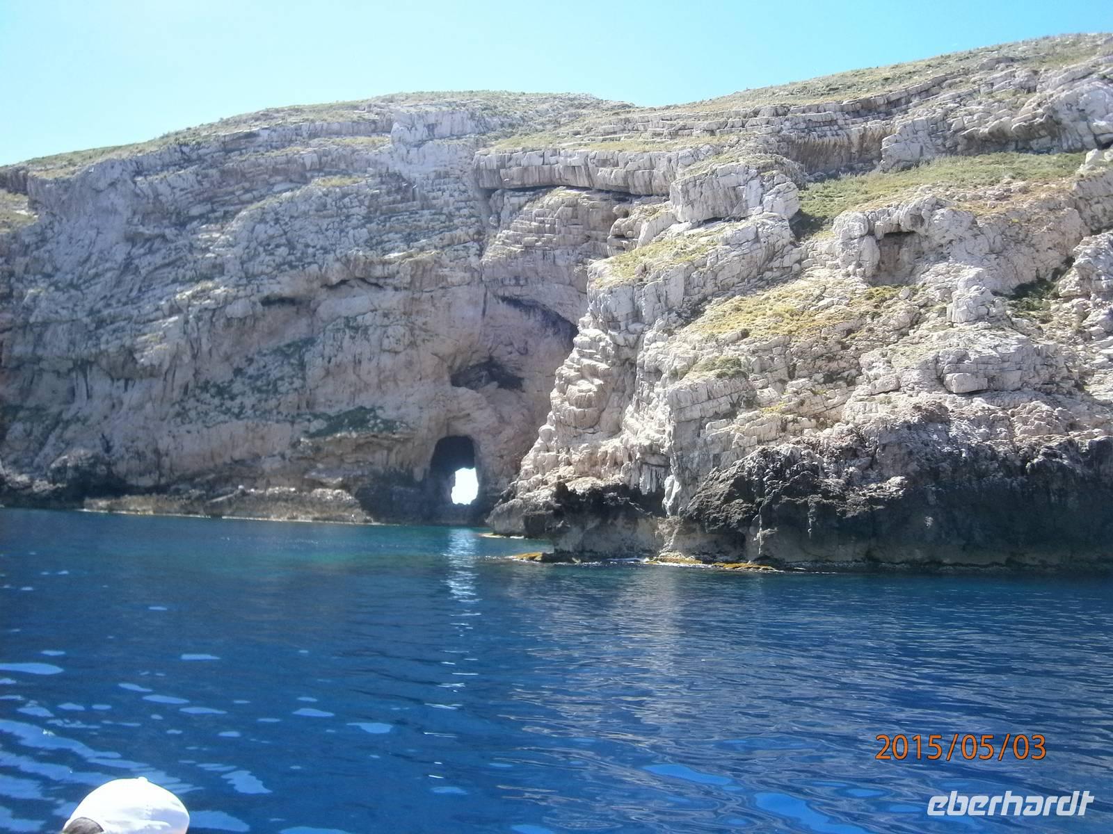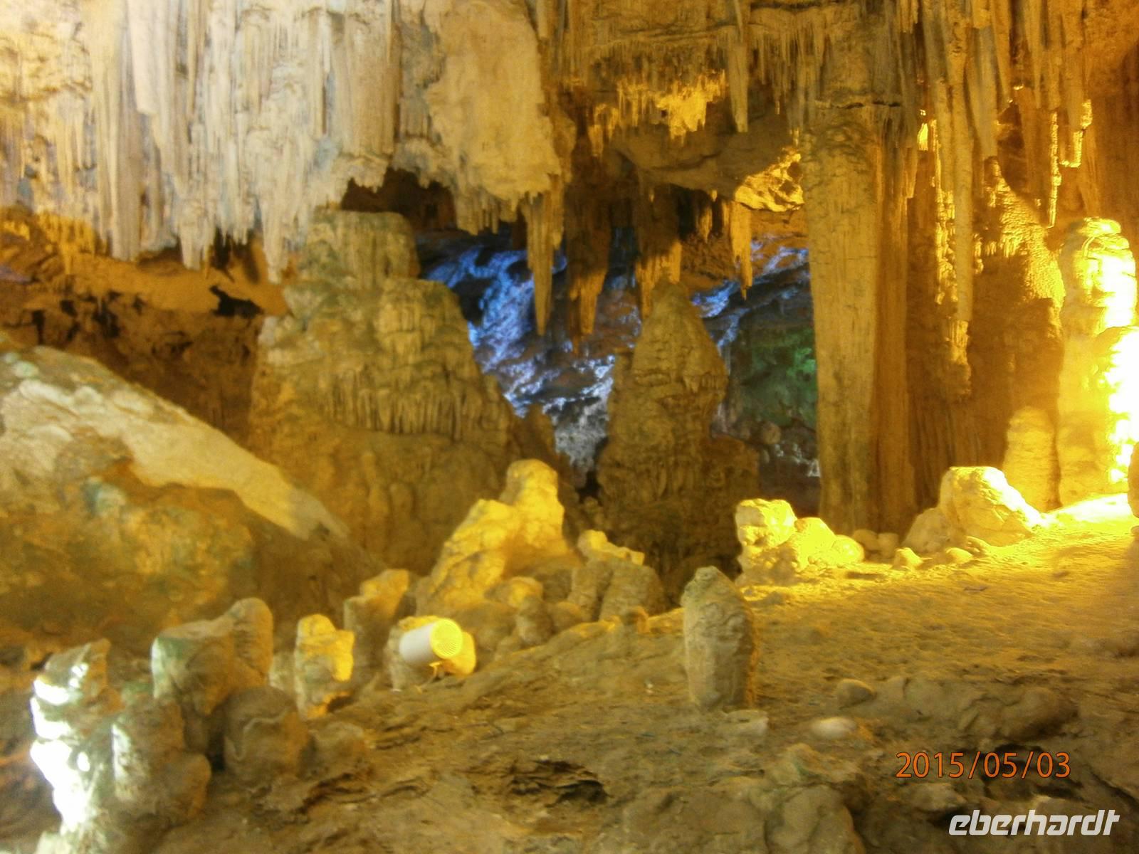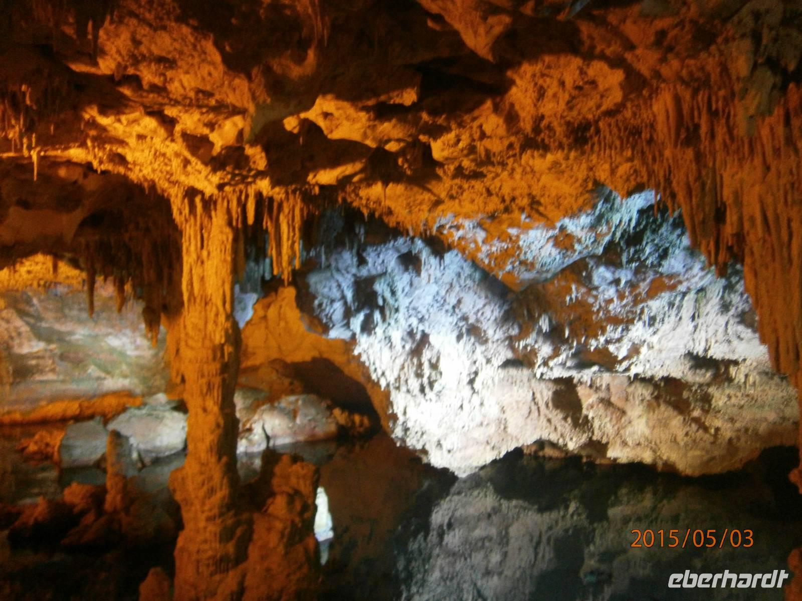 Den Nachmittag können sich unsere Gäste individuell nach ihren Wünschen gestalten. Einige wenige haben Interesse an einer Schifffahrt zum Capo Cacchia. Mit ihnen treffe ich mich nach der Mittagspause und gemeinsam begeben wir uns an Bord eines Ausflugsschiffes. Vor der Küste von Alghero liegt das Cap - eine fast 200 m steil ins Meer fallende Wand und etwa sieben Kilometer lang. In seinem Inneren, auf Meereshöhe befinden sich die Neptunsgrotten. Die Grotta di Nettuno sind die berühmtesten auf Sardinien. Im 14. Jahrhundert wurde sie von Fischern entdeckt und sind seit 1950 für die Besucher geöffnet. In hellen Gelb- und Orangetönen erstrahlen die Stalagtiten und Stalagmiten. Hier hat die Natur was einzigartiges geschaffen.