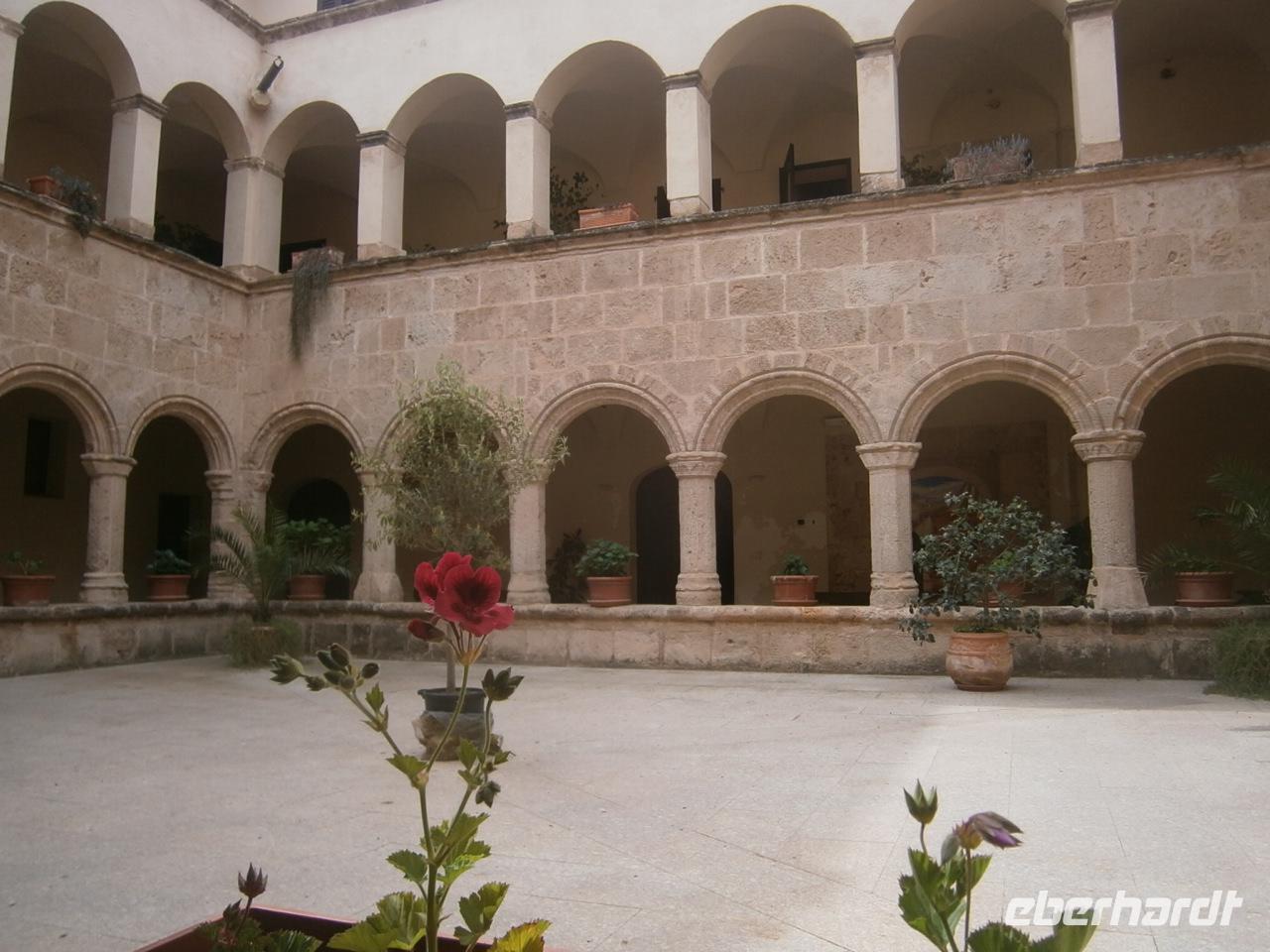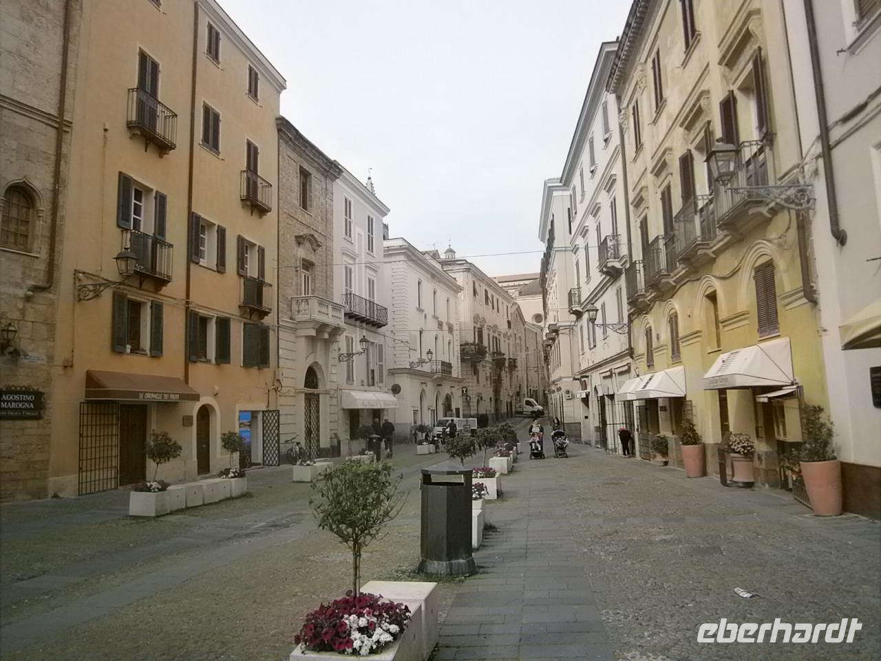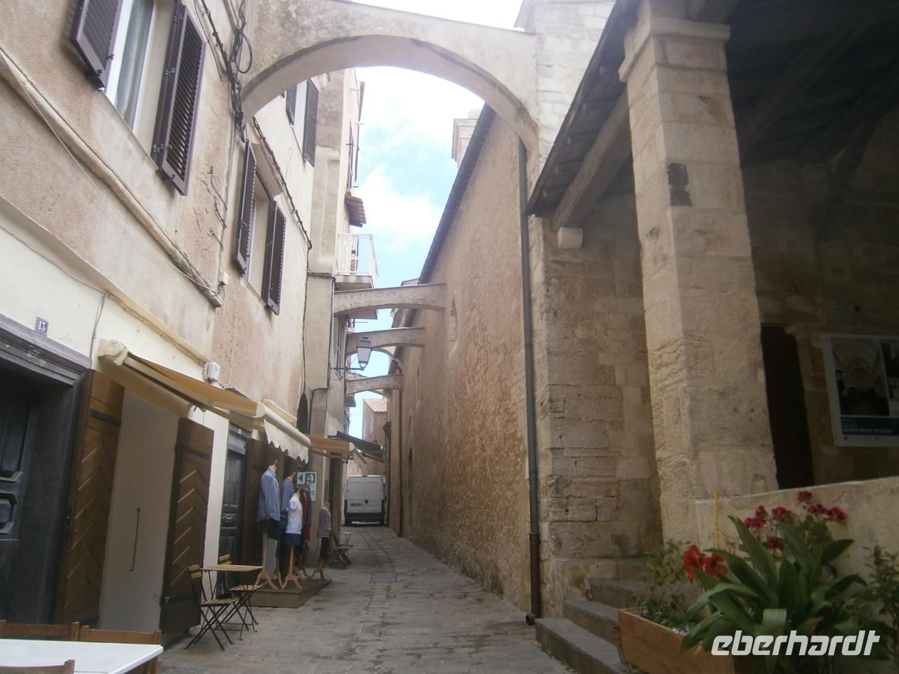 Durch das Stadttor betreten wir die Altstadt, die über zahlreiche mittelalterliche Baudenkmäler verfügt. Dicke Mauern umschließen die Stadt und schmale Gassen führen zu den Kirchen und Plätzen. Beim Rundgang fällt auf, das die Straßenschilder zweisprachig sind. Das geht auf die spanisch - katalanische Vergangenheit zurück. Von Sophie erfahren wir auch das noch viele Bewohner von Alghero die katalanische Sprache sprechen. Hintergrund dafür ist; das spanische Kolonisten die Stadt im 14. Jahrhundert neu besiedelten und es in der heutigen Zeit verschiedene Vereinigungen gibt die die Tradition der katalanischen Sprache und Kultur weiter führen. Wir spazieren über die Piazza Civica, die Via Santa Barbara, die Via Manno, die Via Principe Umberto und die Piazza Teatro, werfen einen Blick in die Kirche San Francesco und den sich anschließenden romanischen Kreuzgang.