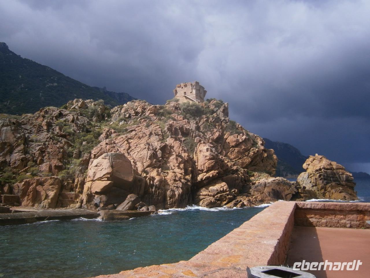 Durch das Hinterland und entlang der Küstenstraße erreichen wir die Calanche. Mit den bizarren Felsformationen, den „Tafoni" zählt die Calanche zu den schönsten Landschaften Korsikas. Hier haben Wind, die salzhaltige Luft und der Wechsel von Sonne und Regen die roten Felsen geformt. Je nach Tageslicht und Stand der Sonne erstrahlen sie in Orange- und Rottönen. Um dieses Schauspiel richtig genießen zu können verlassen wir unseren Bus und spazieren gemeinsam ein Stück durch dieses Wunder der Natur. Zwischen zwei Felsformationen finden wir das „Herz". Bei genauem Hinschauen entdecken wir eine „Schildkröte" und den „Hund". Der Phantasie sind keine Grenzen gesetzt. Am Chalet Calanche treffen wir auch wieder unseren Bus, mit Chauffeur. Er ist voraus gefahren. Zur Mittagszeit sind wir in dem kleinen Örtchen Porto, gelegen am gleichnamigen Golf und Fluss.