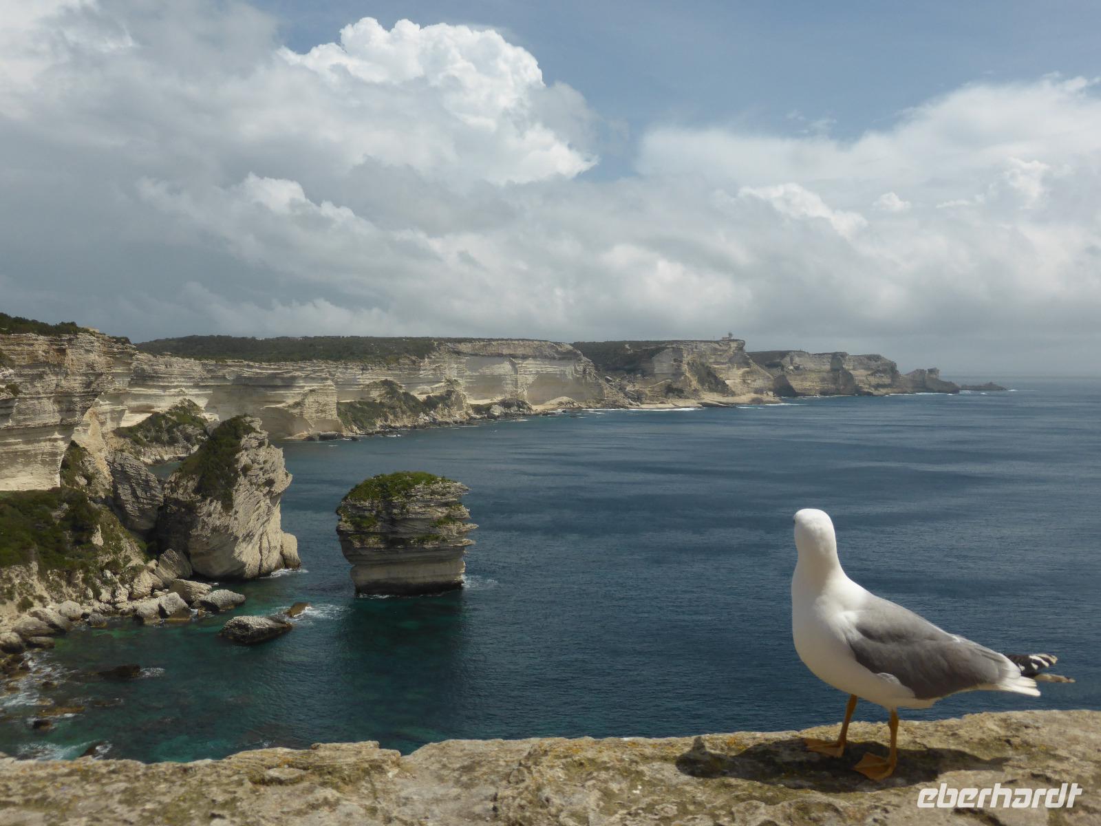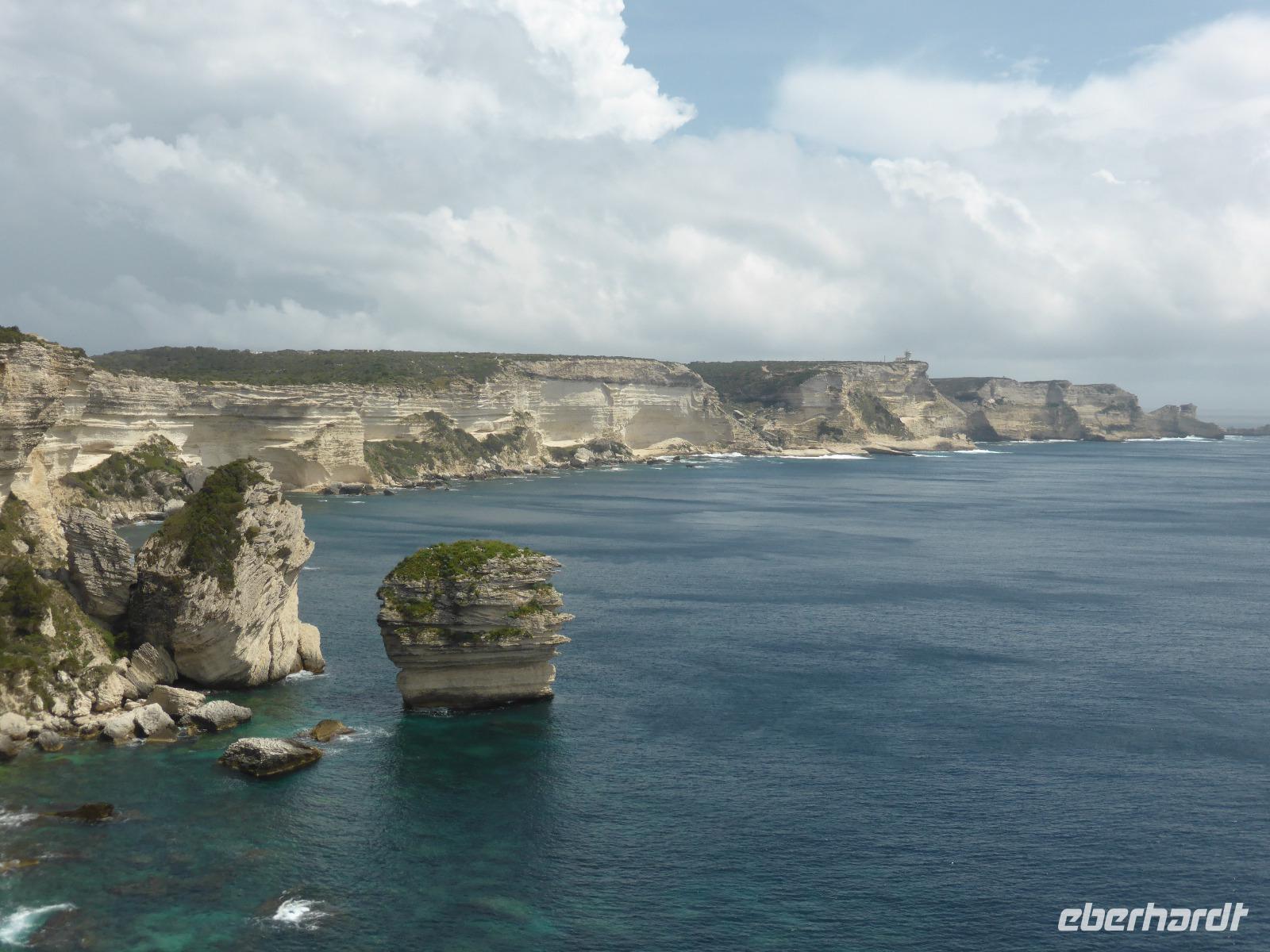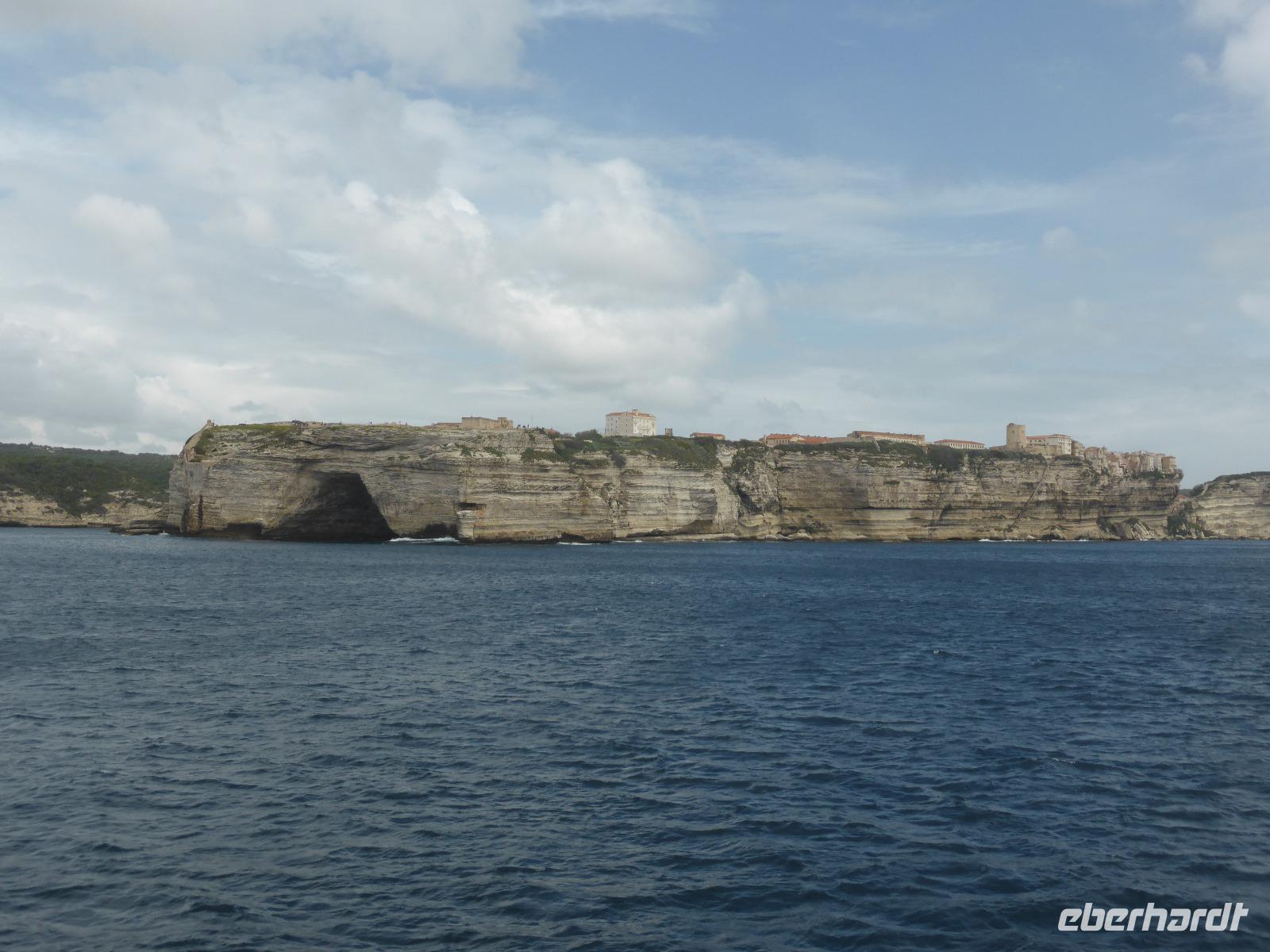 Mit unserem Gepäck starteten wir heute nach Santa Teresa di Gallura, um mit der Fähre nach Korsika zu gelangen. Entlang der Nordwestküste Sardiniens fuhren wir Richtung Castelsardo. Der viel fotografierte Roccia dell´Elefante wartete bereits auf unseren Besuch. Der rund zehn Meer hohe, zu einem skurrilen Elefanten verwitterte Trachytfels, der seinen Rüssel weit über die Leitplanke schwingt, birgt mehrere Felskammergräber aus der Ozieri-Kultur. Ein kurzer Abstecher nach Castelsardo blieb uns aufgrund einer Umleitung verwehrt. Von Santa Teresa Gallura setzten wir mit der Fähre über die Straße von Bonifacio nach Korsika über. Schon von weitem bekamen wir einen phantastischen Eindruck von der südlichsten Stadt Korsikas. Die Altstadt liegt auf einem weit ins Meer ragenden schmalen Felsrücken. Wir konnten die Treppe des Königs von Aragon sowie die Napoleonsgrotte vom Schiff aus bewundern. Bei unserem Spaziergang durch die mittelalterliche Altstadt entdeckten wir u.a. die Zitadelle, die Straße der zwei Kaiser (Napoleon und Karl V.) sowie die Loggia, die gleichzeitig der Eingang zur Hauptkirche darstellt. Das Panorama auf die Kalksteinklippen bis hin zum Pertusatokap war überwältigend.