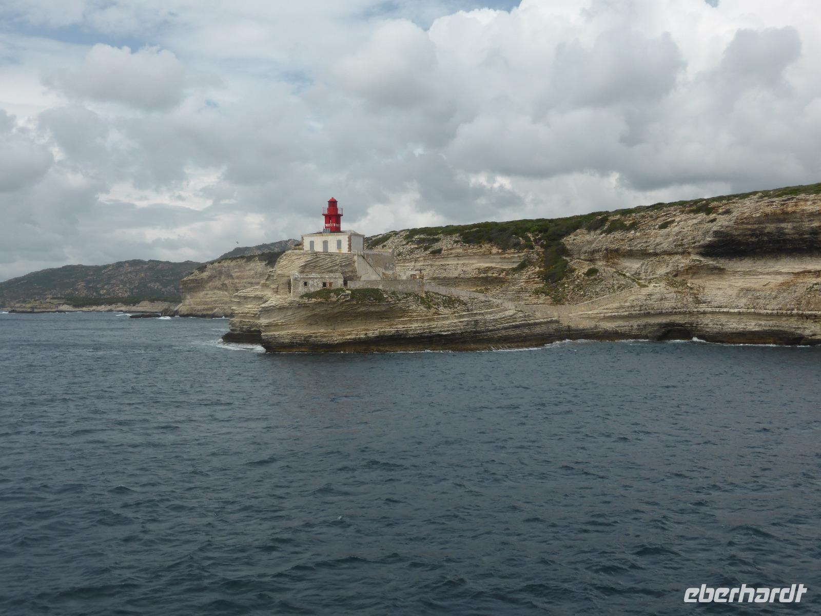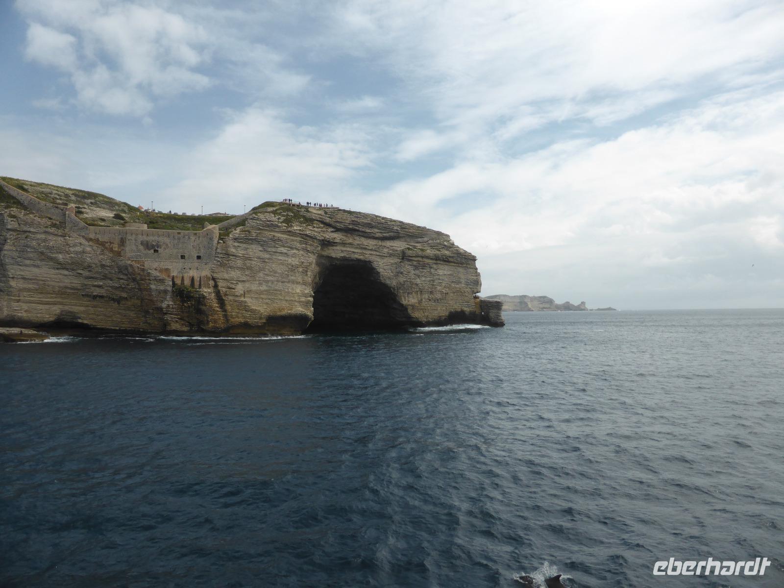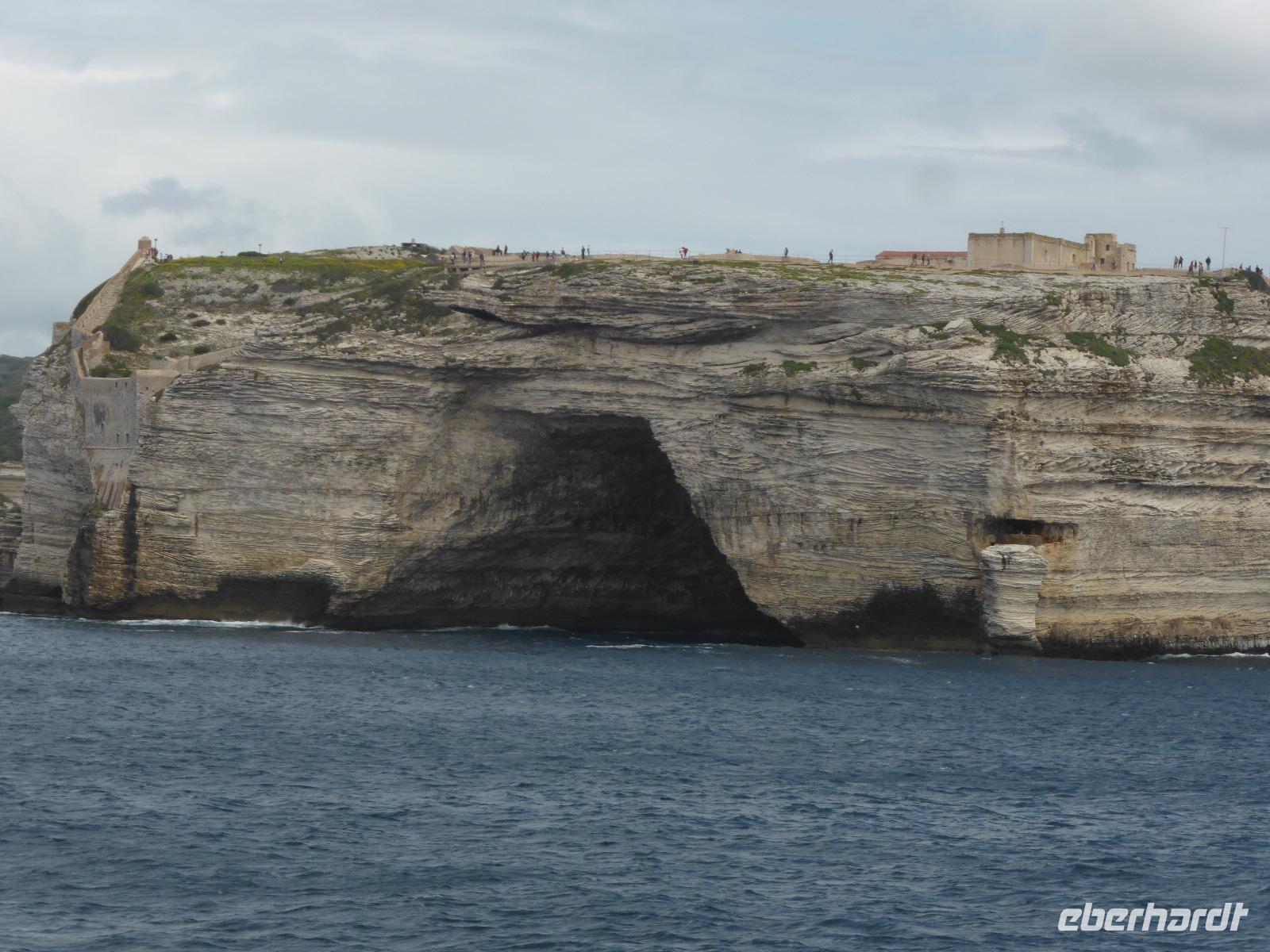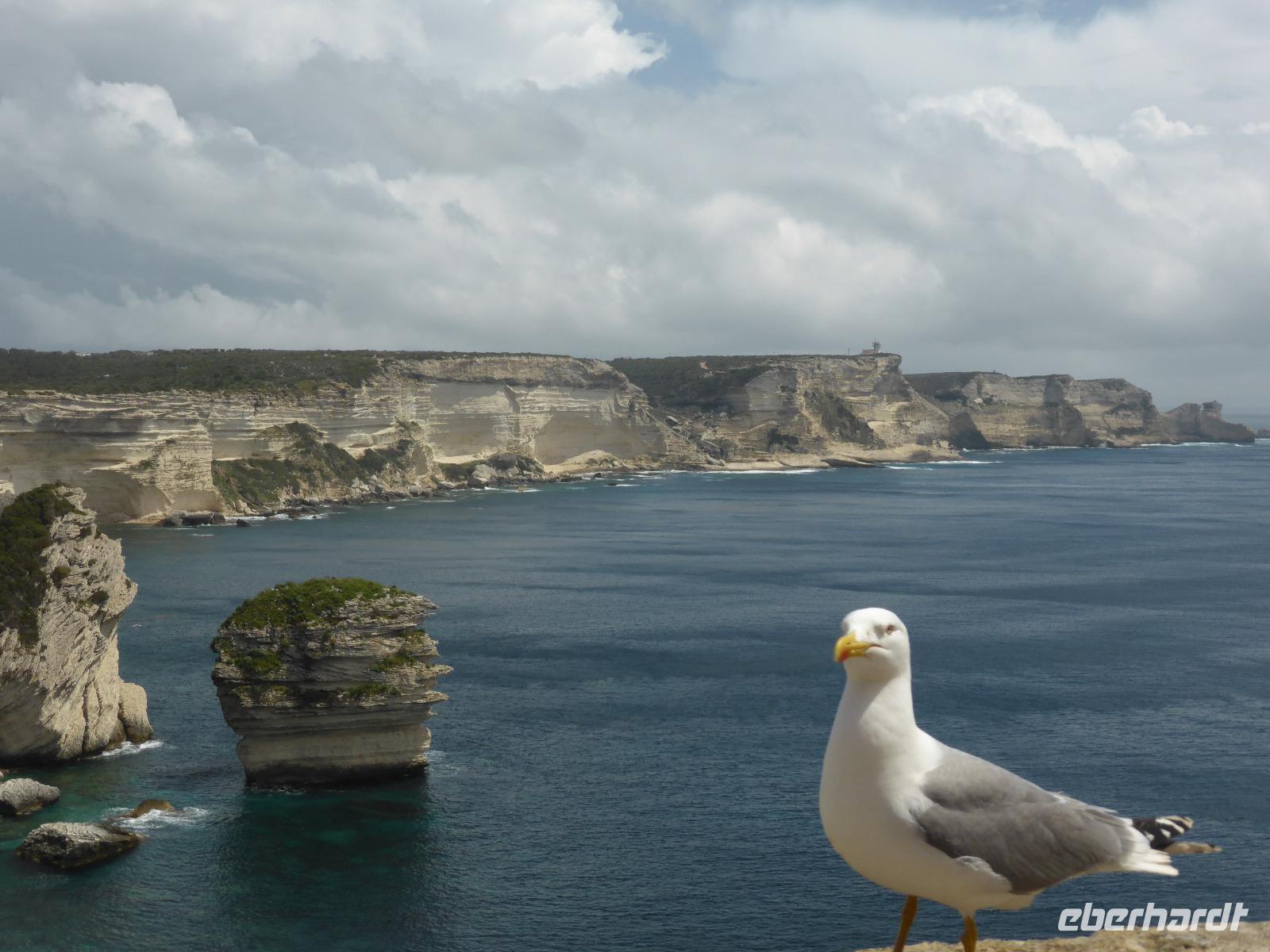 Mit unserem Gepäck starteten wir heute nach Santa Teresa di Gallura, um mit der Fähre nach Korsika zu gelangen. Entlang der Nordwestküste Sardiniens fuhren wir Richtung Castelsardo. Der viel fotografierte Roccia dell´Elefante wartete bereits auf unseren Besuch. Der rund zehn Meer hohe, zu einem skurrilen Elefanten verwitterte Trachytfels, der seinen Rüssel weit über die Leitplanke schwingt, birgt mehrere Felskammergräber aus der Ozieri-Kultur. Ein kurzer Abstecher nach Castelsardo blieb uns aufgrund einer Umleitung verwehrt. Von Santa Teresa Gallura setzten wir mit der Fähre über die Straße von Bonifacio nach Korsika über. Schon von weitem bekamen wir einen phantastischen Eindruck von der südlichsten Stadt Korsikas. Die Altstadt liegt auf einem weit ins Meer ragenden schmalen Felsrücken. Wir konnten die Treppe des Königs von Aragon sowie die Napoleonsgrotte vom Schiff aus bewundern. Bei unserem Spaziergang durch die mittelalterliche Altstadt entdeckten wir u.a. die Zitadelle, die Straße der zwei Kaiser (Napoleon und Karl V.) sowie die Loggia, die gleichzeitig der Eingang zur Hauptkirche darstellt. Das Panorama auf die Kalksteinklippen bis hin zum Pertusatokap war überwältigend.