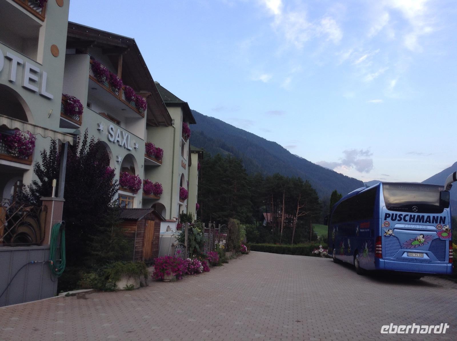 Am Samstag Morgen ging es in Dresden pünktlich los, unsere Strecke führte uns über Chemnitz und Hof, an Nürnberg vorbei bis München. Wegen des hohen Verkehrsaufkommens und der Stau's in Richtung Süden wählten wir die weitere Route über Garmisch Partenkirchen und den Seefelder Sattel in Richtung Insbruck. Von Insbruck aus ging es dann die Brennerautobahn bis nach Südtirol hinein. In Sterzing verliessen wir die Autobahn. Kurze Zeit später hatten wir in Freienfeld das schöne Hotel "Saxl" zur ersten Zwischenübernachtung erreicht. Zum Abendessen gab es leckere Südtiroler Schmanckerln und der erste Abend klang gemütlich aus.
