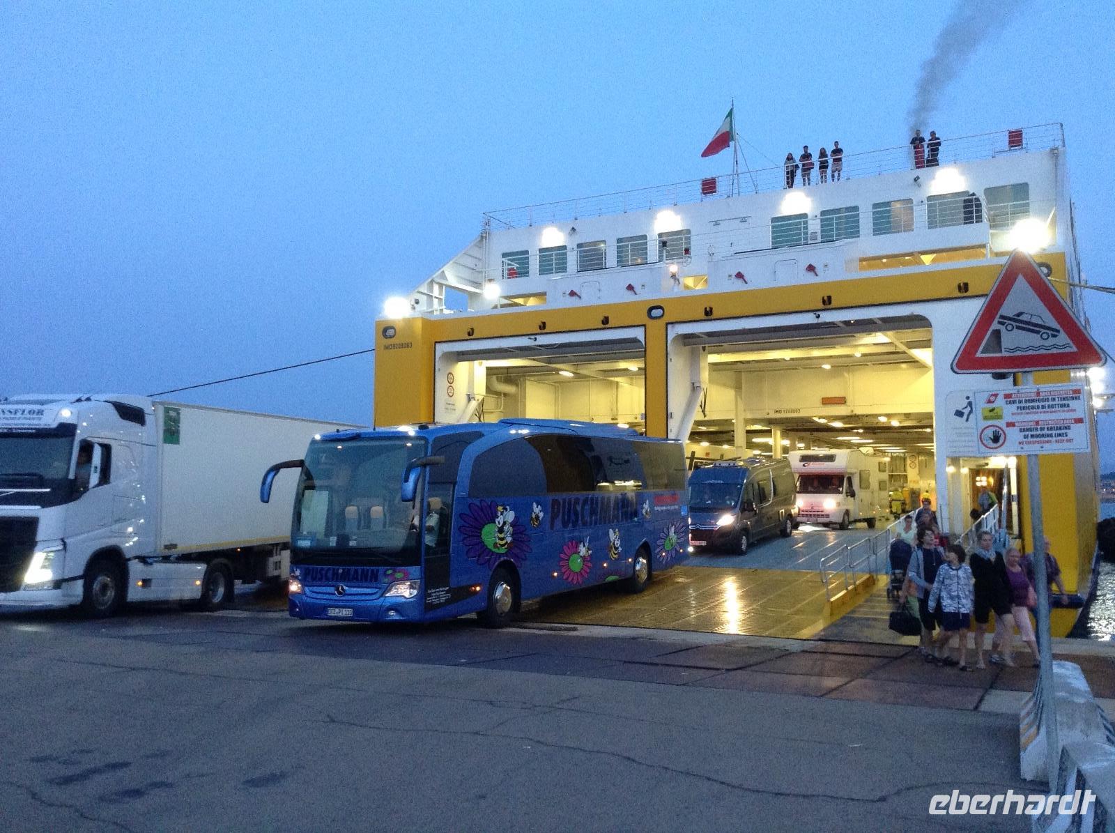 Am Nachmittag ging es weiter in Richtung Süden. Vorbei an Verona, Modena, Bologna und Florenz fuhren wir auf Pisa zu. Am Abend erreichten wir den Fährhafen von Livorno und warteten geduldig, bis unsere Fähre kam und entladen war. Sehr spät am Abend konnten wir dann unsere Kabinen beziehen und kurz vor Mitternacht begann die Fährüberfahrt nach Sardinien.