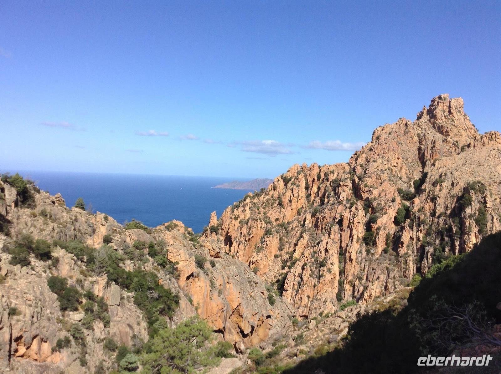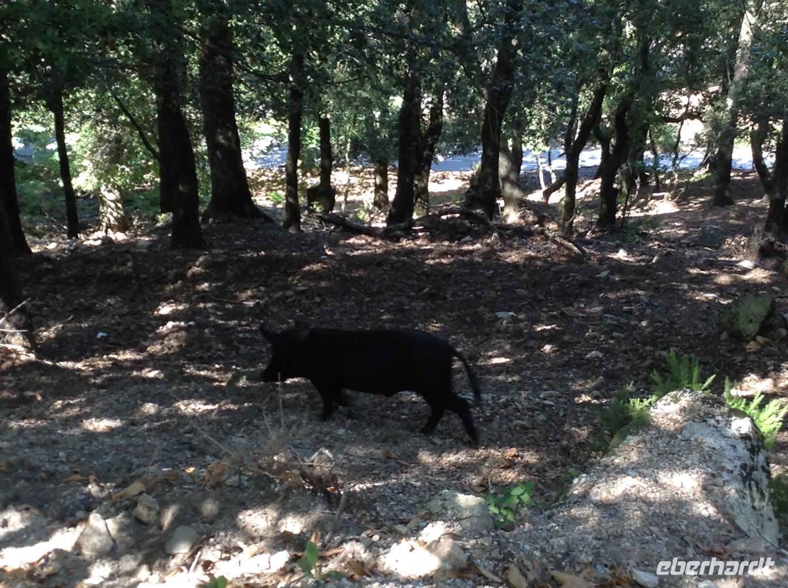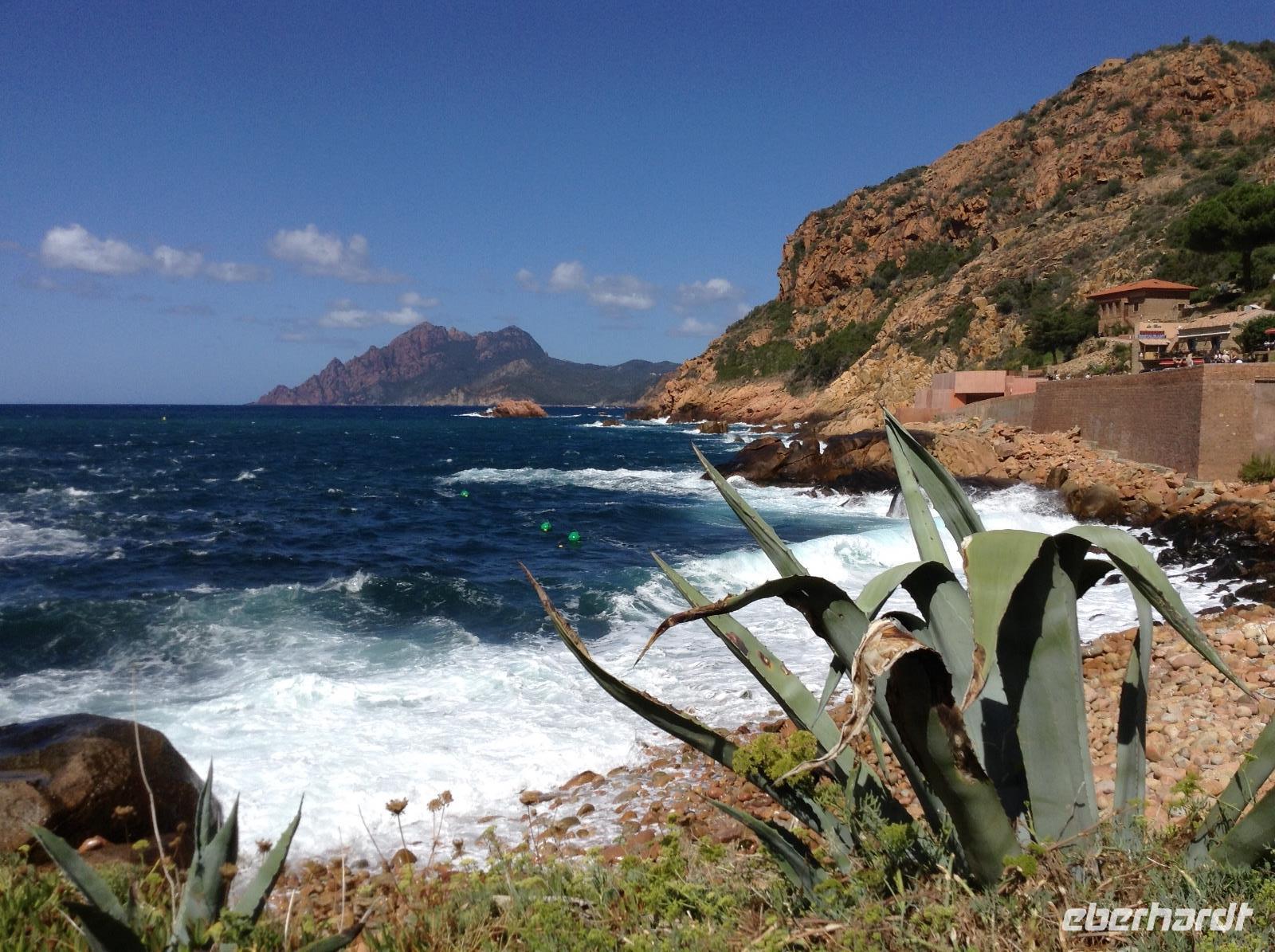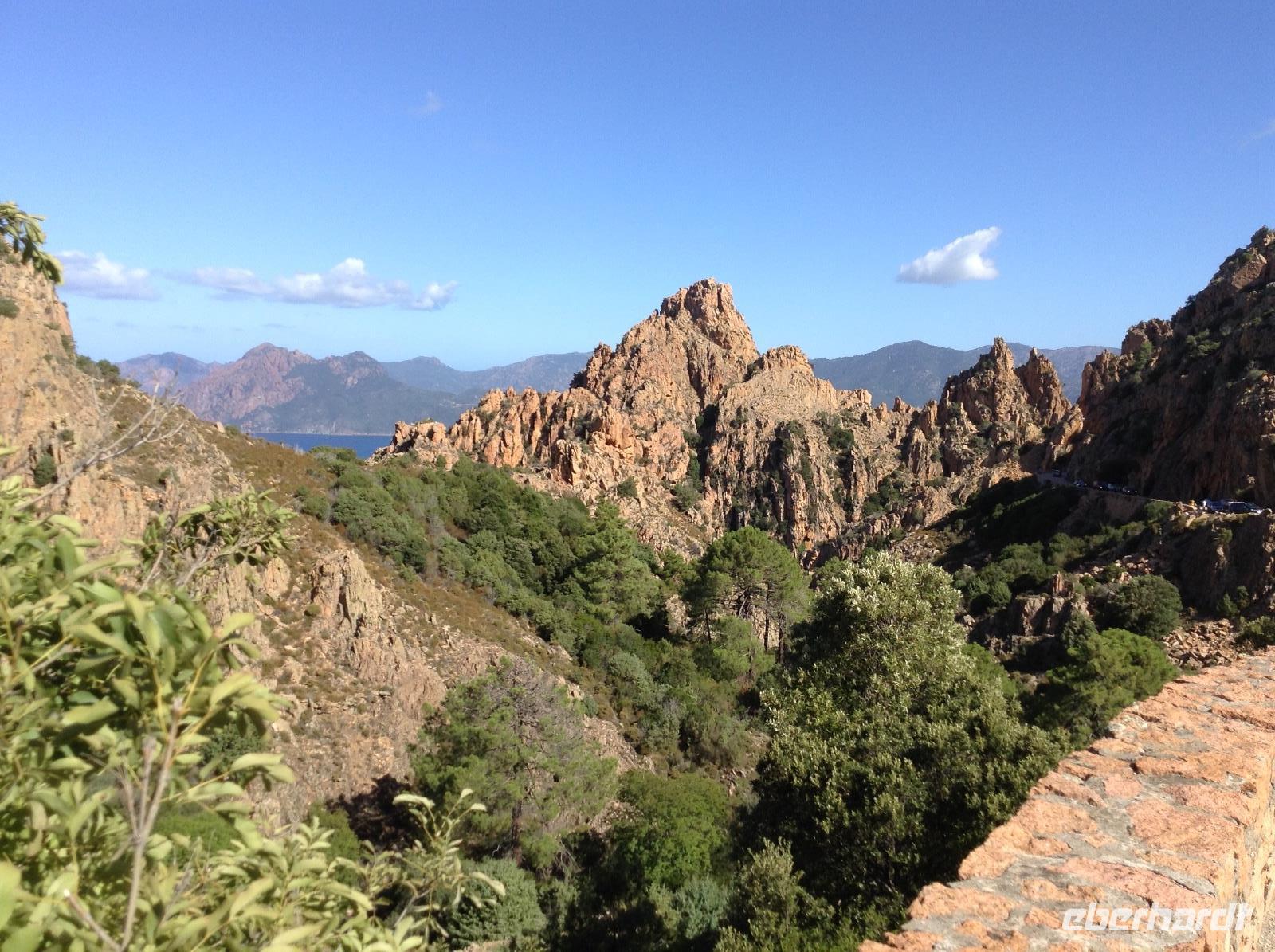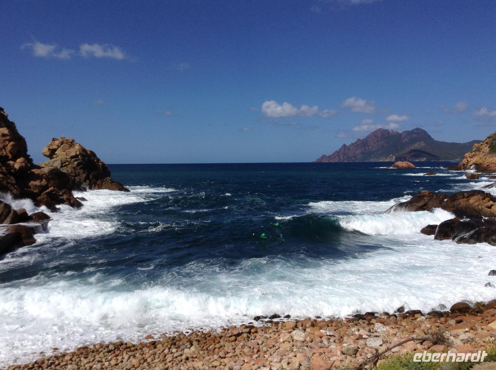 Heute ging es etwas früher los, wir hatten ein tolles Programm. Es war wieder ein sonniger Morgen, als wir uns auf die Fahrt zur Calanche machten. Von Ajaccio ging es in nördlicher Richtung immer an der Westküste entlang. Bezaubernde Ausblicke immer wieder, wir machten schöne Fotostopps. Am Golf von Sagone vorbei fuhren wir hinauf nach Piana. Der kleine hübsche Ort gilt als das Tor zur Calanche. Bald schon sahen wir in der warmen Morgensonne die ganze Schönheit dieses einzigartigen Landstriches auf Korsika und wir waren überwältigt. Kurz hinter dem Ort verließen wir den Bus um ein Stück zu laufen und zu genießen. Bizarre Felsformationen in rötlicher Farbe, tief eingeschnitten und etwa 400 Meter ins herrlich blaue Meer abfallend, standen da vor uns. Nach einem kurzen Stop im kleinen Bistro stiegen wir wieder in unseren Bus und führen hinunter zum Hafen von Porto. Im Eukalyptuswald gab es diesmal Mittagessen, dann spazierten wir in den Ort hinein. Eigentlich war eine Bootsfahrt entlang der Calanche geplant. Die konnte an diesem Tag leider nicht stattfinden, das Meer war zu bewegt, hohe Wellen kamen uns am kleinen Hafen entgegen. Beeindruckend war die Gischt und wir beobachteten das Naturschauspiel. Später ging es dann von Porto aus in Richtung Inselinneres, wir fuhren die ebenfalls sehr beeindruckende SpelunkaSchlucht hinauf, hatten immer wieder tolle Ausblicke auf das tief eingeschnittene Tal und die umliegenden hohen Berge in der Inselmitte. Unterwegs begegneten uns die Tiere der Insel: Esel, Ziegen und die halbwilden Schweine, auch Pferde und Kühe. Wieder an der Küste angekommen, ging es die Küstenstraße zurück nach Ajaccio.