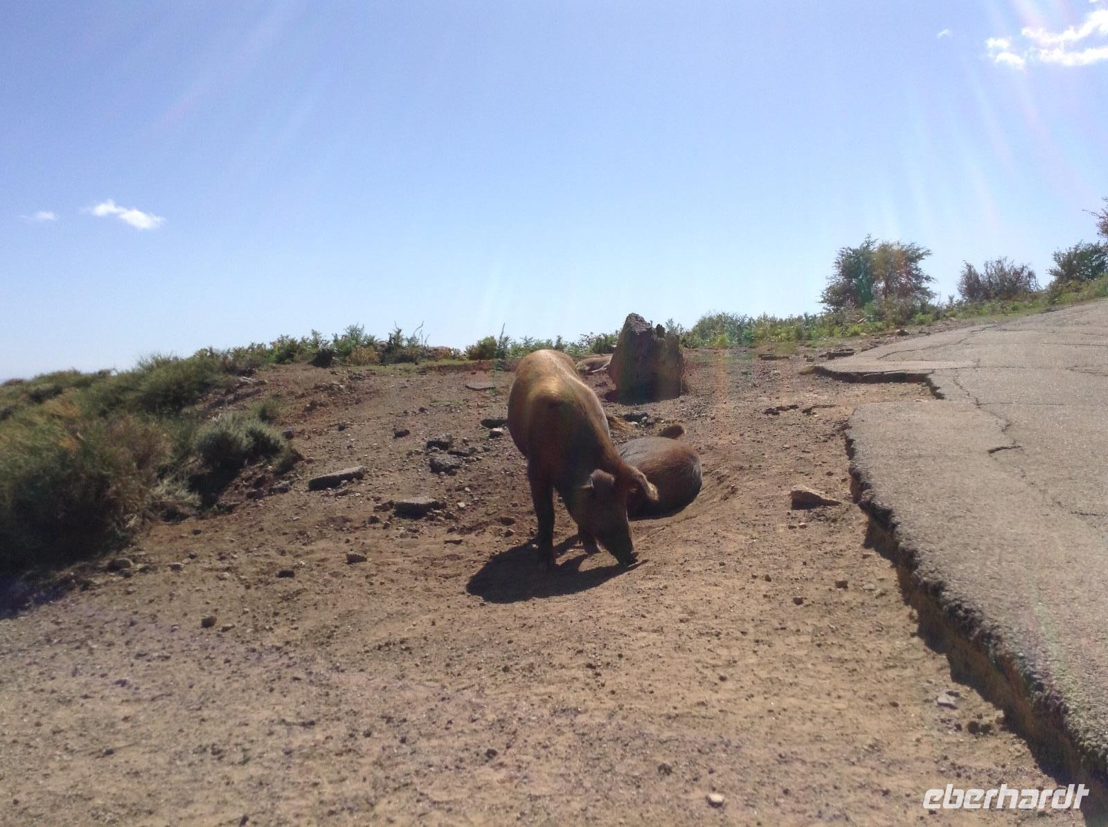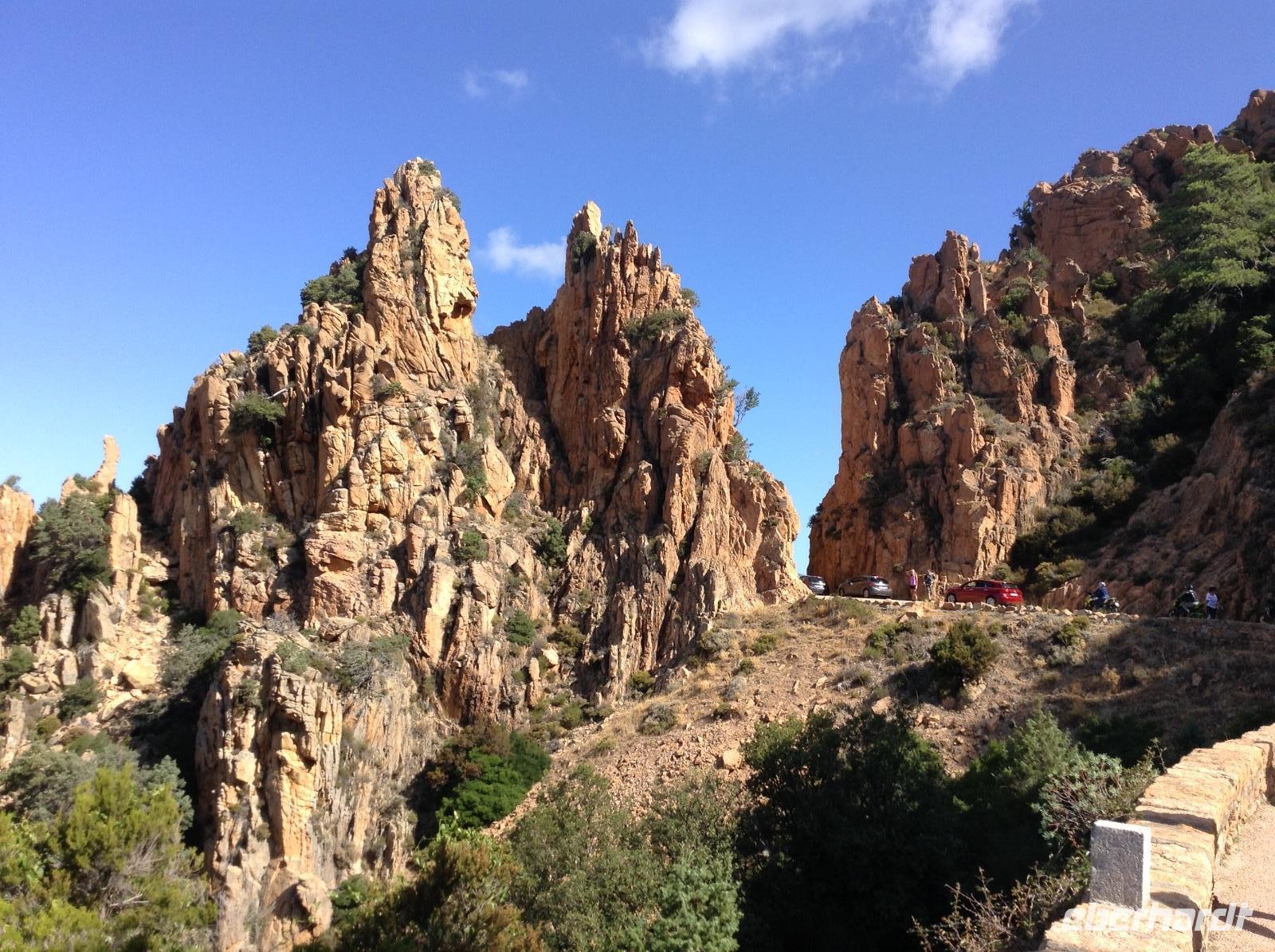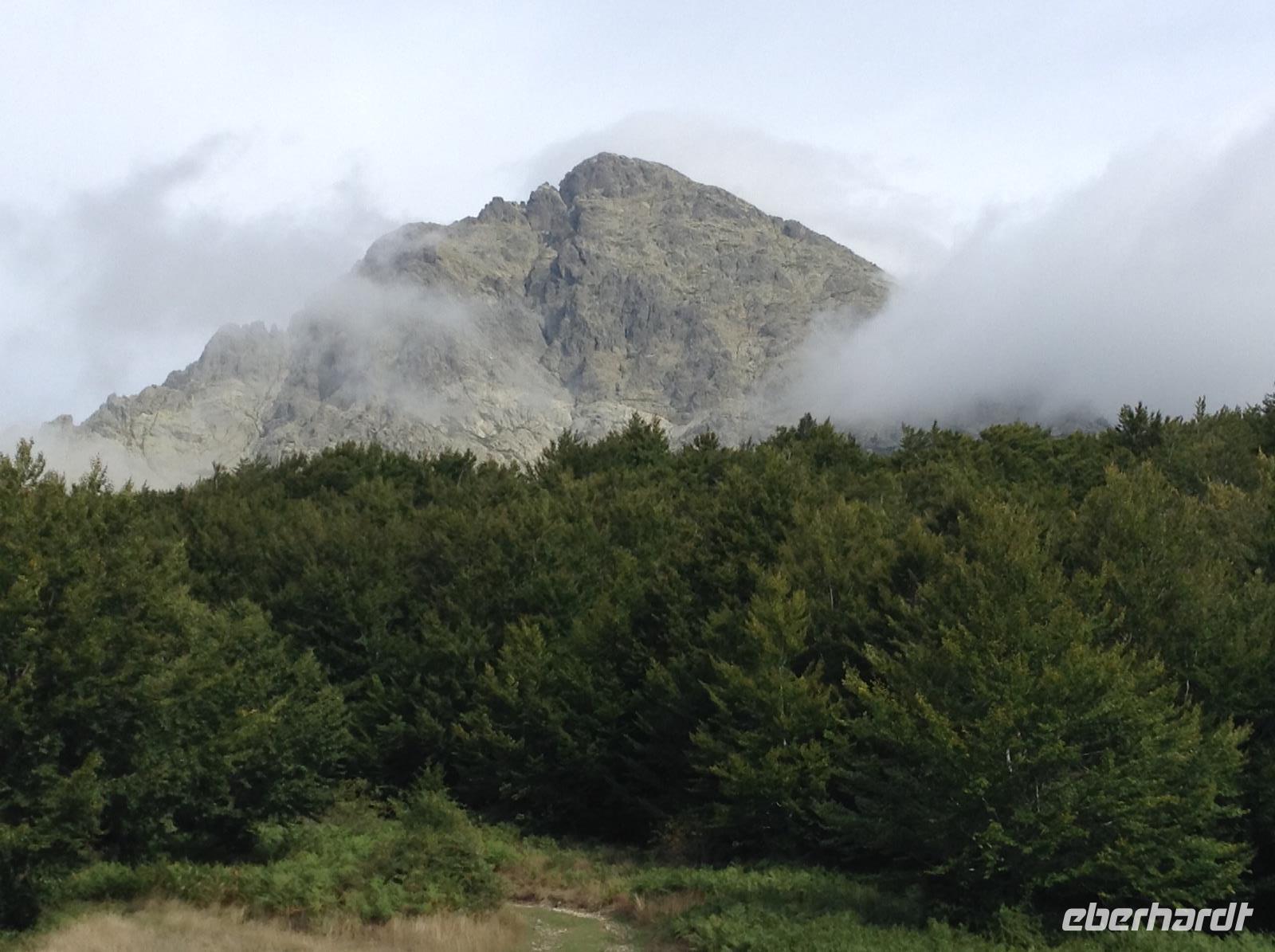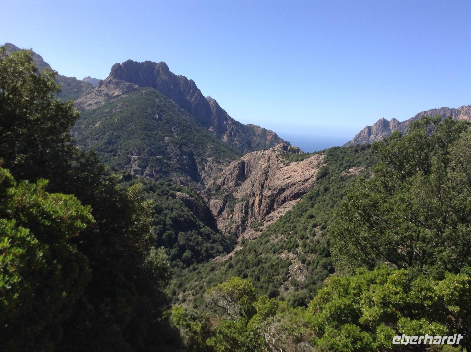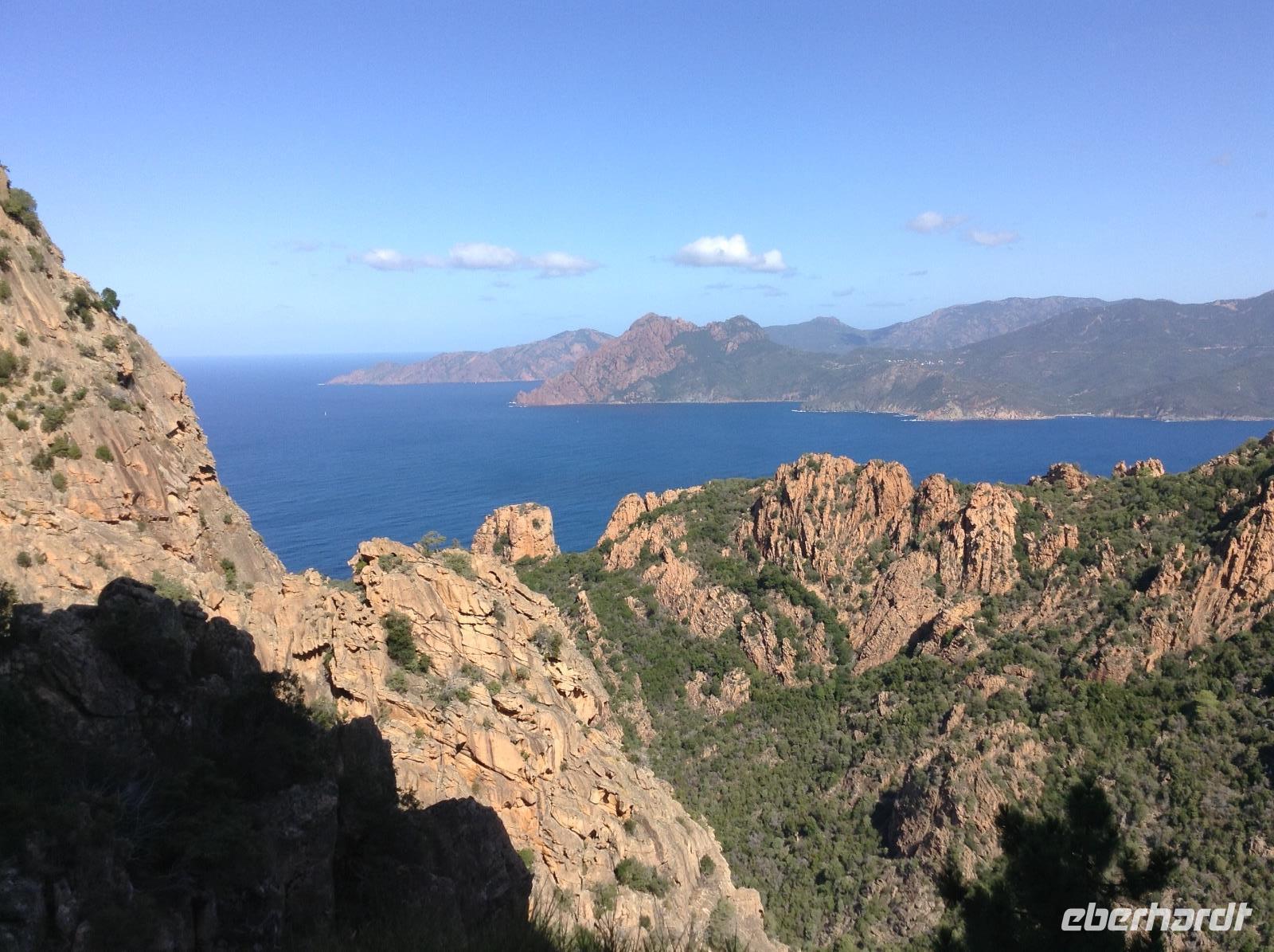Heute ging es etwas früher los, wir hatten ein tolles Programm. Es war wieder ein sonniger Morgen, als wir uns auf die Fahrt zur Calanche machten. Von Ajaccio ging es in nördlicher Richtung immer an der Westküste entlang. Bezaubernde Ausblicke immer wieder, wir machten schöne Fotostopps. Am Golf von Sagone vorbei fuhren wir hinauf nach Piana. Der kleine hübsche Ort gilt als das Tor zur Calanche. Bald schon sahen wir in der warmen Morgensonne die ganze Schönheit dieses einzigartigen Landstriches auf Korsika und wir waren überwältigt. Kurz hinter dem Ort verließen wir den Bus um ein Stück zu laufen und zu genießen. Bizarre Felsformationen in rötlicher Farbe, tief eingeschnitten und etwa 400 Meter ins herrlich blaue Meer abfallend, standen da vor uns. Nach einem kurzen Stop im kleinen Bistro stiegen wir wieder in unseren Bus und führen hinunter zum Hafen von Porto. Im Eukalyptuswald gab es diesmal Mittagessen, dann spazierten wir in den Ort hinein. Eigentlich war eine Bootsfahrt entlang der Calanche geplant. Die konnte an diesem Tag leider nicht stattfinden, das Meer war zu bewegt, hohe Wellen kamen uns am kleinen Hafen entgegen. Beeindruckend war die Gischt und wir beobachteten das Naturschauspiel. Später ging es dann von Porto aus in Richtung Inselinneres, wir fuhren die ebenfalls sehr beeindruckende SpelunkaSchlucht hinauf, hatten immer wieder tolle Ausblicke auf das tief eingeschnittene Tal und die umliegenden hohen Berge in der Inselmitte. Unterwegs begegneten uns die Tiere der Insel: Esel, Ziegen und die halbwilden Schweine, auch Pferde und Kühe. Wieder an der Küste angekommen, ging es die Küstenstraße zurück nach Ajaccio.