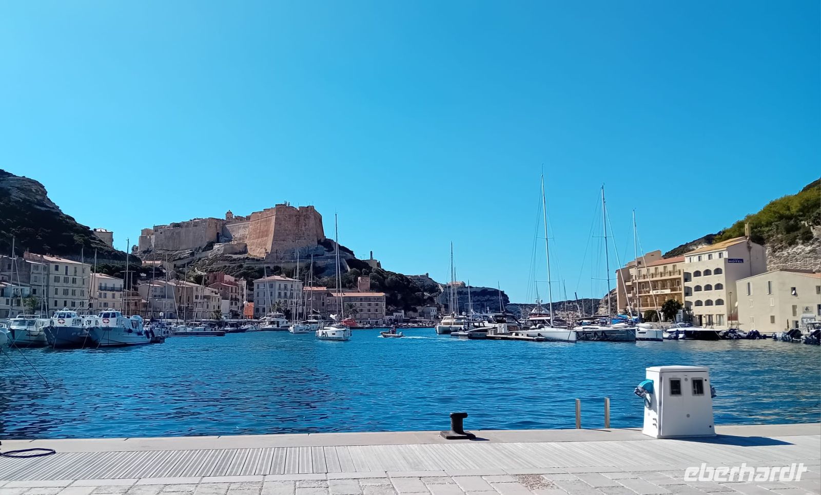 Die Überfahrt nach Bonifacio war ein besonderes Erlebnis: Das Schiff glitt sanft über das türkisfarbene Wasser, während die steilen Kalksteinfelsen von Bonifacio immer näher rückten und majestätisch aus dem Meer emporstiegen. Die beeindruckende Kulisse dieser Hafenstadt, die wie ein Adlernest hoch über dem Meer thront, ließ uns staunen.