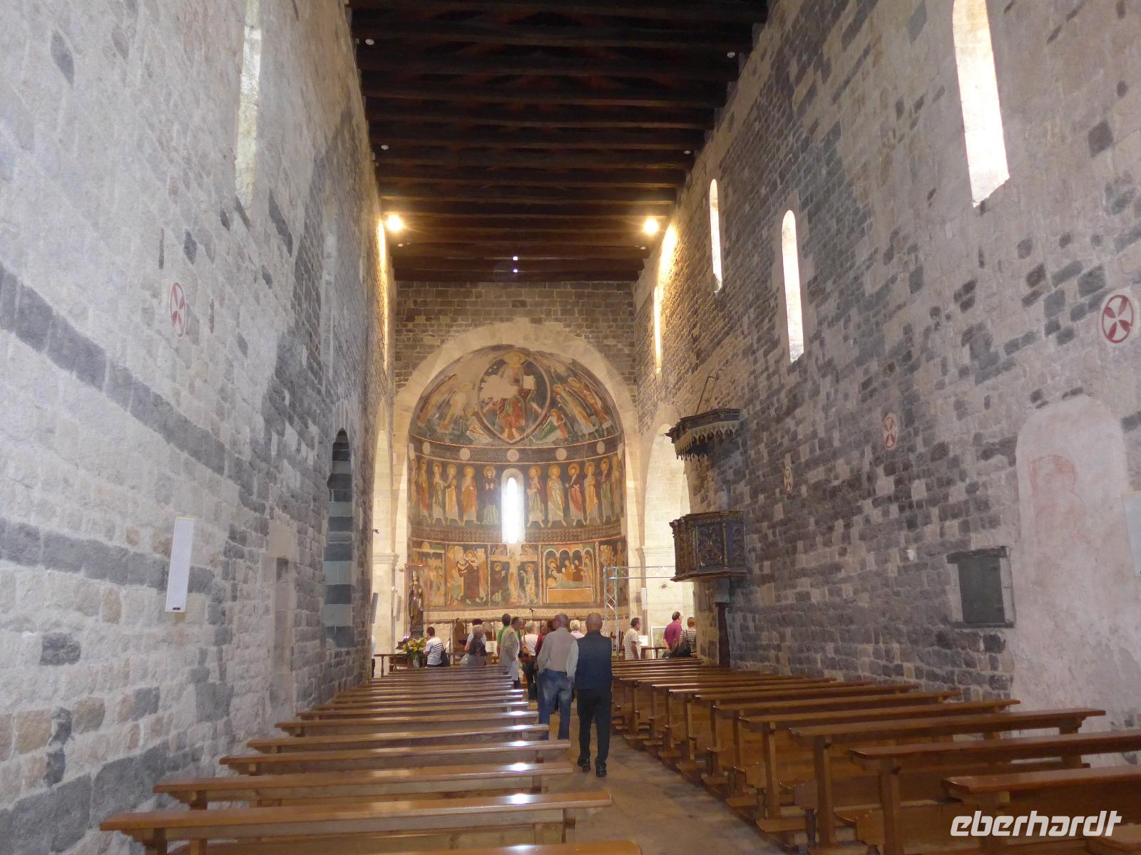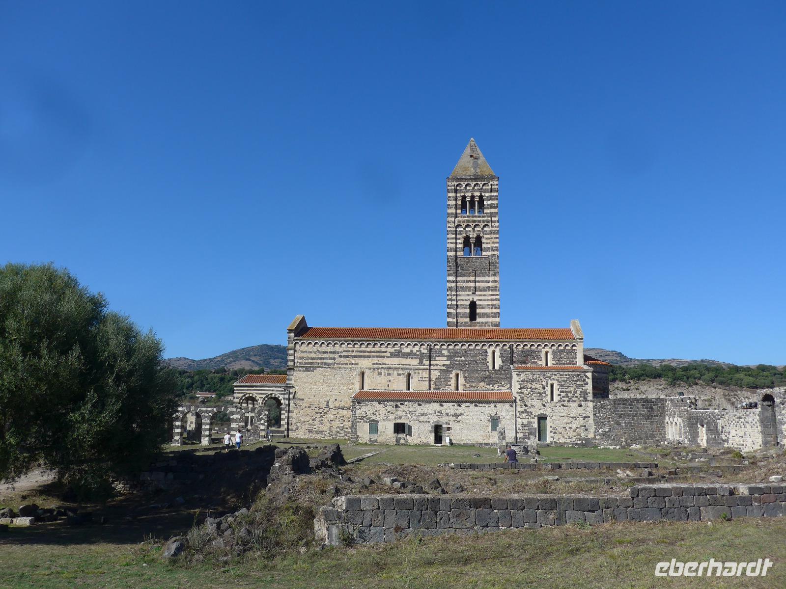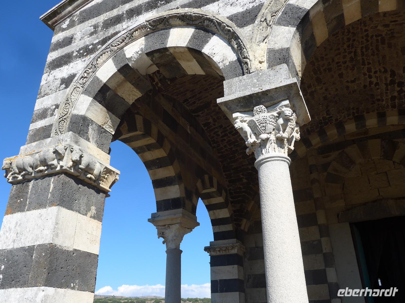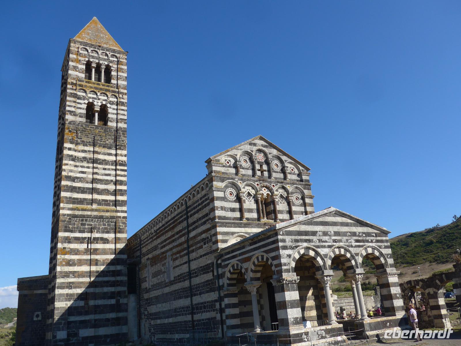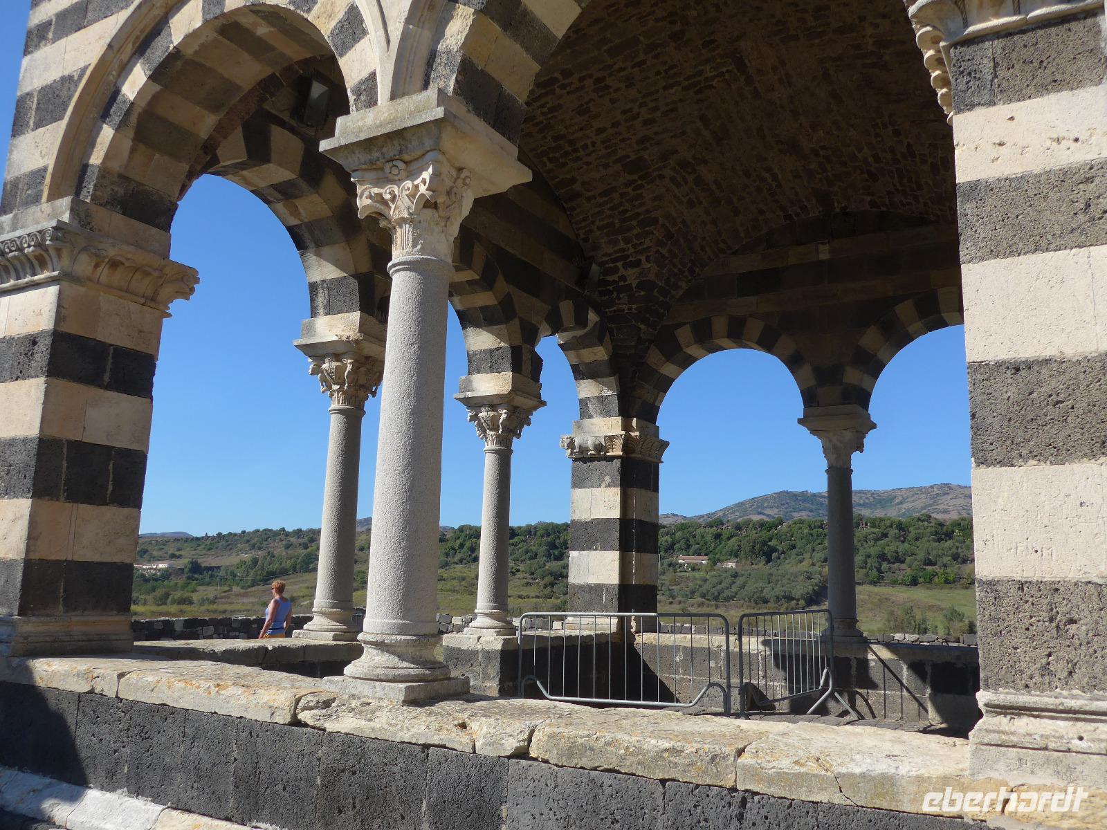 Schnell waren die Koffer eingeladen, die Plätze im Bus verteilt und dann konnte unsere Reise von Olbia nach Alghero beginnen. Unterwegs machten wir Halt bei der Kirche Santissima Trinita di Saccargia. Zum Komplex gehörte einst noch ein Kloster und die Kirche wurde von pisanischen Baumeistern 1116 errichtet. Helle Kalksteine und dunkle Lavasteine wurden abwechselnd verbaut und so entstand das interessante Streifenmuster. Die Apsis der Kirche weist eine noch gut erhaltene Freskenmalerei auf. An den Säulen sind fantastische Fabelwesen und Kühe abgebildet.