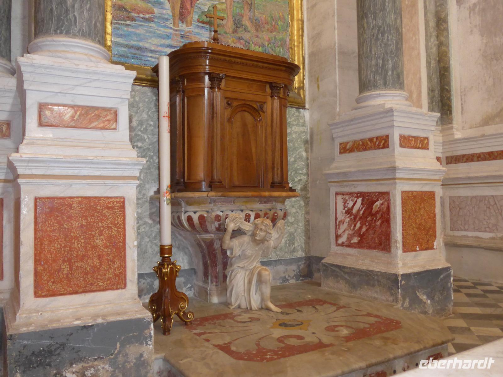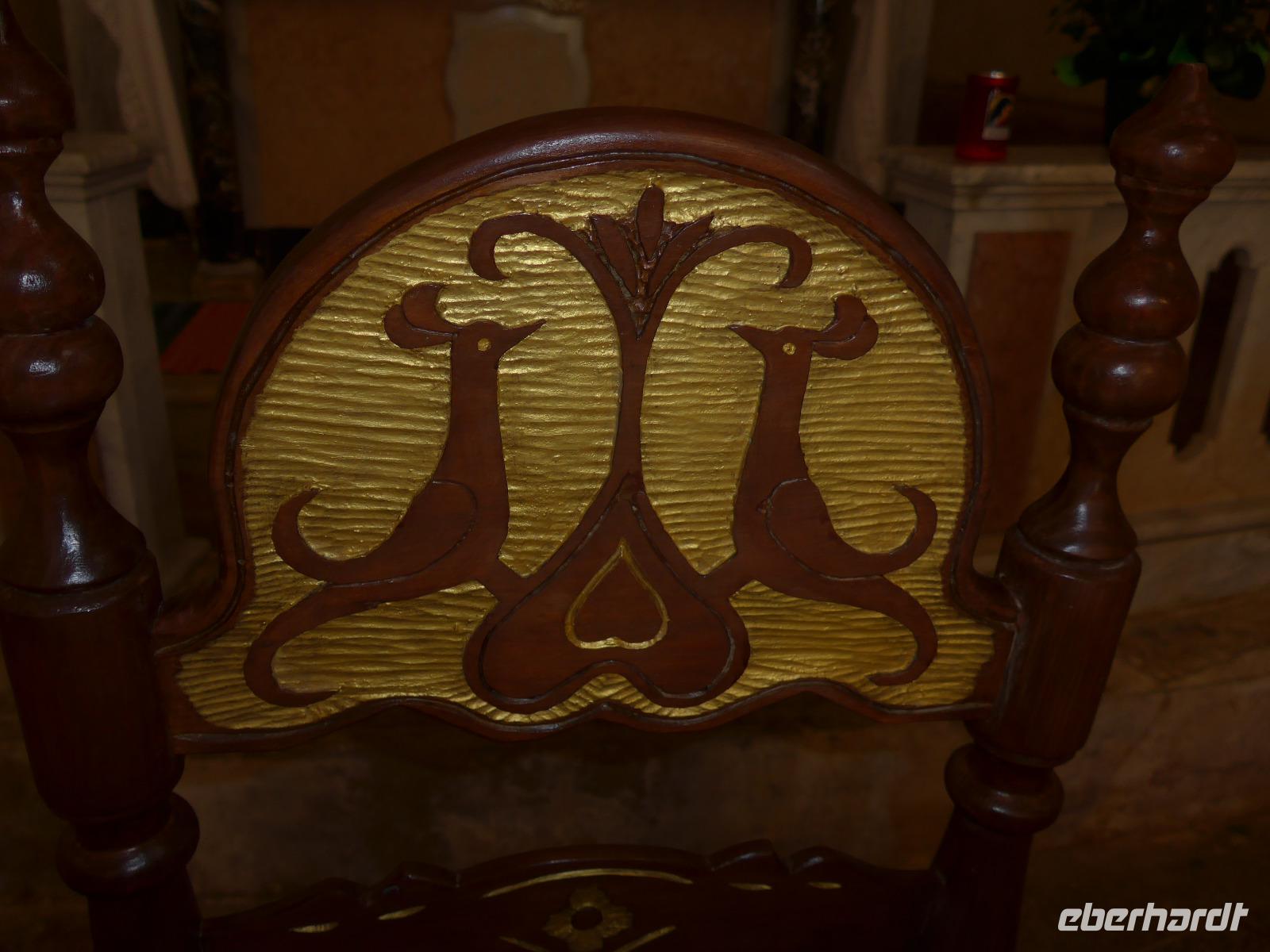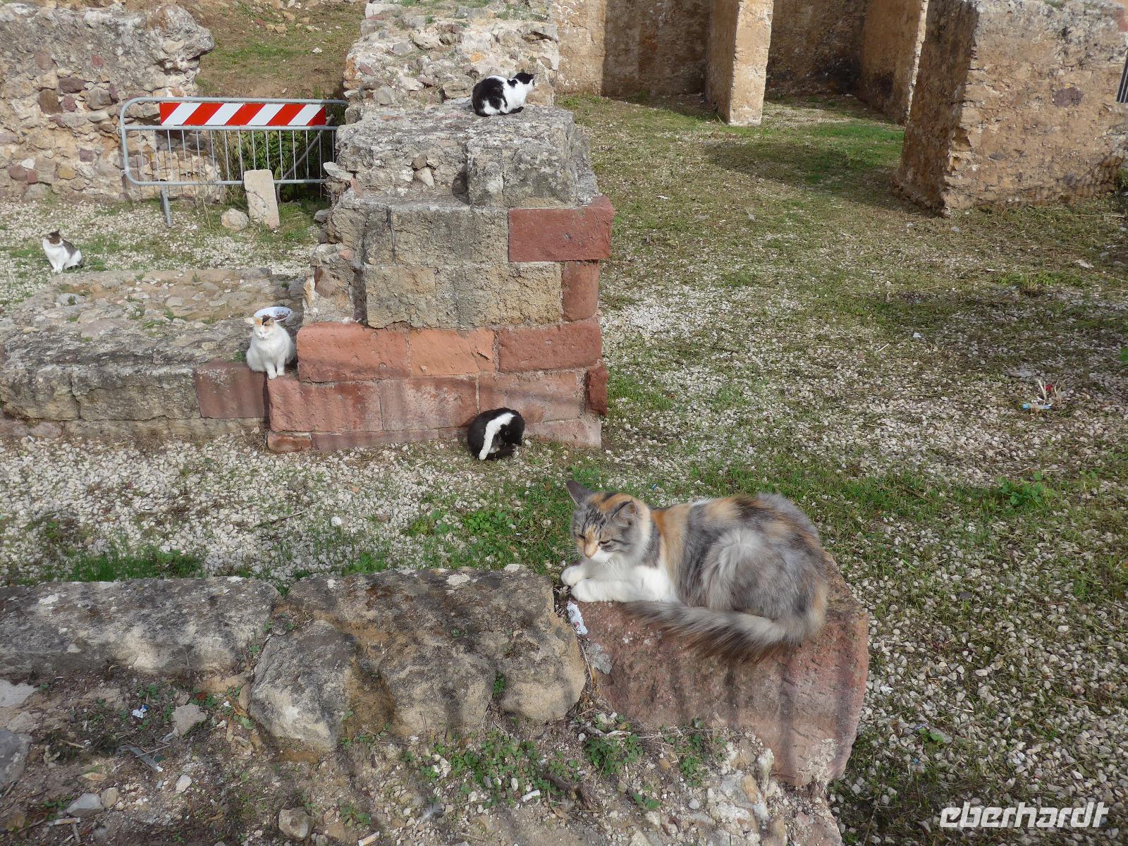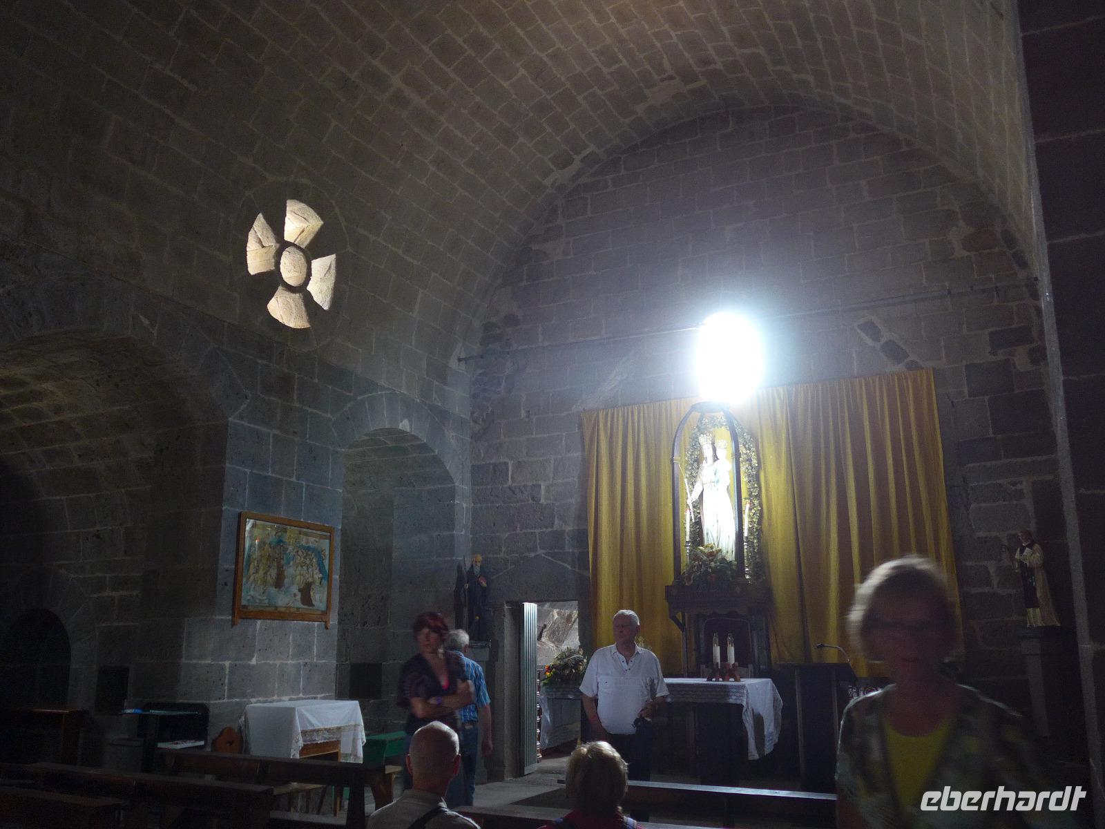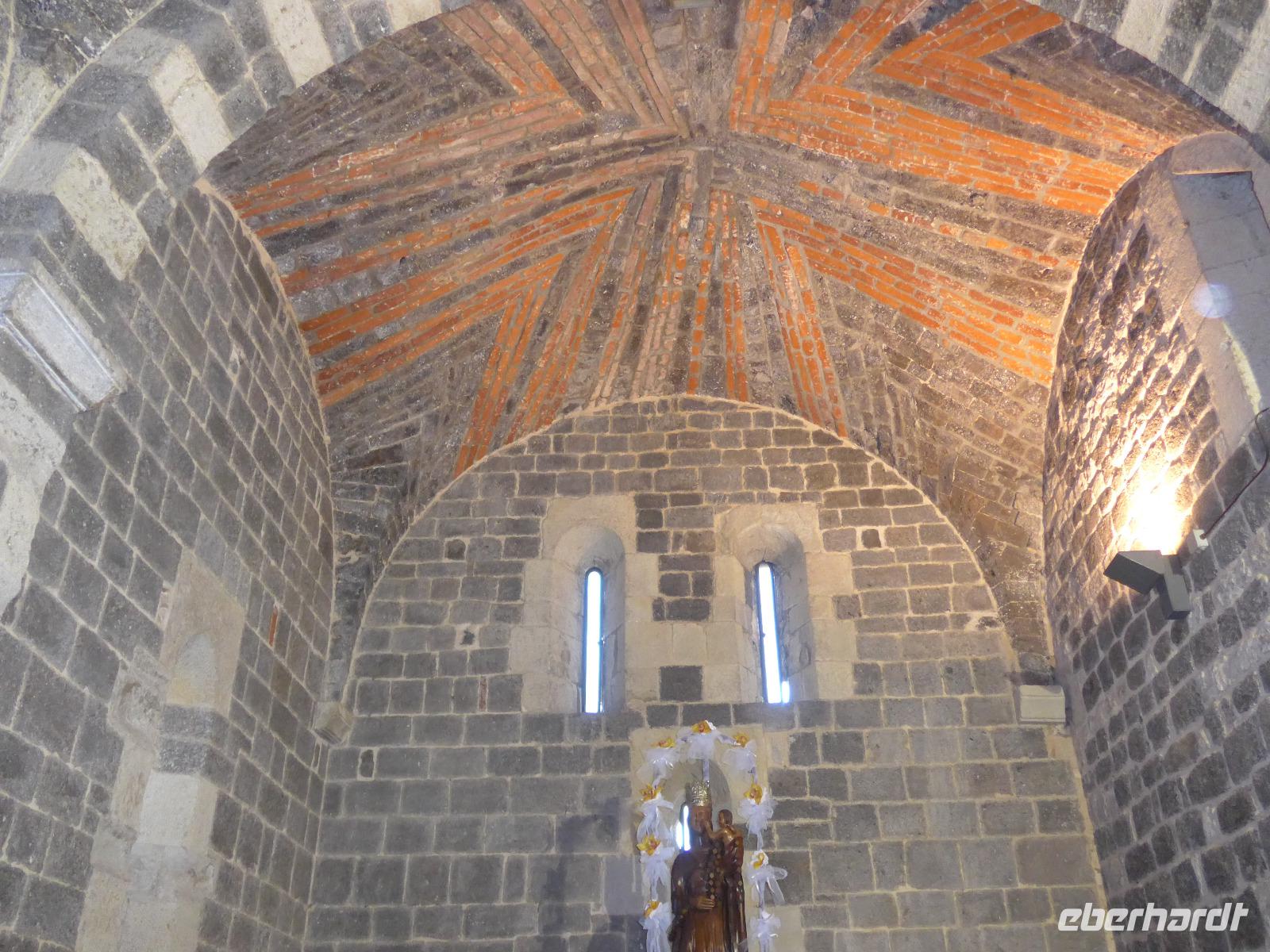 Schnell waren die Koffer eingeladen, die Plätze im Bus verteilt und dann konnte unsere Reise von Olbia nach Alghero beginnen. Unterwegs machten wir Halt bei der Kirche Santissima Trinita di Saccargia. Zum Komplex gehörte einst noch ein Kloster und die Kirche wurde von pisanischen Baumeistern 1116 errichtet. Helle Kalksteine und dunkle Lavasteine wurden abwechselnd verbaut und so entstand das interessante Streifenmuster. Die Apsis der Kirche weist eine noch gut erhaltene Freskenmalerei auf. An den Säulen sind fantastische Fabelwesen und Kühe abgebildet.