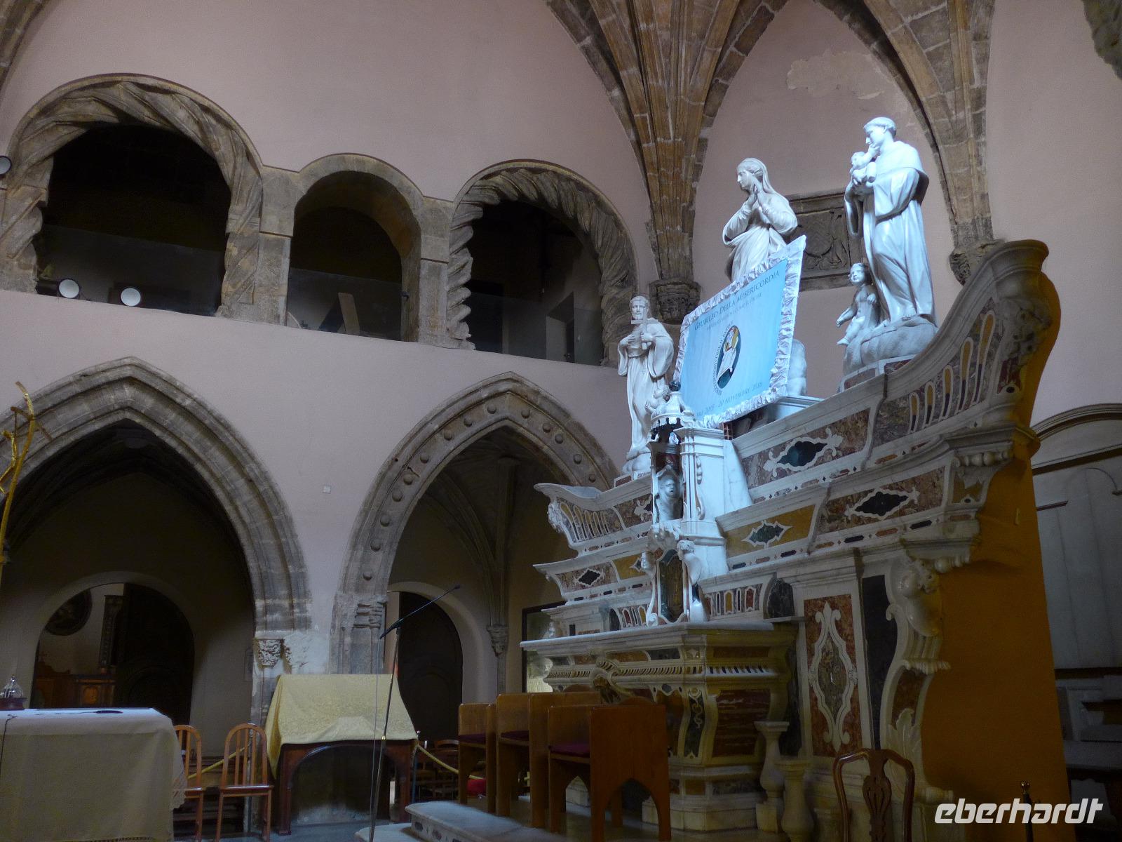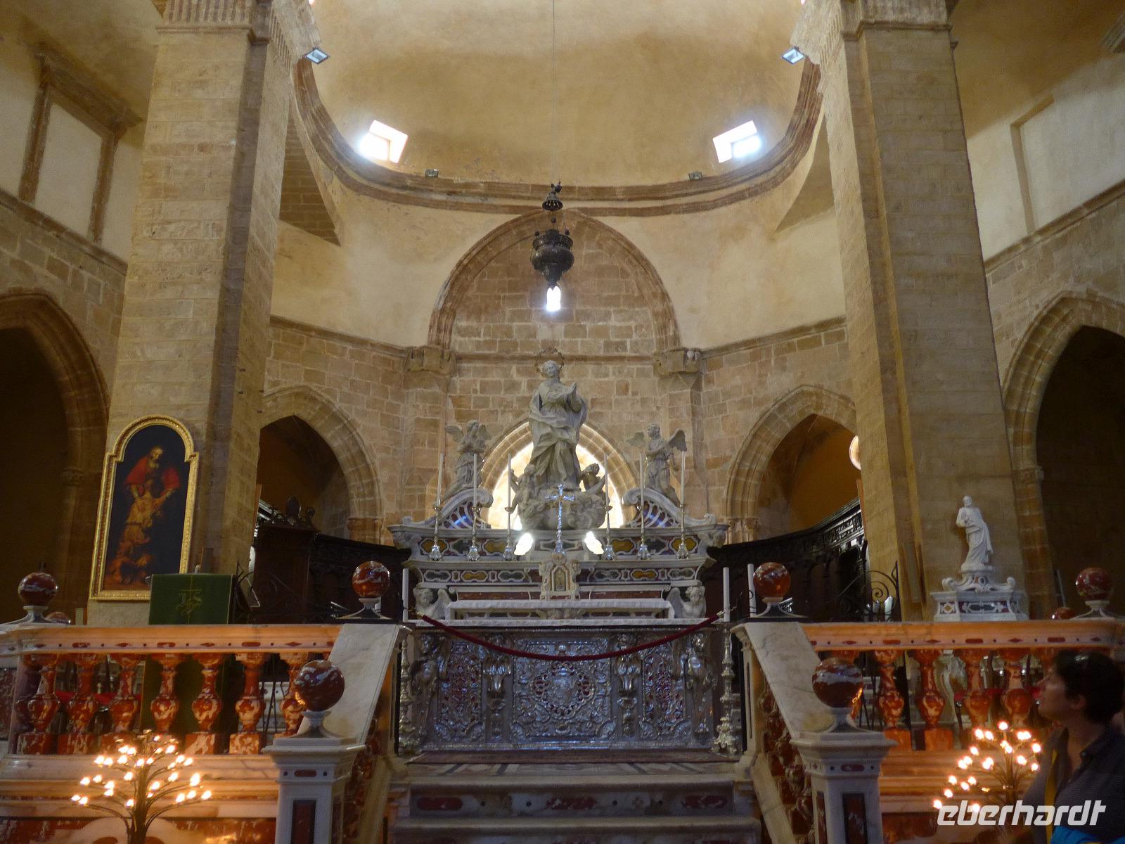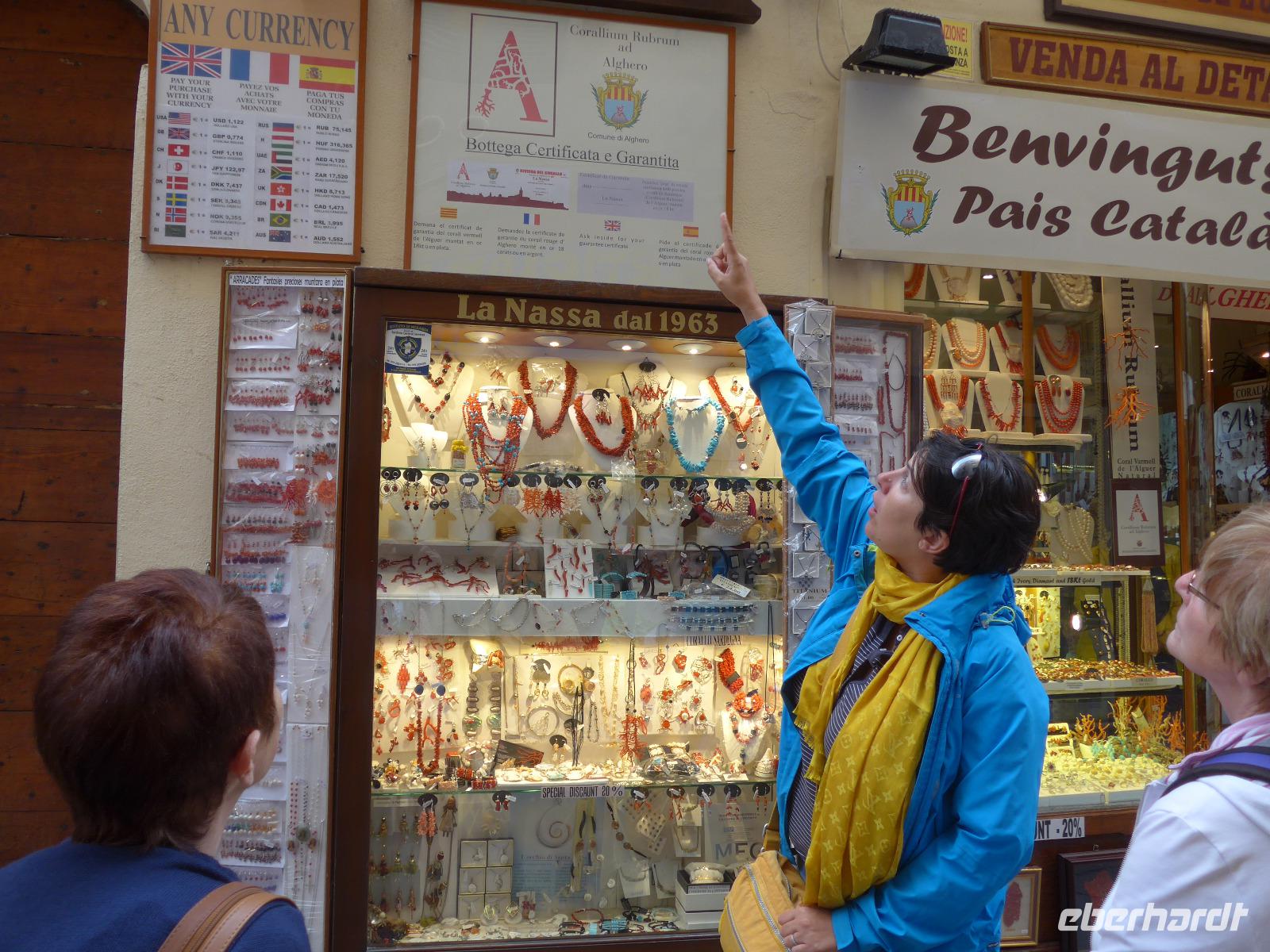 Schon beim Frühstück trafen wir unsere Reiseleiterin Elisabetta, die uns die nächsten 5 Tage auf "ihrer" Insel Sardinien begleiten wird. Mit unserem Bus fuhren wir dann nach Alghero und Elisabetta erzählte uns schon im Bus vieles zur Gegend um Alghero und zur Stadt selbst. Am Hafen verliessen wir den Bus und gingen zu Fuß weiter durch das Stadttor hinein in die gut erhaltene Altstadt. Zuerst besuchten wir die Kirche des Hl. Franziskus mit dem Kreuzgang. Dann folgten wertvolle Tipps zum Kauf von Korallen und Elisabetta zeigte uns einige sehr schöne Geschäfte. Eine Pause machten wir am Cafe Ciro, wo es alles gab, was das "Nasch" Herz begeehrte. Wir spazierten durch die Gassen, entlang der Strandpromenade und zum Dom, den wir auch innen besichtigten. Ich sammelte das Geld für unsere Bootsfahrt am Nachmittag ein und kaufte in der Mittagspause die Tickets.