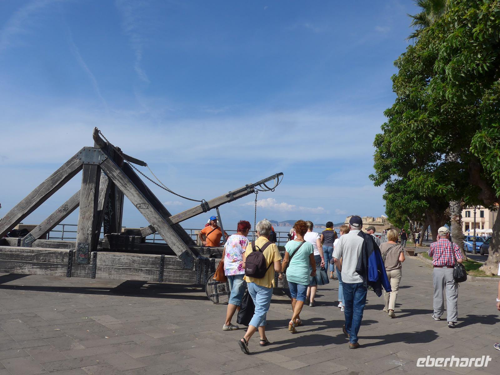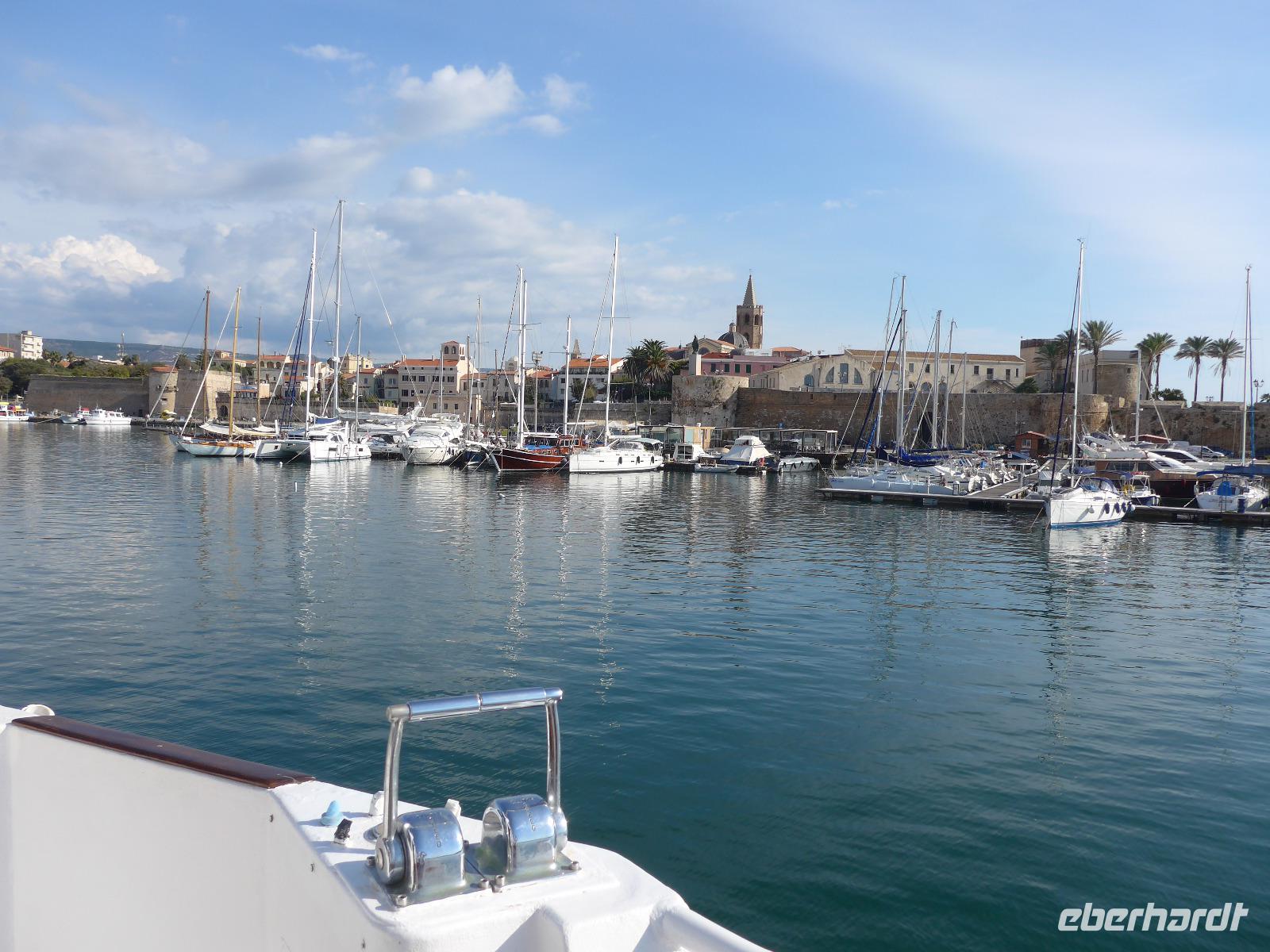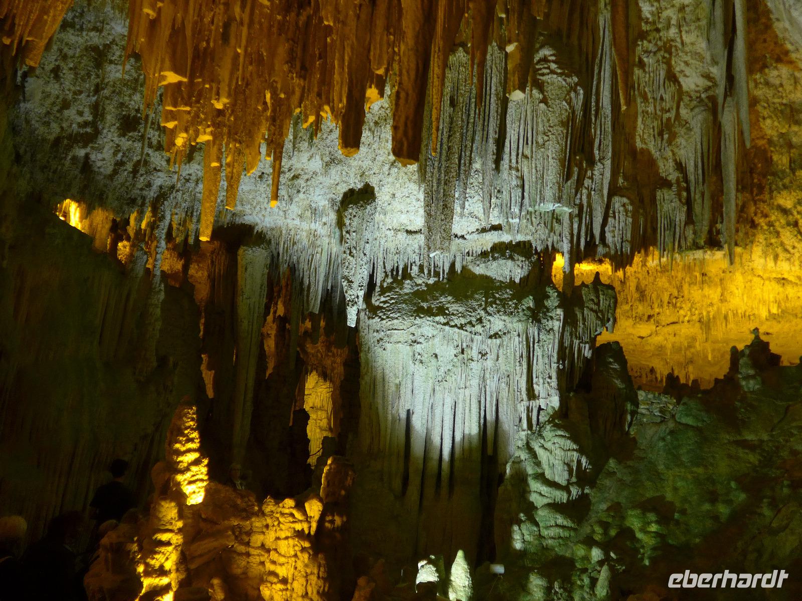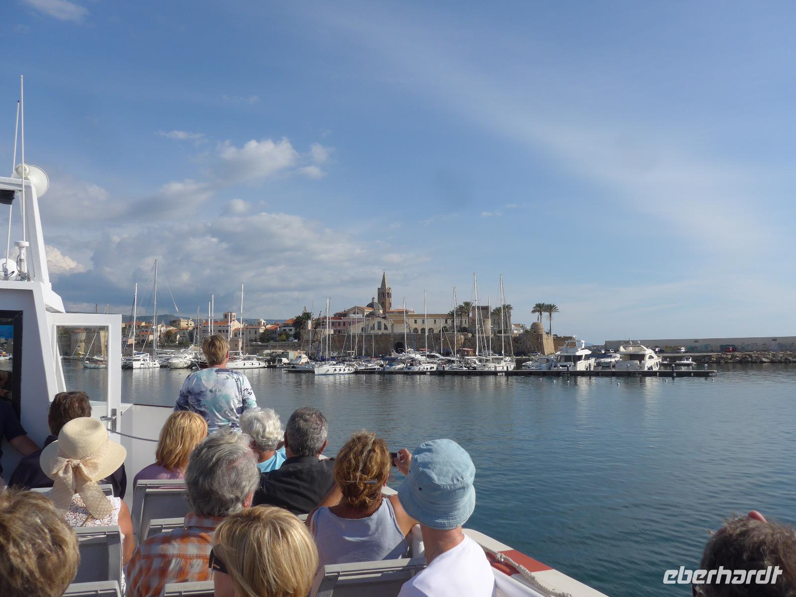 Gegen 14 Uhr begann bei herrlichem Sonnenschein die Bootsfahrt von Alghero zur Neptungrotte am Capo Caccia. Wir saßen am Oberdeck und hatten gute Sicht auf die Küste und die Felsen mit grottesken Formen. Es gab Erklärungen in mehreren Sprachen und schließlich erreichten wir die Neptungrotte. Dort war schon ein anderes Boot angekommen und über die Treppen strömten viele Besucher vom 110 m höher liegenden Parkplatz ebenfalls zur Grotte. Ganz schnell sortierte sich aber alles und wir begannen unseren Rundgang auf einem gut angelegten Weg wieder mit guten Erläuterungen zur Neptungrotte und zu den bizarren Formen. Es war genügend Zeit alles genau zu betrachten und zu fotografieren bei dem langsamen Tempo. Dann stiegen wir wieder auf unser Boot und fuhren zurück nach Alghero. Die Stadt vom Wasser aus zu sehen, war ein perfekter Abschluß unseres Ausfluges.