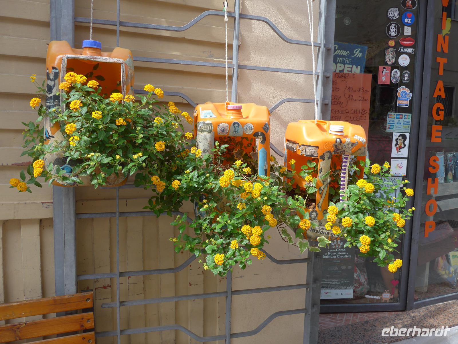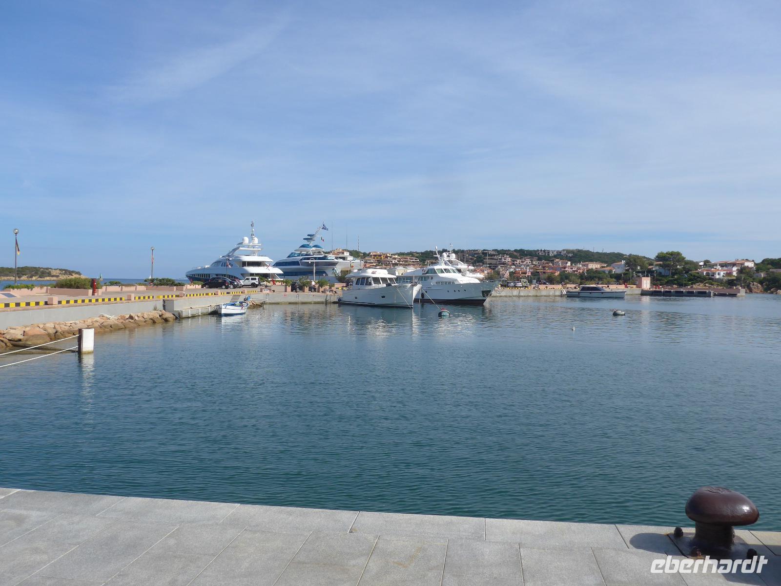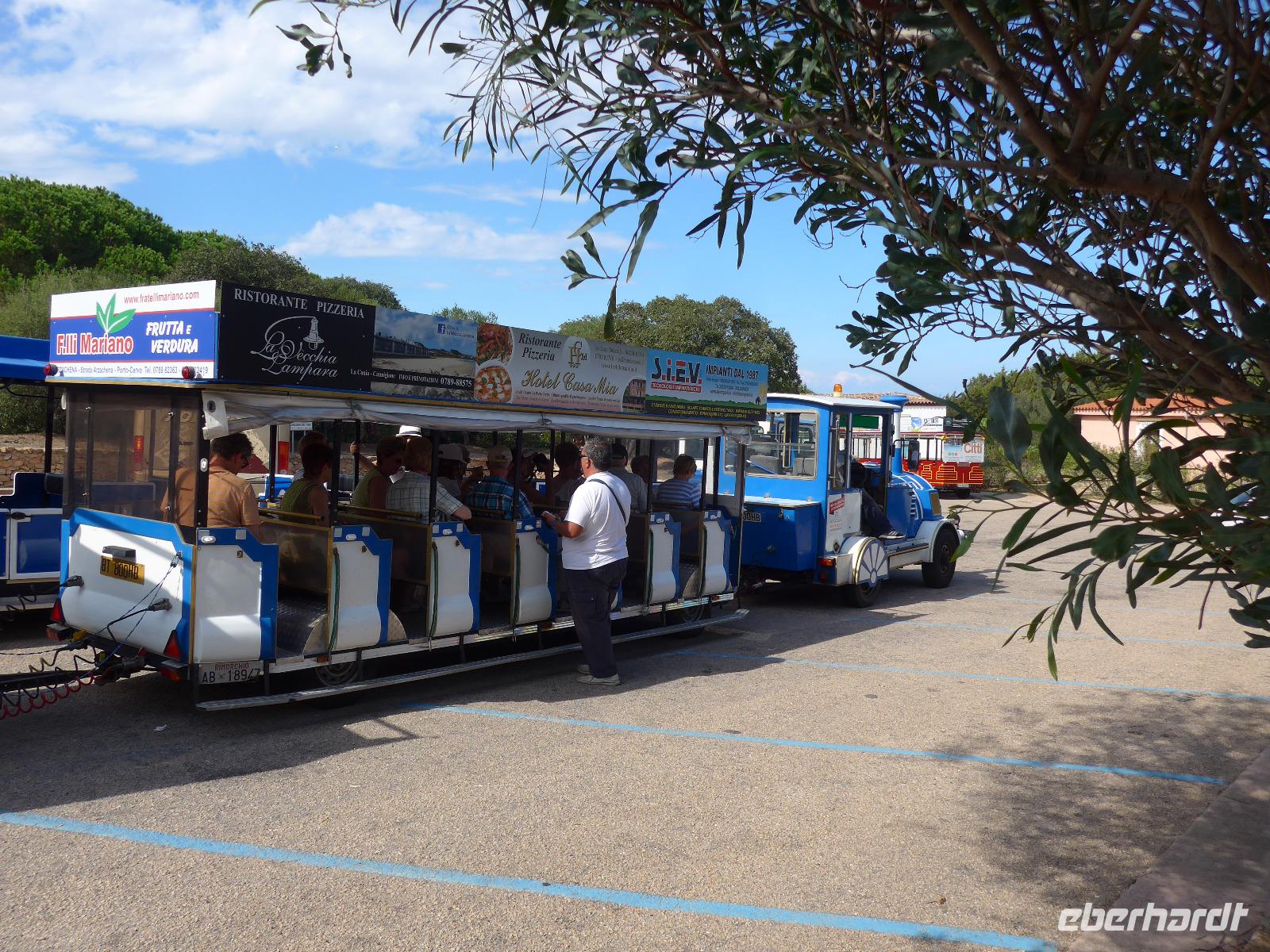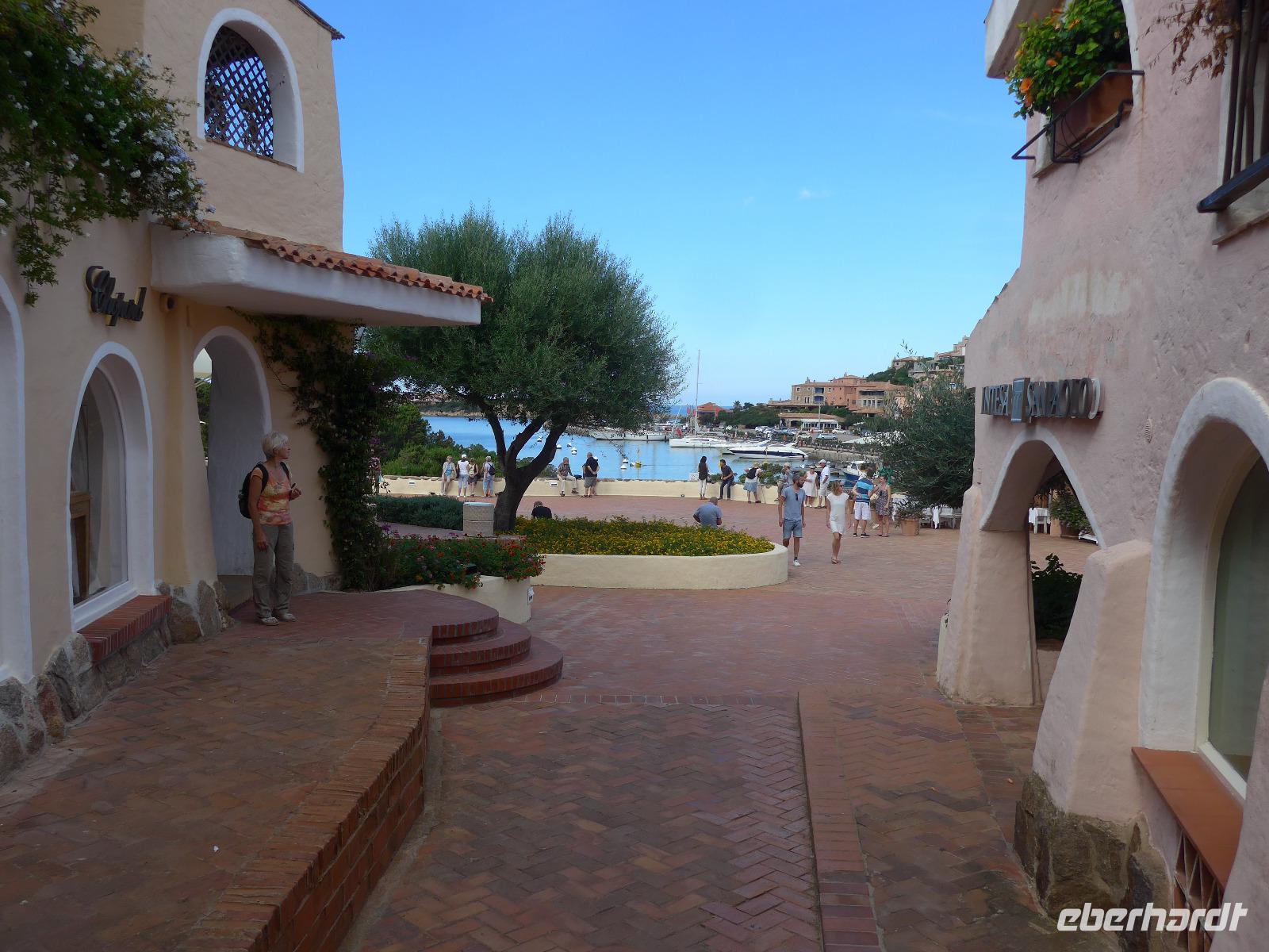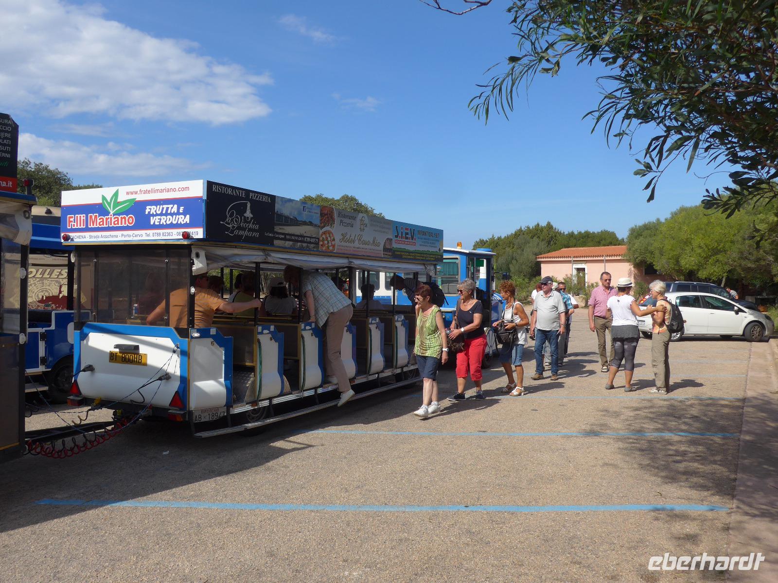 Unser Bus brachte uns zum Parkplatz außerhalb von Porto Cervo und dort stiegen wir um in eine kleine Bimmelbahn. In gemütlichem Tempo und mit guten Erklärungen auf deutsch "erkundeten" wir das touristische Zentrum Porto Cervo mit Yachthafen, Hotels und vielen Villen, wo schon die Eingangstore ein Vermögen kosten. Die Häuser sind alle niedrig und im gleichen Stil gebaut und verleihen dem Ort etwas Edles. Am Ende der Rundfahrt hatten wir noch Zeit, in einem kleinen Einkaufszentrum einen Cafe zu trinken oder die Geschäfte zu besuchen. Danach fuhren wir nach Baia Sardinia, ebenfalls ein Touristenort aber mit günstigeren Preisen. Im Schutz einer breiten Bucht mit kristallklarem Wasser und schönen Stränden läßt es sich dort gut Urlaub machen. Wir probierten das berühmte Mirten-Eis und schlenderten durch die zahlreichen Geschäfte.