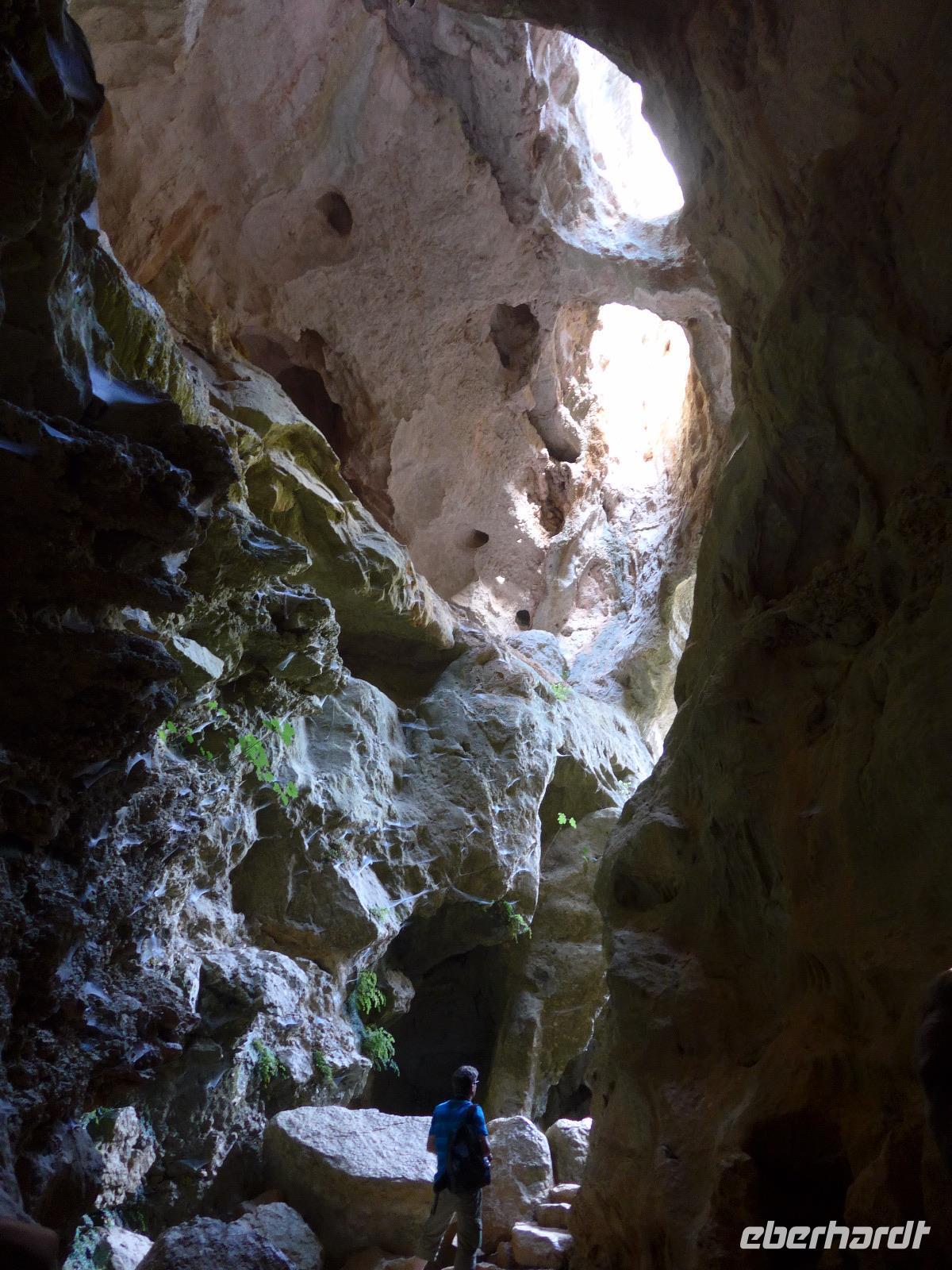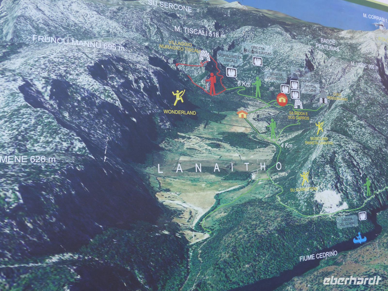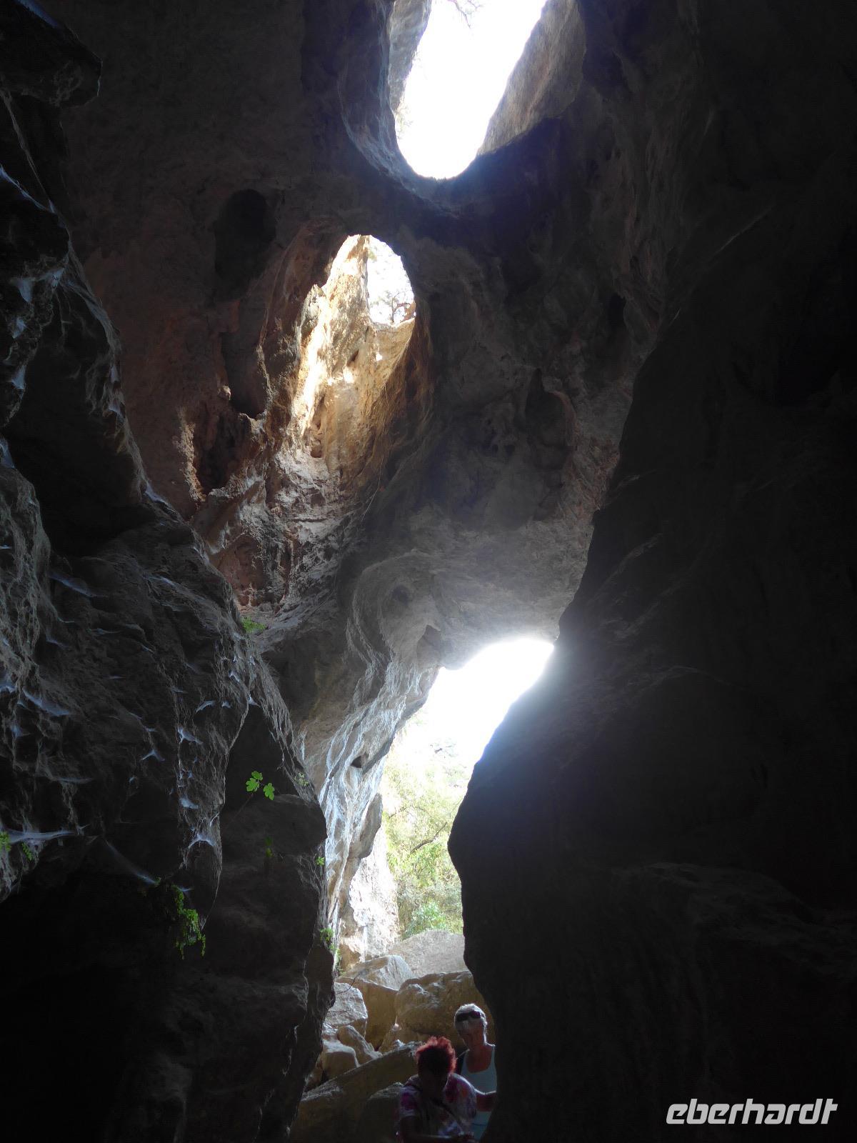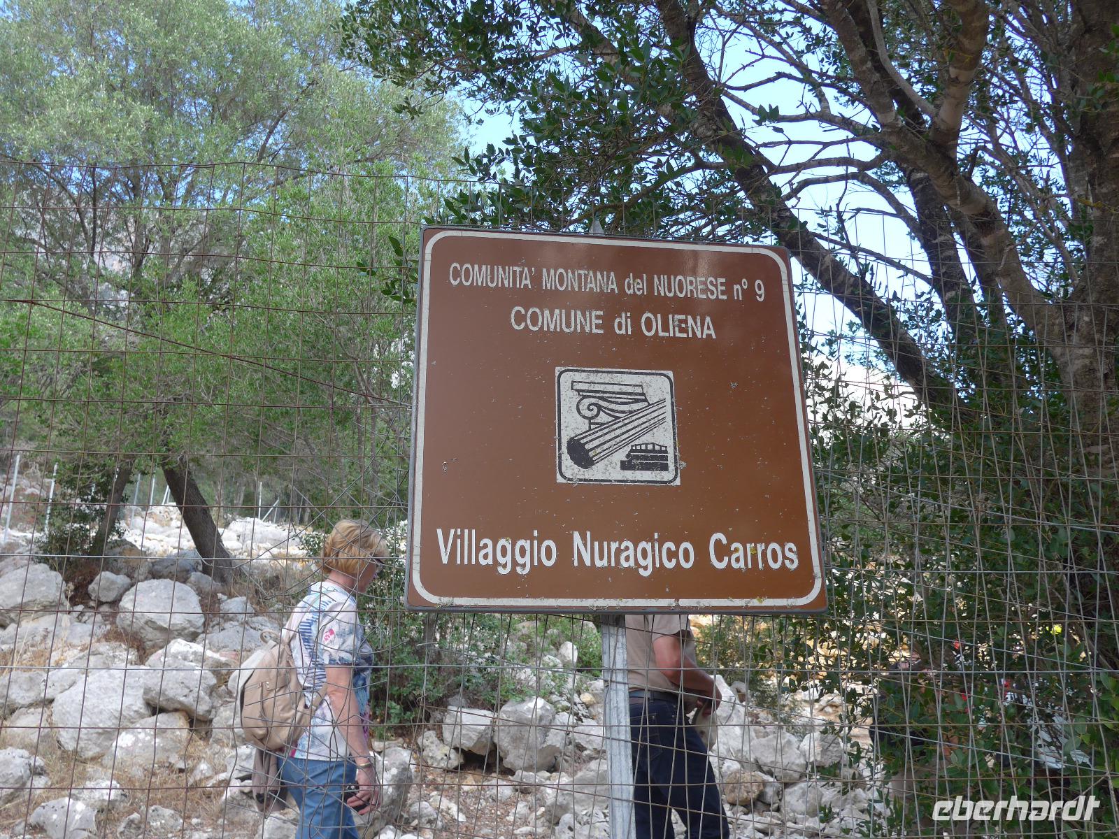 Nach dem Frühstück erwartete uns schon Robin, ein Wanderführer und unser Reriseleiter für das Lanaittu Tal. Auf der Schnellstrasse fuhren wir nach Süden und machten eine Kaffeepause an einer Raststätte bei der Abfahrt. Am Beginn der Lanaittu Tals standen dann 3 Jeeps bereit und wir stiegen um. Auf aussichtsreicher Strasse fuhren wir weit in das Teil hinein und hielten am Besucherzentrum. Von da gingen wir zu Fuß hinauf zum Nuraghendorf Soss Carros, das vor ca. 3500 Jahren entstand. Der Platz wurde bewußt gewählt im Schutz der hohen Felsen und unweit einer Wasserquelle. Robin machte mit uns eine beeindruckende Führung und wies uns auf die wichtigen Details hin. Sogar unser Fahrer Gigi war mit uns hinauf gegangen. Danach besuchten wir die Grotte Sa Oche und wir stiegen hinunter in das Felslabyrint. 1 bis 2 mal im Jahr füllt sich die Grotte bei starkem Regen mit Wasser soweit, das das Wasser sogar durch den hoch gelegenen Eingangsbereich herausfließt. Das muß sehr beeindruckend sein und man kann dieses "Schauspiel" auch nur aus sicherer Entfernung beobachten. Am Besucherzentrum gab es Kaffee und Toiletten und dann fuhren wir zur Mittagspause.
