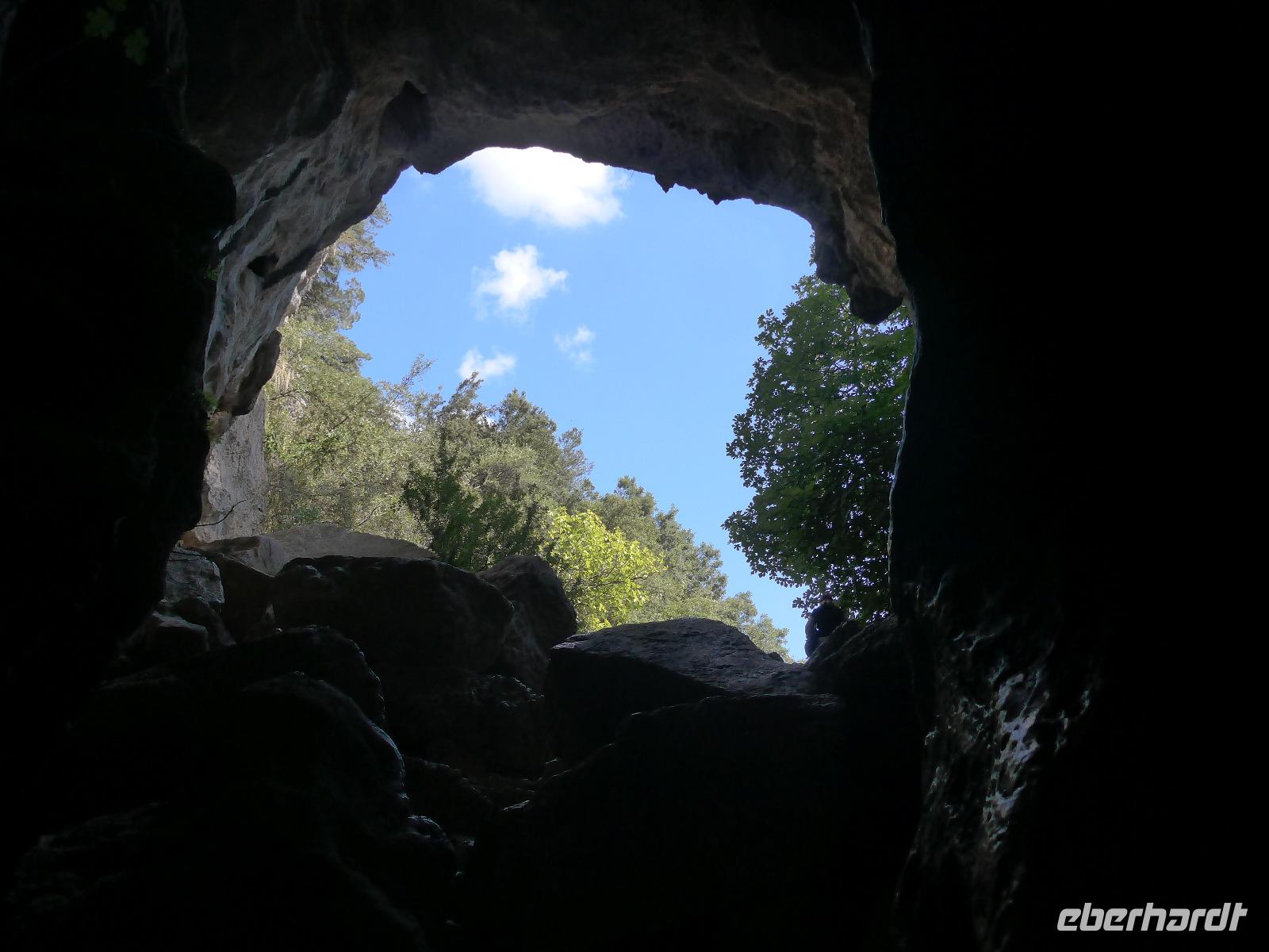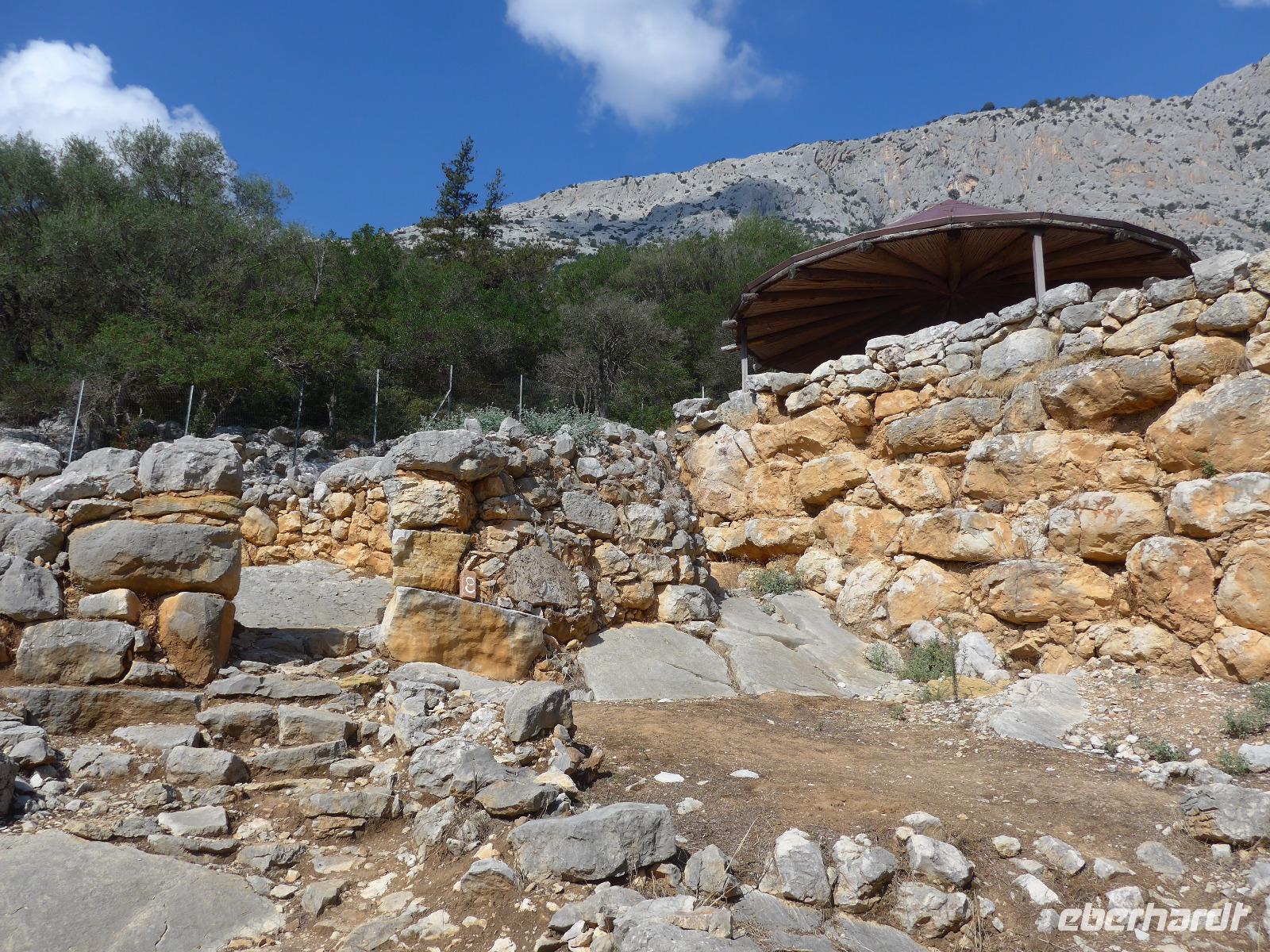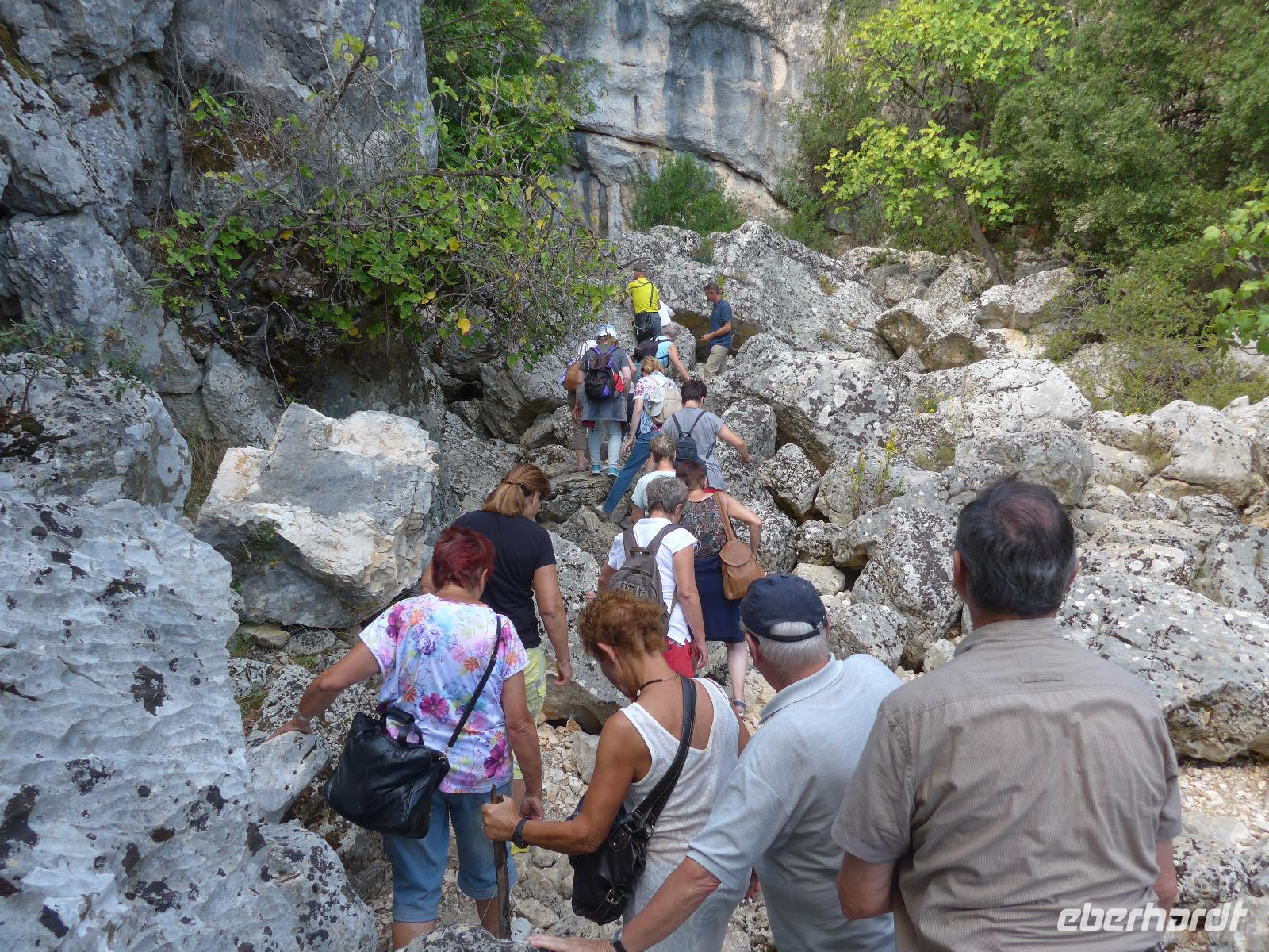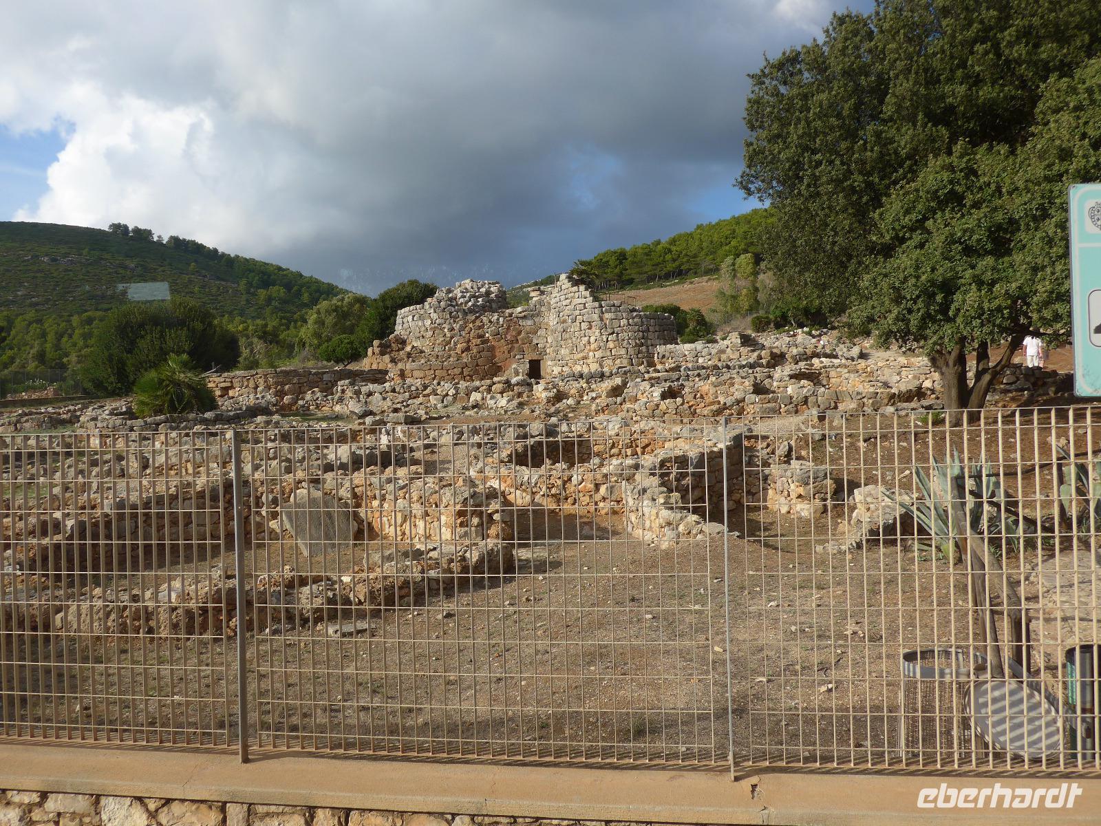 Nach dem Frühstück erwartete uns schon Robin, ein Wanderführer und unser Reriseleiter für das Lanaittu Tal. Auf der Schnellstrasse fuhren wir nach Süden und machten eine Kaffeepause an einer Raststätte bei der Abfahrt. Am Beginn der Lanaittu Tals standen dann 3 Jeeps bereit und wir stiegen um. Auf aussichtsreicher Strasse fuhren wir weit in das Teil hinein und hielten am Besucherzentrum. Von da gingen wir zu Fuß hinauf zum Nuraghendorf Soss Carros, das vor ca. 3500 Jahren entstand. Der Platz wurde bewußt gewählt im Schutz der hohen Felsen und unweit einer Wasserquelle. Robin machte mit uns eine beeindruckende Führung und wies uns auf die wichtigen Details hin. Sogar unser Fahrer Gigi war mit uns hinauf gegangen. Danach besuchten wir die Grotte Sa Oche und wir stiegen hinunter in das Felslabyrint. 1 bis 2 mal im Jahr füllt sich die Grotte bei starkem Regen mit Wasser soweit, das das Wasser sogar durch den hoch gelegenen Eingangsbereich herausfließt. Das muß sehr beeindruckend sein und man kann dieses "Schauspiel" auch nur aus sicherer Entfernung beobachten. Am Besucherzentrum gab es Kaffee und Toiletten und dann fuhren wir zur Mittagspause.