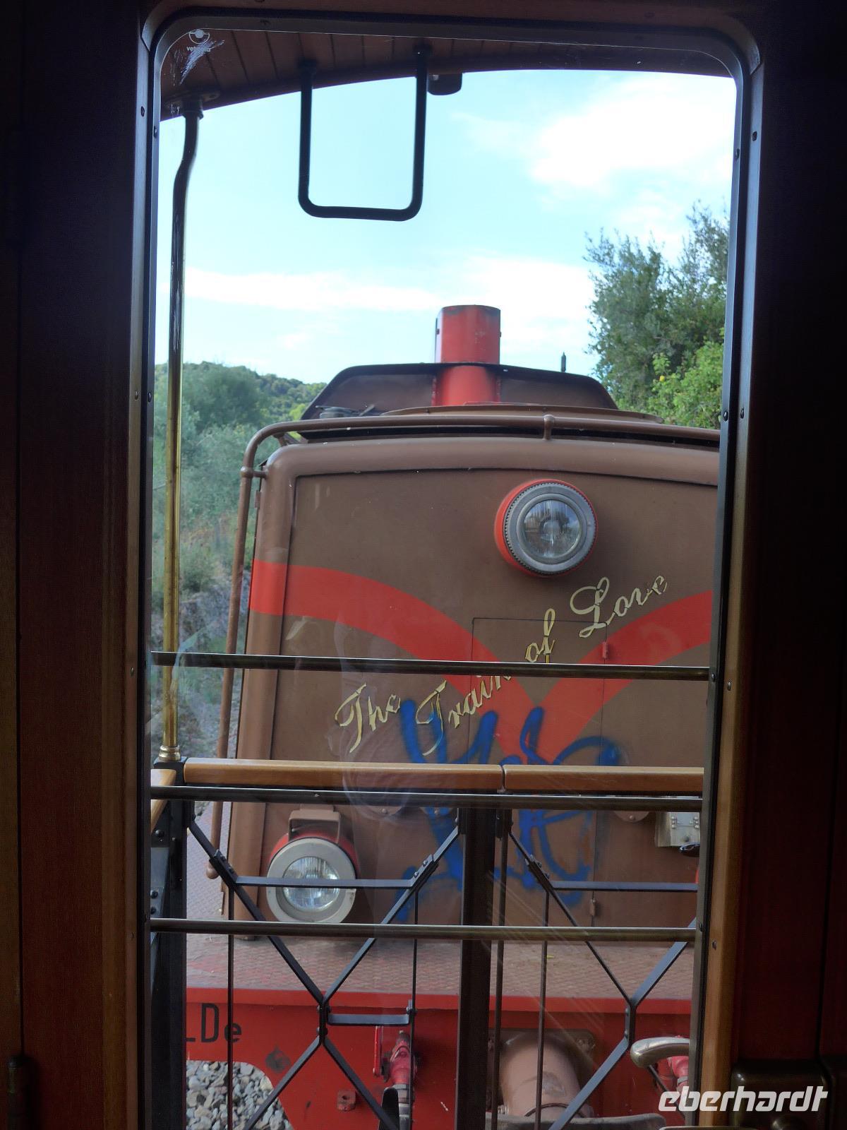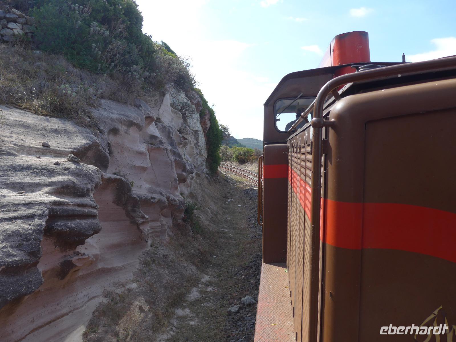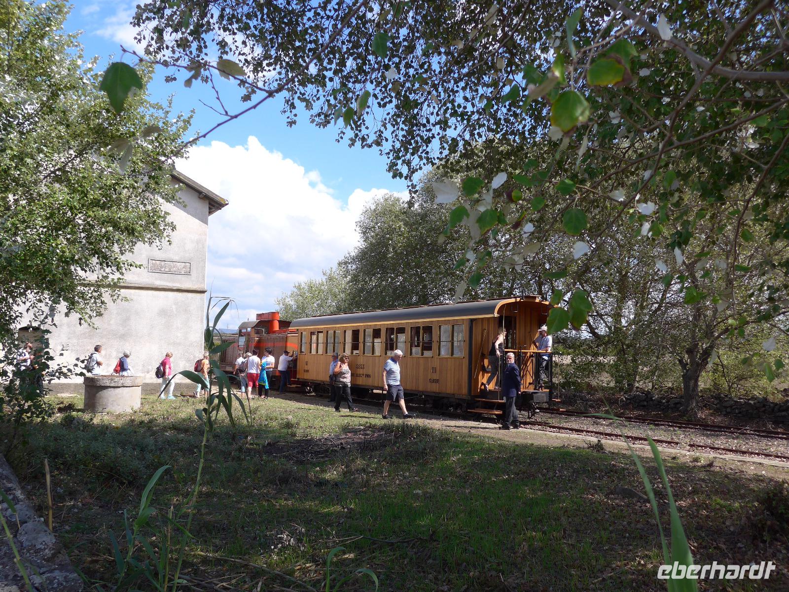 Nach dem Frtühstück fuhren wir zunächst wieder nach Alghero und von dort auf der aussichtsreichen Küstenstrasse gen Süden nach Bosa. Vom Parkplatz liefen wir über die Brücke in die Altstadt, machten eine Kaffeepause und danach einen Rundgang durch die alten Gassen. Dabei informierte uns Elisabetta über die Malariaplage und deren Bekämpfung durch die Amerikaner und zeigte uns Stickereien, die hier noch immer von einigen Frauen angefertigt werden. Es gab viel zu fotografieren und zu sehen. Unser Bus brachte uns danach ein kleines Stück bis zum Ausgangspunkt des Traditionszuges Trenino Verde. Wir mußten aber das erste Stück im "Schienenersatzverkehr" zurücklegen und erst am nächsten Bahnhof durften wir in den Zug einsteigen. Eine Lok und ein Waggon, beides in sehr gutem Zustand bildeten den Zug.