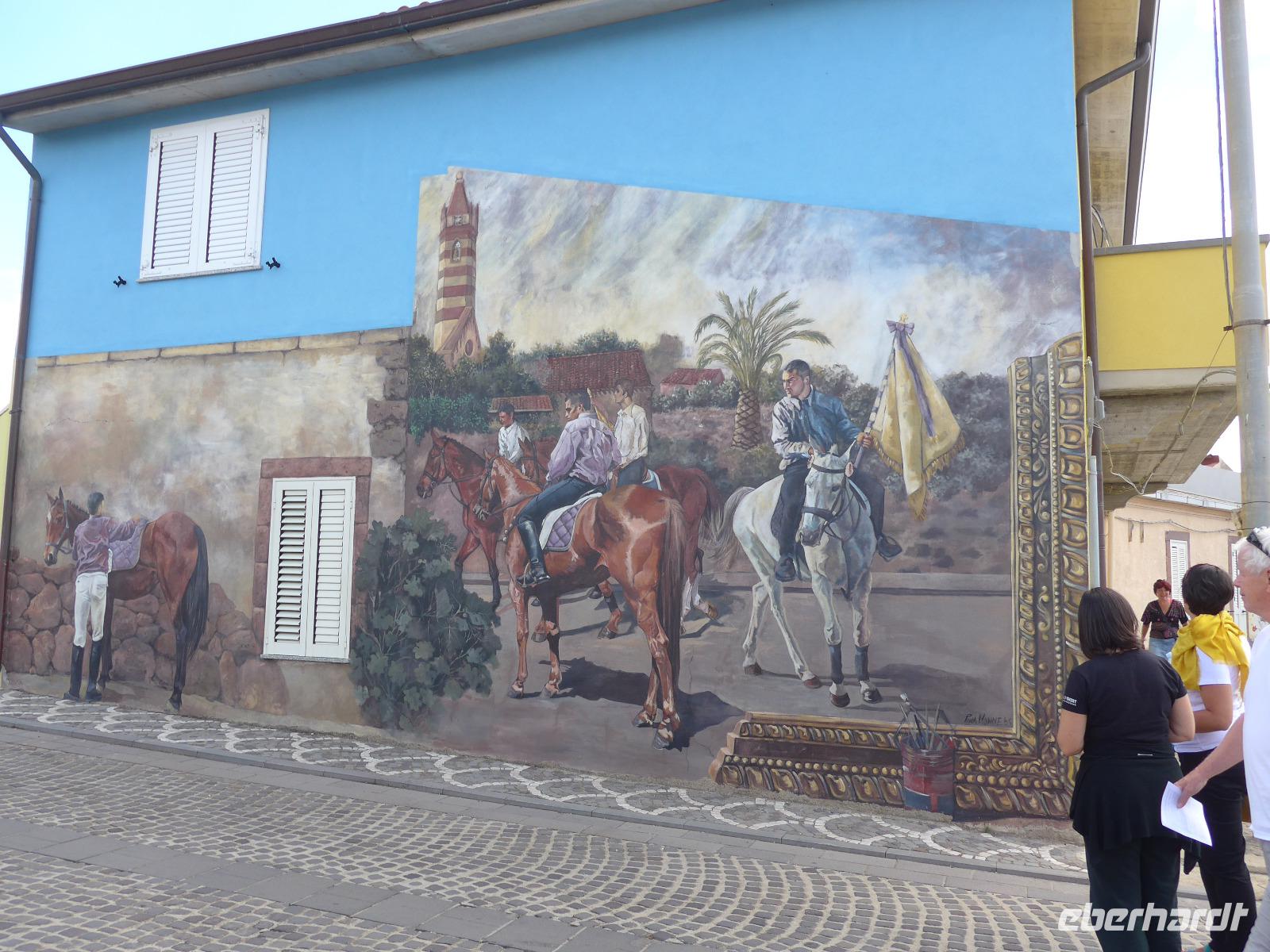 Unterwegs hielten wir zuerst in Tresnuraghes, wo es Malvasia Wein und Kekse zu probieren gab. Der nächste Stopp war in Tinnura. Wir spazierten durch den Ort und bewunderten die vielen Murales - Wandmalereien. Beim dritten Stopp ging es zur berühmten romanischen Kirche Santa Maria di Corte. Das alles ware sehr interessant, aber die Frage, ob es denn bald was zu Essen gäbe wurde immer wichtiger.