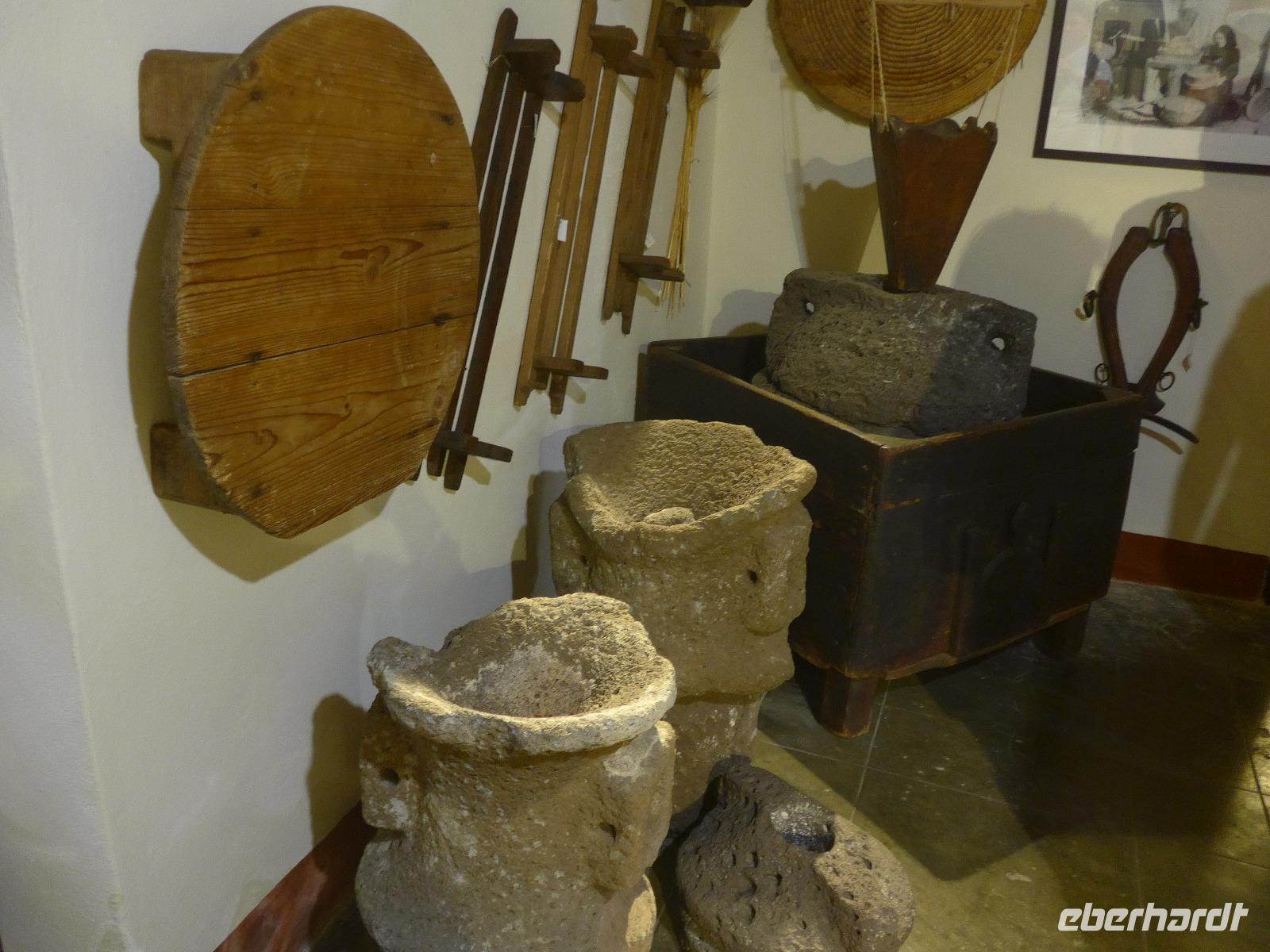 Die Endstation des Zuges war in Macomer, einem kleinen Ort mit 10 000 Einwohnern und Bahnknotenpunkt. Von hier geht es mit dem Zug bis nach Cagliari im Süden und bis nach Golfo Aranci Marittimar zum Fährhafen im Osten bei Olbia. Unser Ziel aber war das Volkskundemuseum. Es beherbergt zahlreiche geschmiedete Handwerkzeuge und Gebrauchsgegenstände des täglichen Lebens. Für uns gab es im Hof des Museums das lang ersehnte Picknick mit Fladenbrot, verschiedenem Käse, Wurst, Wein, Wasser und hausgebackenen Keksen zum Abschluß. Es war reichlich und äußerst schmackhaft und danach hatten alle wieder genügend Kraft zur Besichtigung des Museums. Inzischen hatten sich draußen die Wolken gestaut und ein Regen prasselte nieder. Gigi holte uns deshalb direkt vor der Tür mit seinem Bus ab. Zurück in unser Hotel fuhren wir über die Schnellstrasse. Beim Hotel regnete es auch nicht mehr und gingen wir nochmals schwimmen.