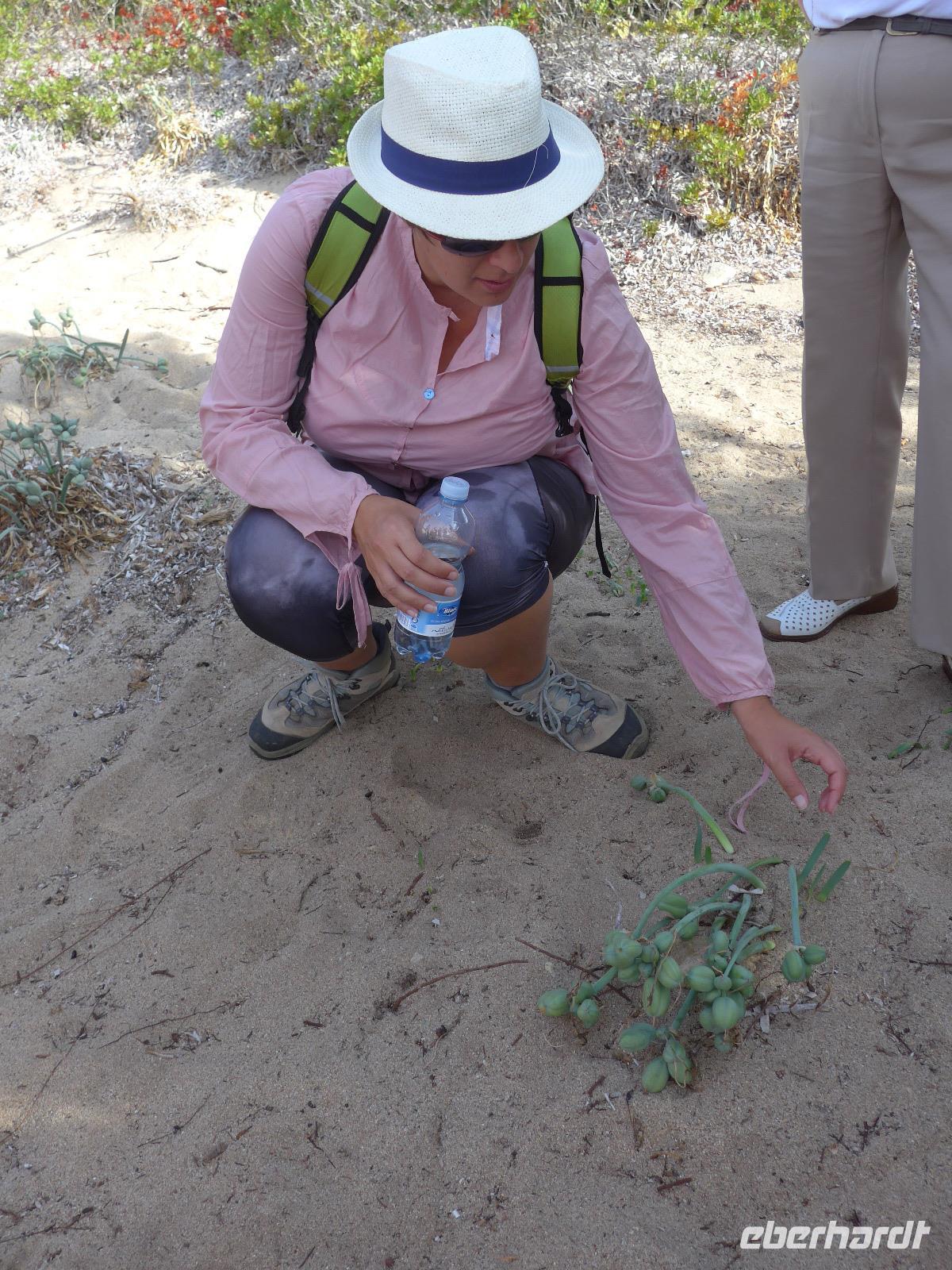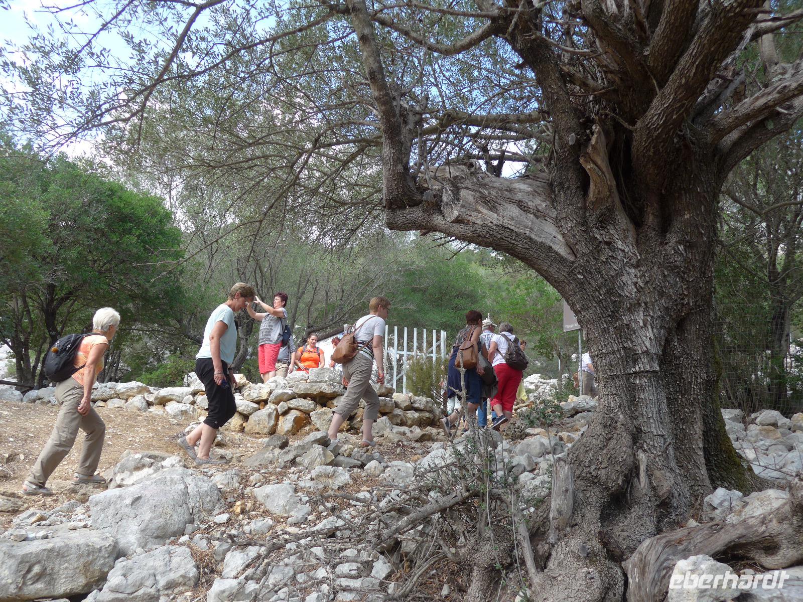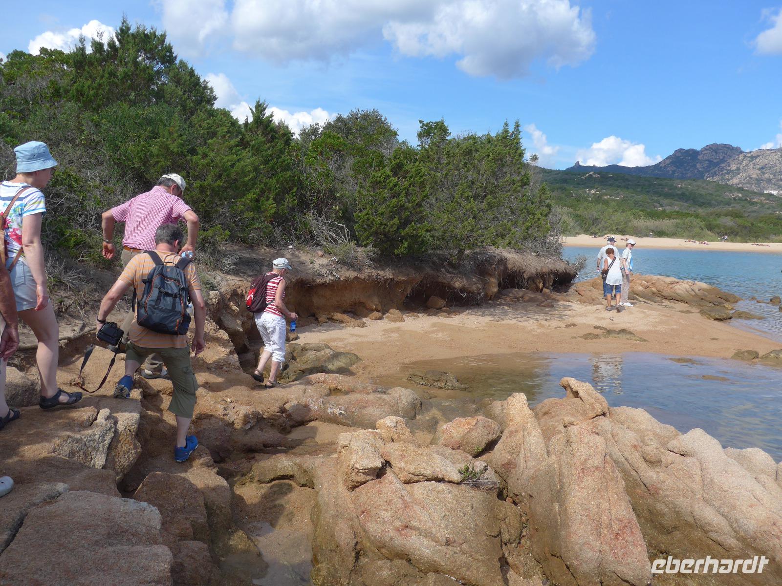 Heute fuhren wir nur ein kurzes Stück mit unserem Bus und dann ging es zu Fuß weiter hinunter an den Strand. Von Bucht zu Bucht liefen wir mal im sand direkt am glasklaren Wasser und dann wieder über Wege durch die Mittelmeermacchia und über kleine Felsen. Für eine halbe Stunde konnten wir dieses wunderbare Wasser auch zum Schwimmen nutzen. Es hätte wohl auch keiner was dagegen gehabt, den ganzen Tag an einem solch schönen Strand zu bleiben - aber das stand nicht in unserem Programm. Unterwegs sahen wir viele Pflanzen aus der Nähe und konnten auch eine geschälte Korkeiche nähe betrachten. Wir erreichten nach fast 3 Stunden Wanderung durch 8 Buchten die Cala di Volpe mit dem wohl teuersten Hotel an der Costa Smeralda. Elisabetta hatte für unsere Mittagspause ein Lokal ausgesucht, in dem das Essen vorzüglich schmeckte und auch bezahlbar war.