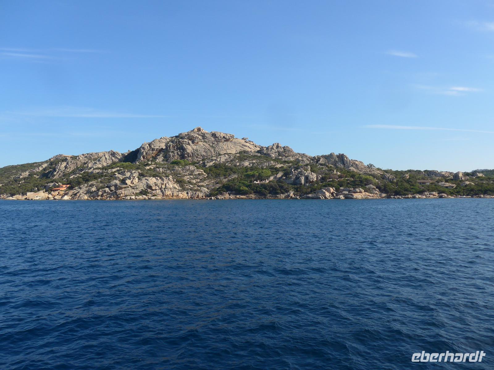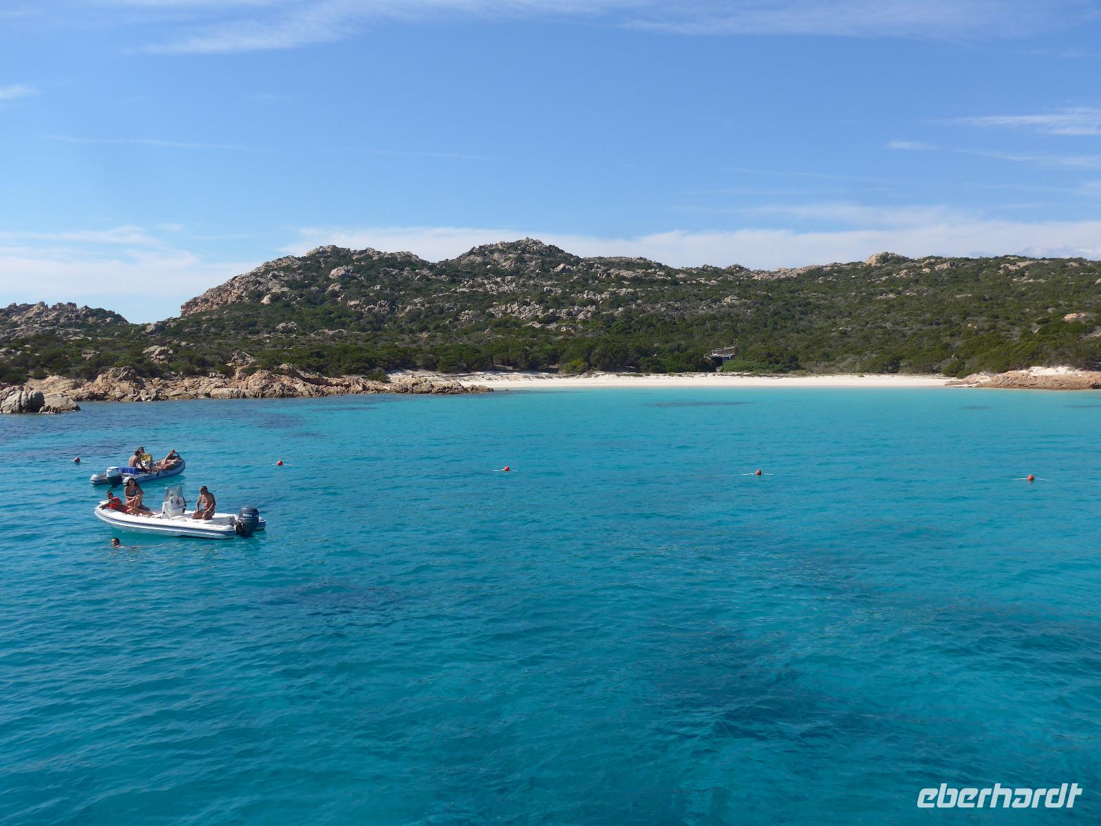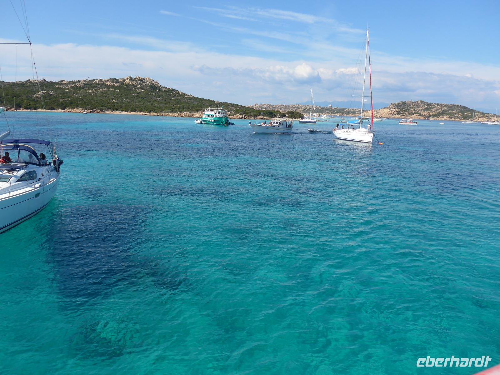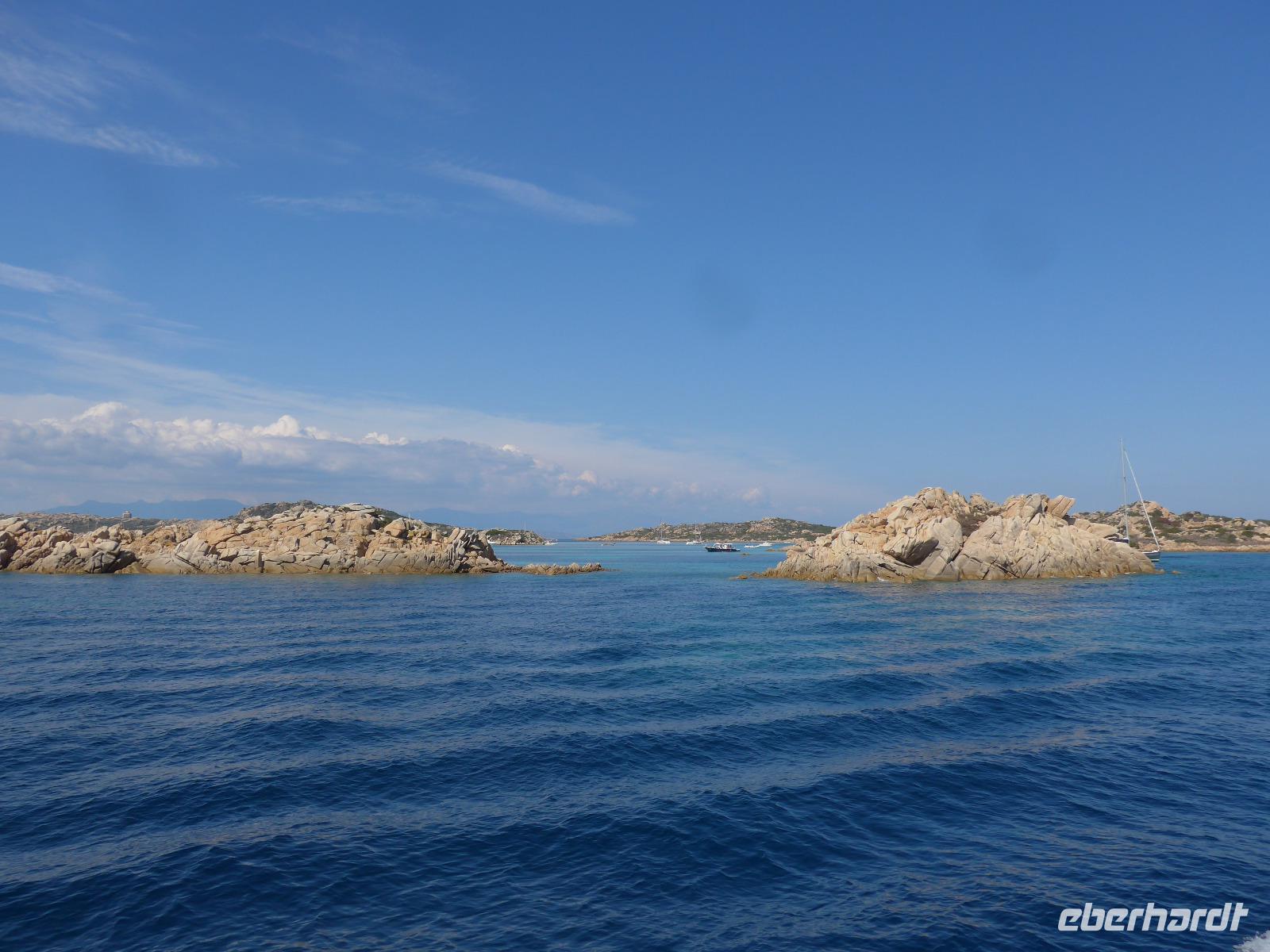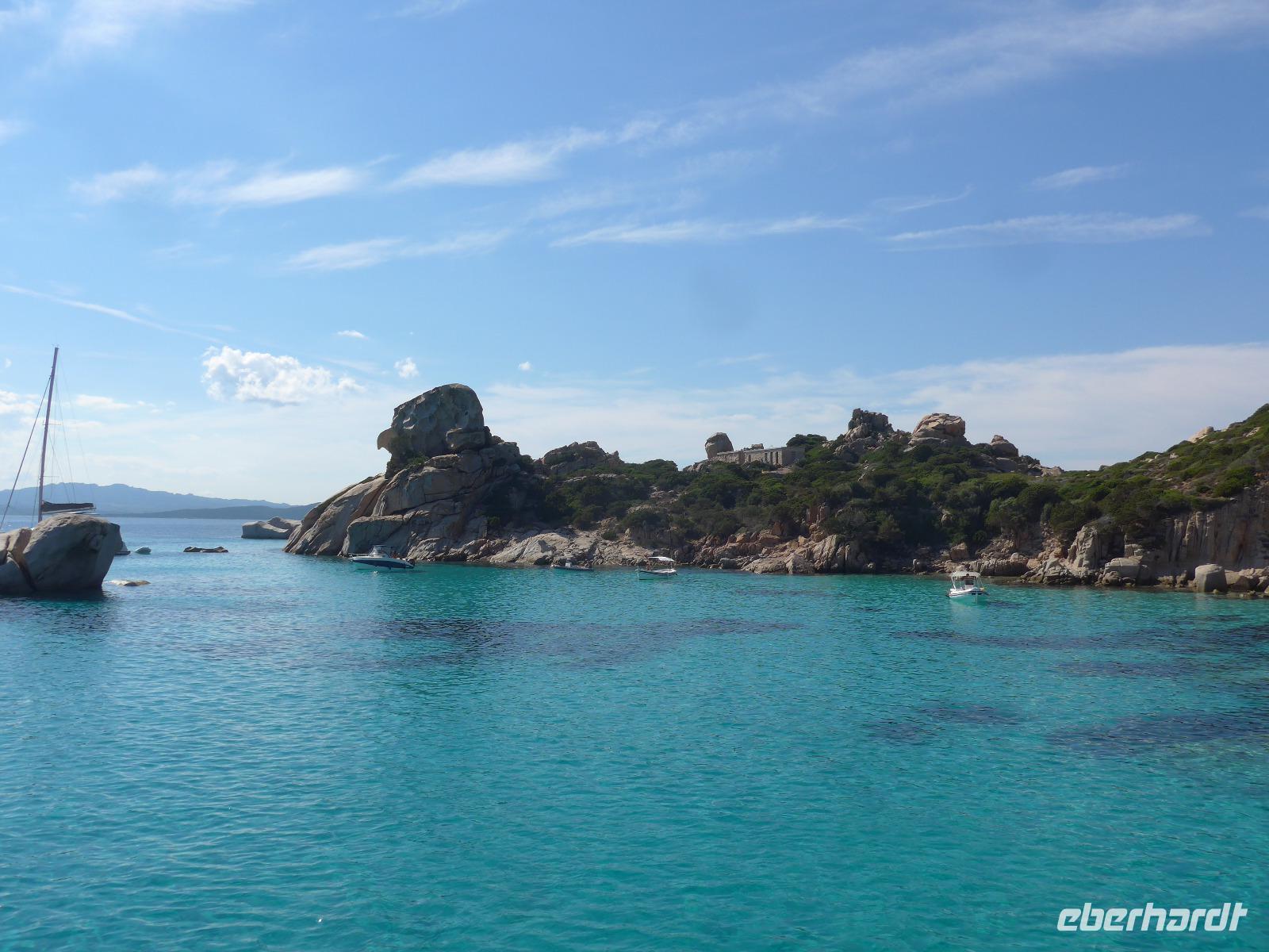 Dieser Ausflug war sehr beliebt und so konnten 2 Damen unserer Gruppe auch nicht mehr kurzfristig nachbuchen. Wir fuhren mit dem Bus nach Cannigione und gingen dort an Bord eines Ausflugsschiffes. Wir waren rechtzeitig da und bekamen noch Platz auf dem Oberdeck an 2 langen Tischen. Beim zweiten Zustieg in Baia Sardinia war das Schiff dann echt voll und wir mußten immer unsere schönen Plätze verteidigen. Zunächst probierten wir aber erst einmal den Mirto rosso und den Nuraghenkuchen - 2 Spezialitäten von Sardinien. Im Hauptort des Inselarchipels La Maddalena gingen wir an Land und erkundeten das zauberhafte Städtchen. Dann ging es weiter zur Insel Santa Maria mit Ausstieg an einer wunderschönen Sandbadebucht zum Schwimmen. In der Zwischenzeit hatte die Crew ein Mittagessen für uns vorbereitet, ein Teller Pasta mit Tomatensose. Unser Schiff legte wieder ab und wir fuhren zwischen kleineren und größeren Inseln hindurch, vorbei am rosa Strand zur nächsten Badepause in der Kosarenbucht. Auch hier erwartete uns wieder glasklares Wasser zum Schwimmen. Auf der Rückfahrt machten wir noch einen Abstecher nach Palau - das nördliche Ende der Costa Smeralda - und vom Schiff aus konnten wir gut den "Bär" erkennen.