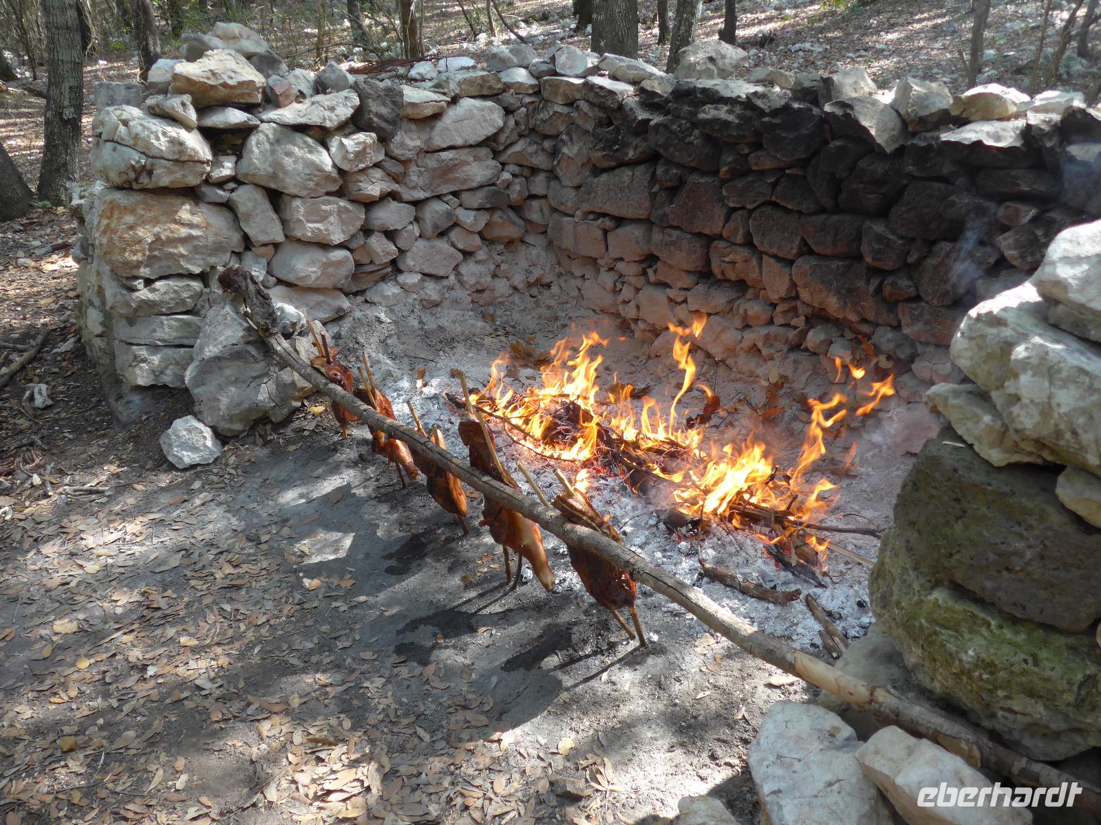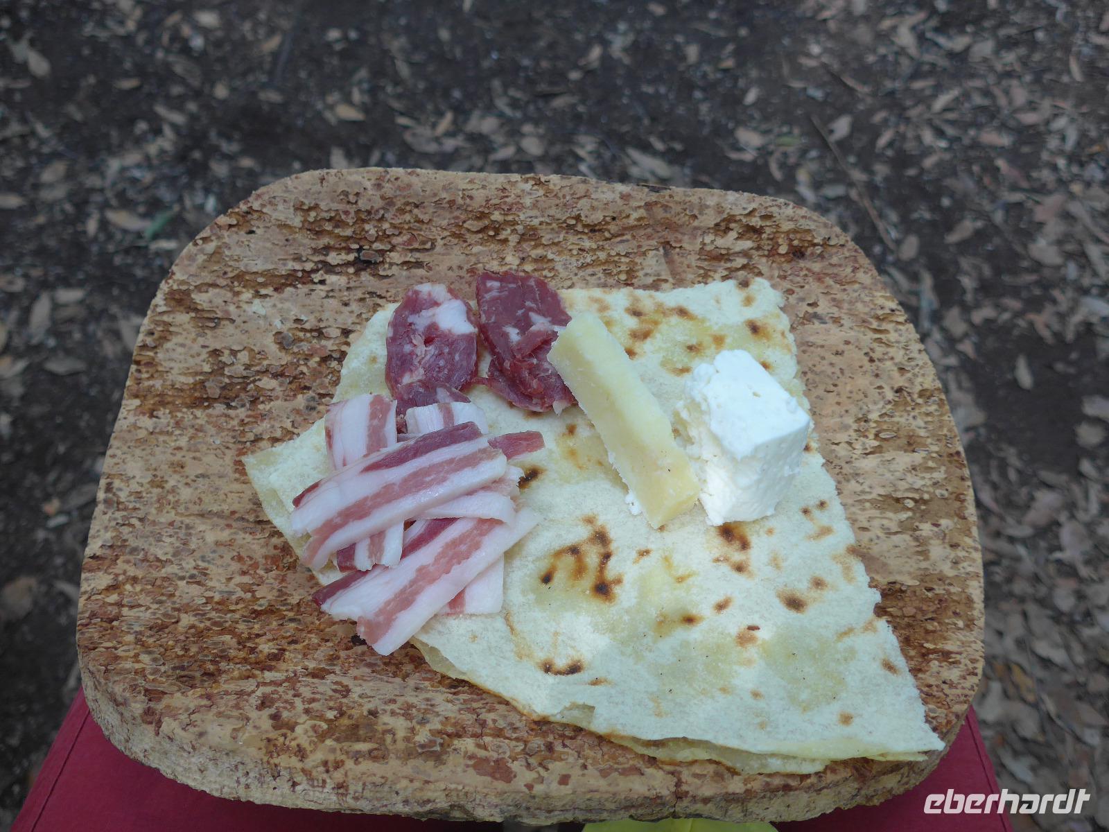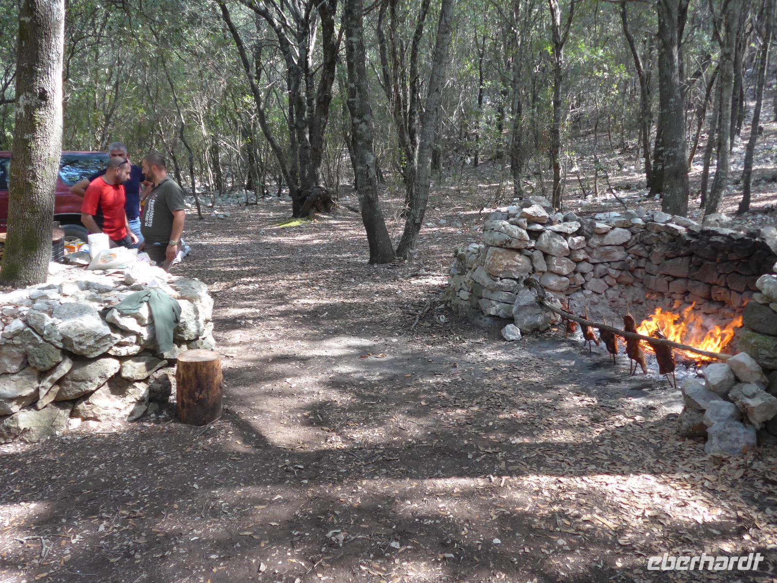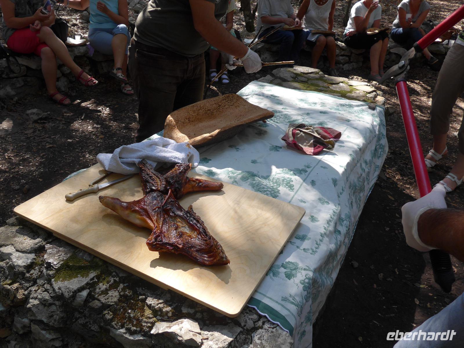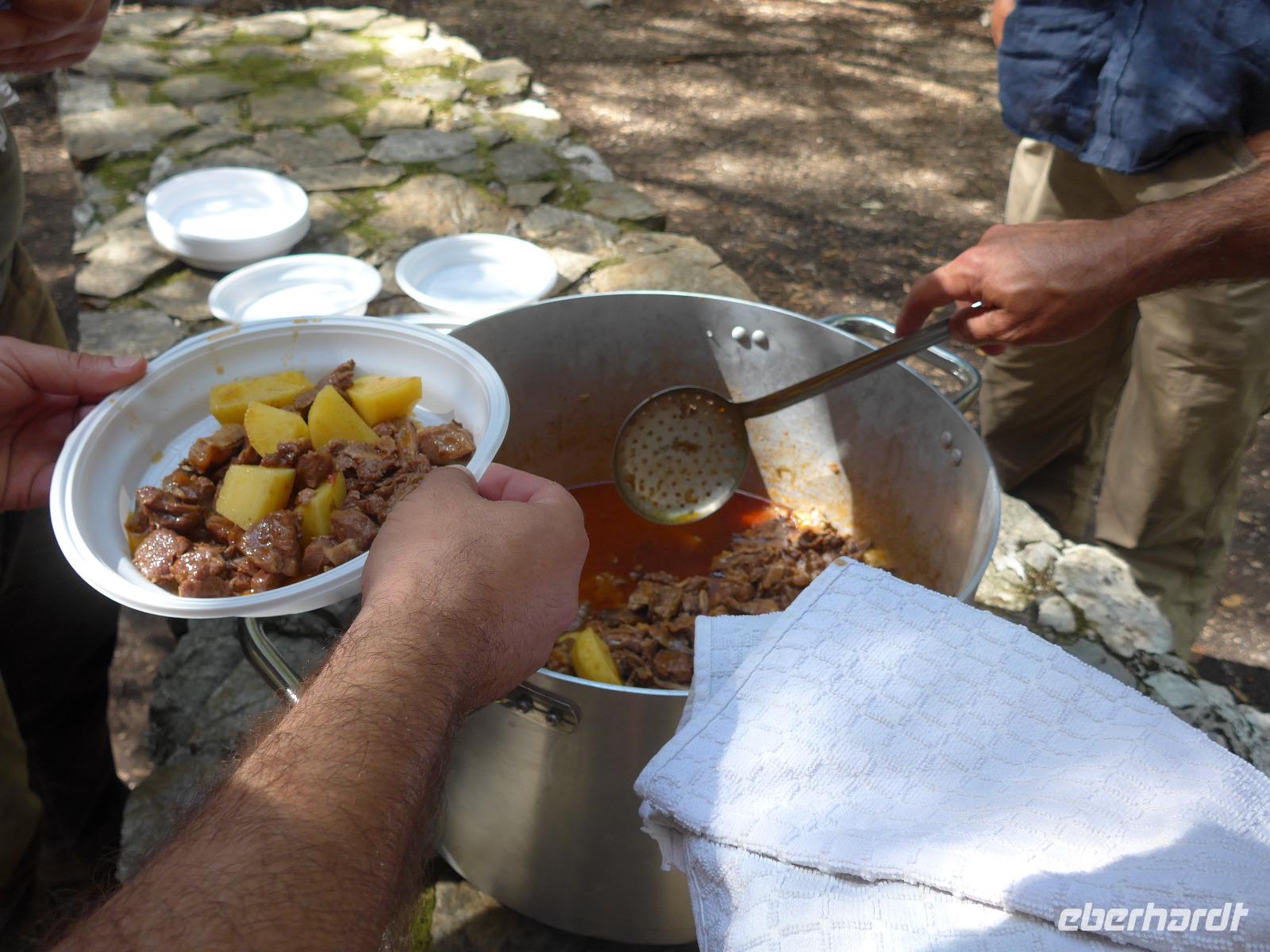 Mitten im Wald unter Bäumen gab es eine halbrunde Mauer zum Sitzen, in der Mitte einen "Tisch" und eine Feuerstelle, wo ein Spanferkel gegart wurde. Drei Hirten empfingen uns und es gab gleich Fladenbrot, den süffigen Cannonau Rotwein und Wasser. Für die Speisen standen Korkbrettchen bereit und diese wurden zunächst mit verschiedener Wurst, Speck, Ricottakäse und Pecorino befüllt. Dann kam ein großer Topf auf den "Tisch" und daraus wurde ein Lammgulasch mit Kartoffeln und Kräutern verteilt. Zwischendurch wurden Wein und Wasser nachgefüllt. Schließlich kamen die Spanferkelteile auf den "Tisch" und wurden mit einer Astschere zerteilt und uns wieder mit Fladenbrot gereicht. Es schmeckte vorzüglich und es fiel uns schwer, einen Nachschlag abzulehnen. Die Stimmung war sehr gut und wurde noch besser, als zum Schluß ein Gemisch aus Mirto und Grappa verteilt wurde und zu guter Letzt noch ein selbst gebrannter Grappa der Hirten. Nur schwer konnten wir uns von diesem herrlichen Platz trennen.