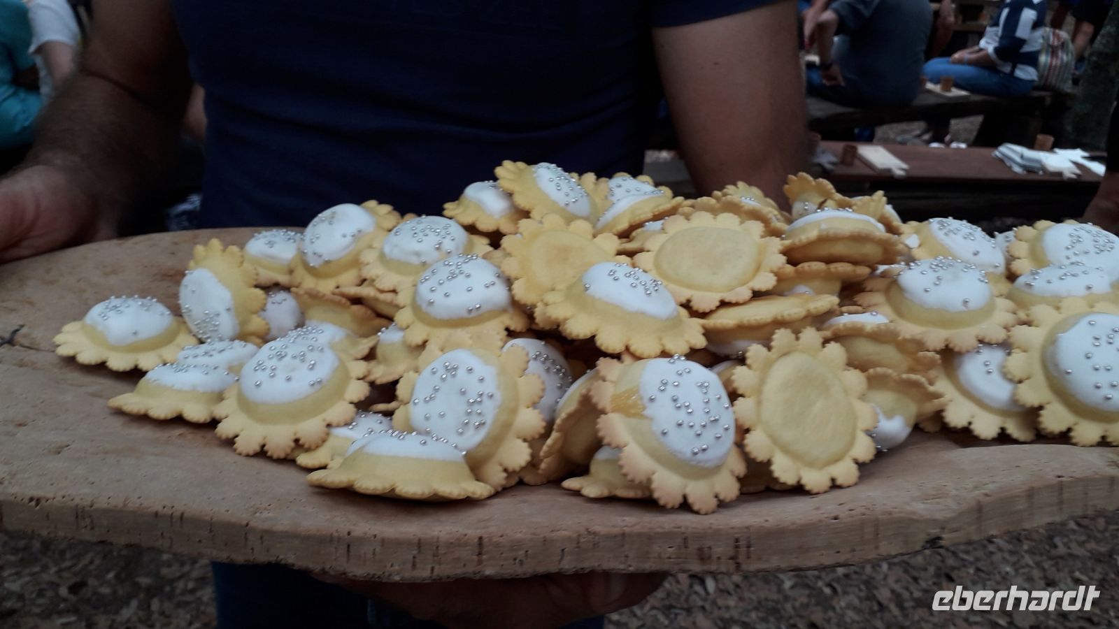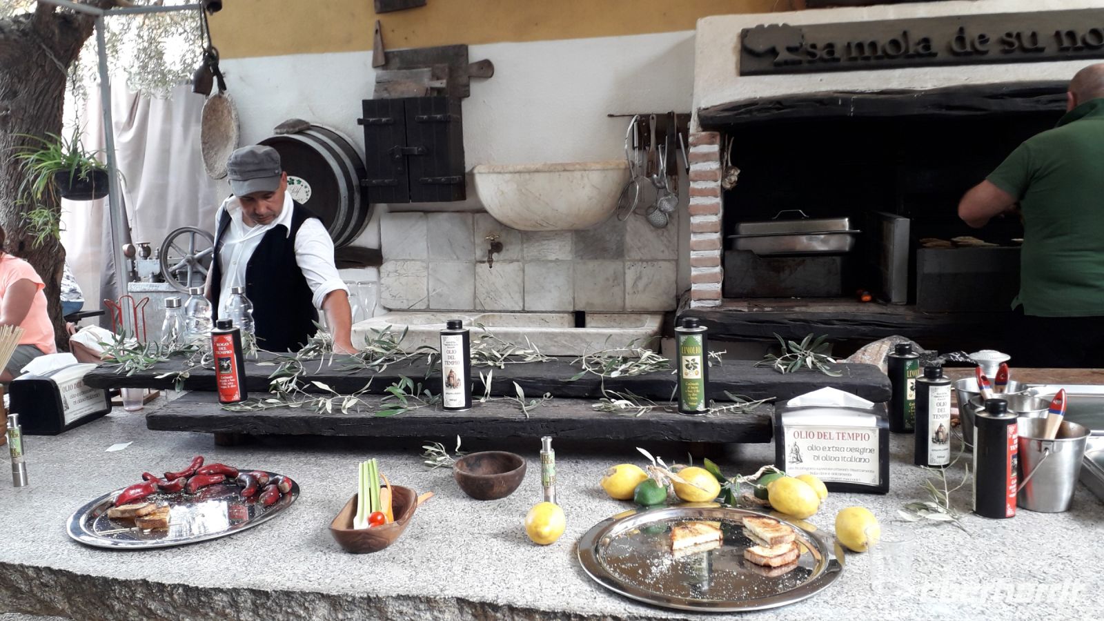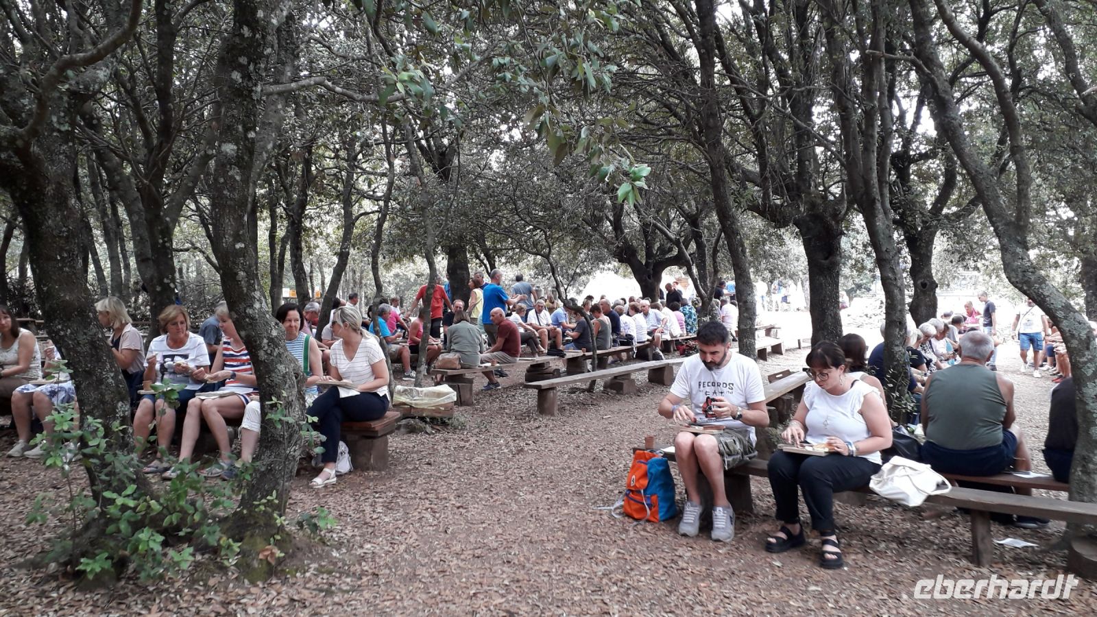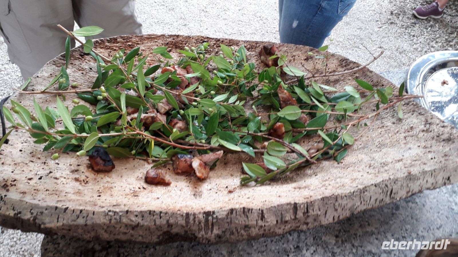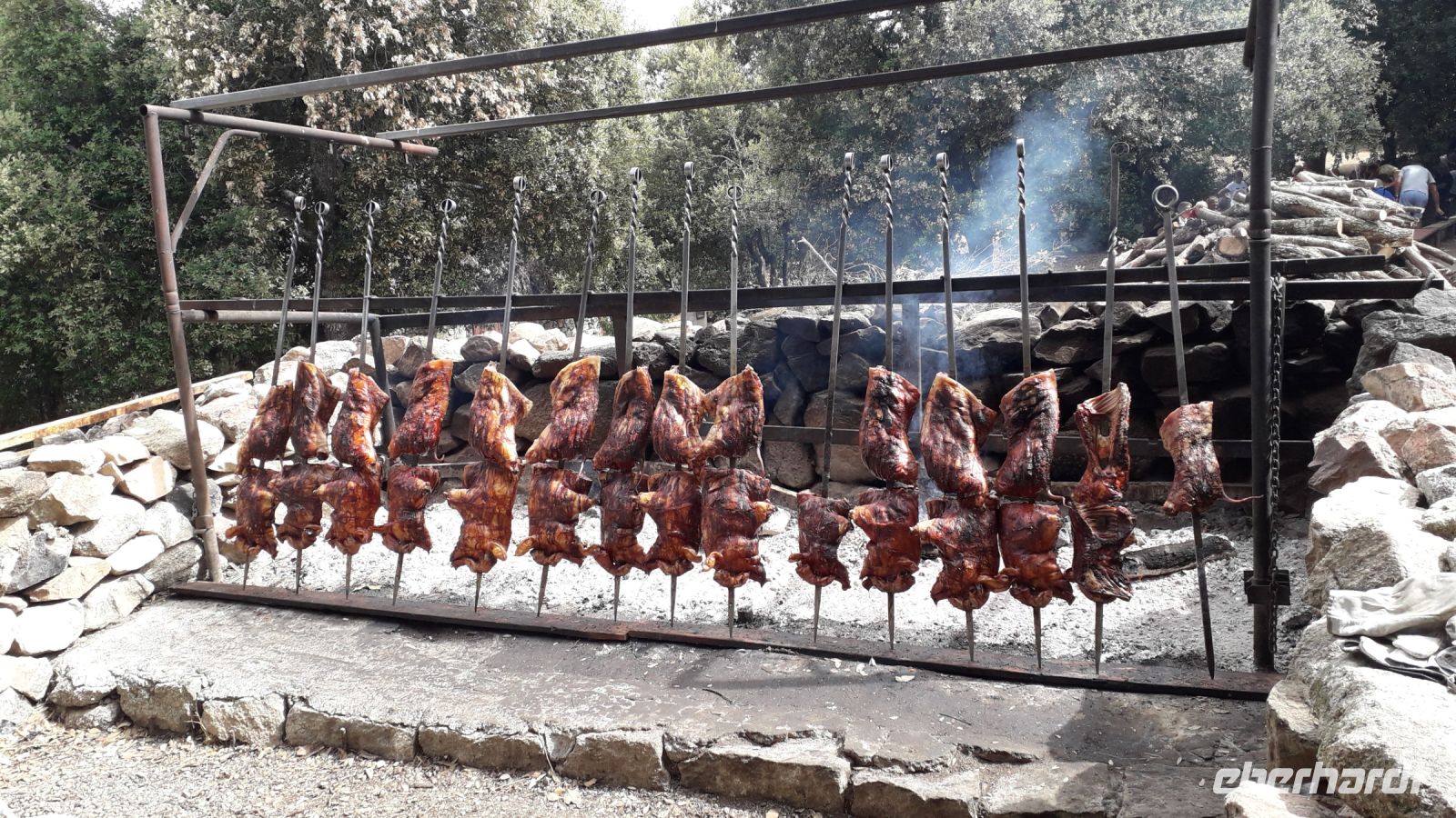 Menschen aus zwei großen Bussen steigen mit uns aus und werden alle im Schatten der Bäume auf die Bänke platziert. Hier bekommt jeder ein Brettchen und es werden am Anfang lokale Käse- & Wurstspezialitäten mit Carasau (Fladenbrot, doppelt gebacken) in Korkschalen serviert. Danach kann man noch Lamm- und Spanferkelfleisch probieren, gefolgt von Riccotakäse, Süssgebäck und Melone. Dazu gibt es reichlich den Rotwein Cannonau und Wasser. Zum Abschluss singen drei Hirten noch ein A-cappella-Ständchen für uns alle.