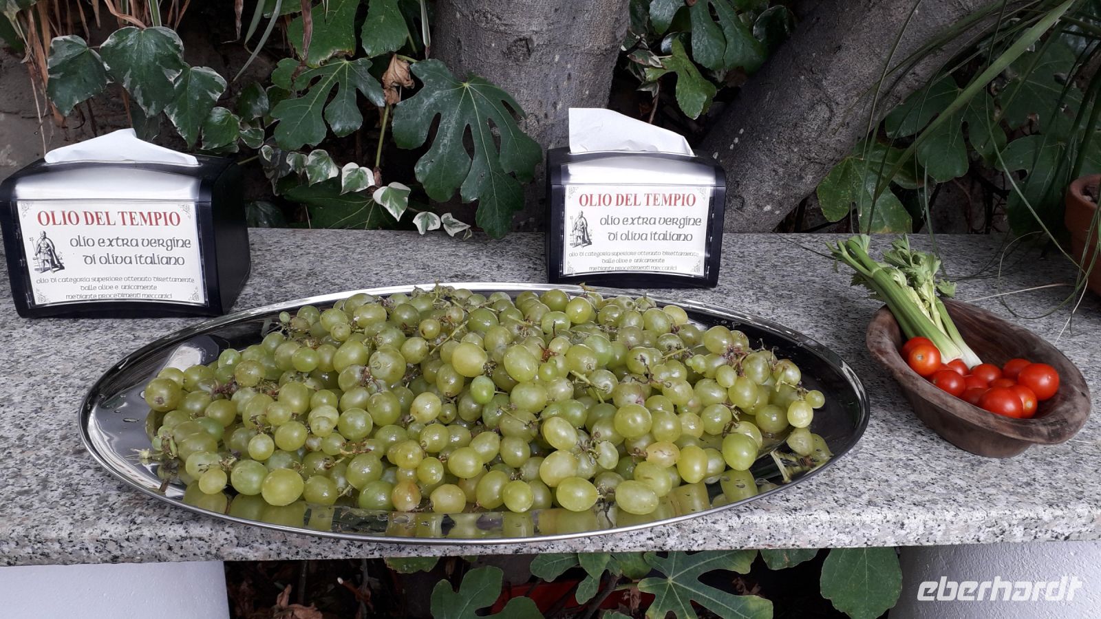 Als Nächstes fahren wir zur Olivenmühle und lernen, wie man ein gutes Olivenöl rein am Geschmack erkennen kann. Danach gibt es ein leichtes Mittagessen. Auf den im Ofen gebackenen Brotscheiben werden alle drei Olivenölsorten mit einem Pinsel aufgestrichen. So können wir alle Sorten probieren. Dazu gibt es noch Fleisch, Oliven, Gemüse-Sticks sowie Ricottakäse mit Honig und Weintrauben zum Nachtisch.