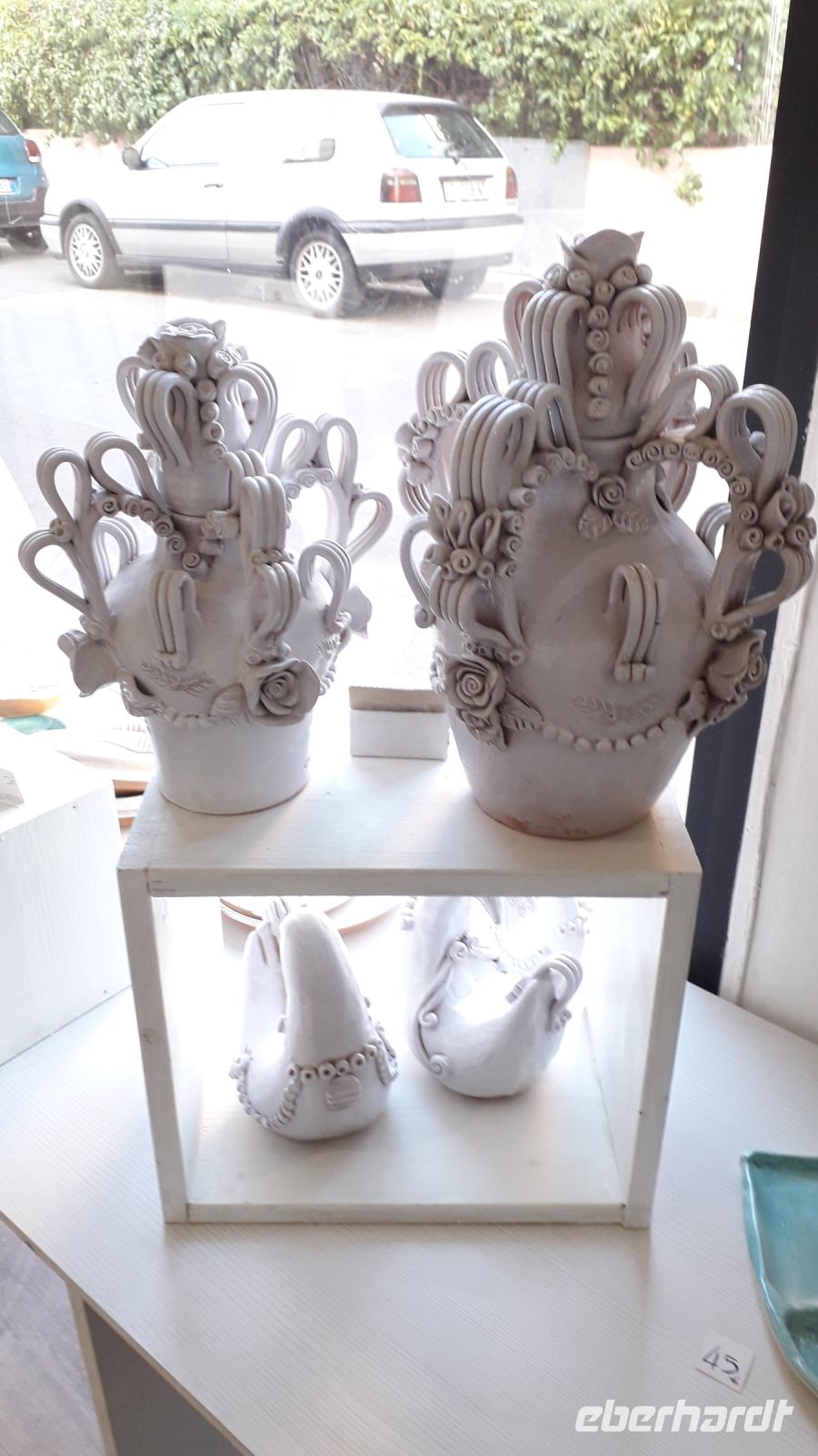Den heutigen Morgen beginnen wir kreativ und werden in der Keramik-Werkstatt von Lucca in Assemini unter seiner Anleitung etwas aus Ton modellieren. Die Gipsformen eines Pfaus liegen bereits auf dem Tisch. Lucca verteilt den Ton und schon beginnt das große Abenteuer für die meisten Damen.