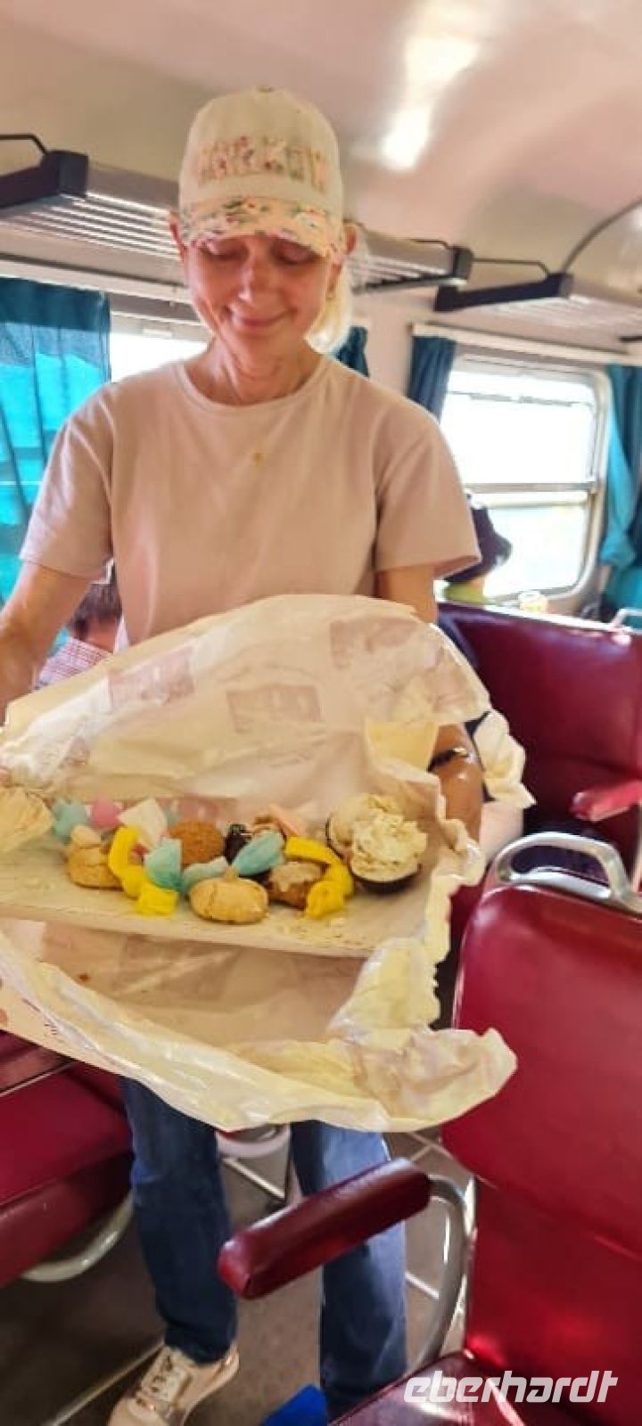 Ein Höhepunkt der Reise steht am Nachmittag auf dem Programm, die Fahrt mit dem Trenino Verde (deutsch kleiner grüner Zug). Auf dem Bahnhof von Sadali erwarteten wir die Einfahrt des nostalgischen Zuges, er verspätete sich um 10 Minuten. Die für unsere Gruppe gebuchte Panoramafahrt mit der Schmalspurbahn führt ca. 65 km, durch beeindruckende Gebirgslandschaften, vorbei an riesigen Stauseen, über Brücken und Täler bis in das kleine Örtchen Mandas, im Inselinneren Sardiniens. Nach ungefähr drei Stunden Fahrzeit hatte das „Bähnle“ Ihr Ziel erreicht. Für unseren Busfahrer Paolo waren wir zu früh da, er durfte erst in ca. 45 Minuten seinen Bus starten. Kein Problem, wir genießen ein kühles Getränk oder einen Kaffee im kleinen Gasthaus des Örtchens.