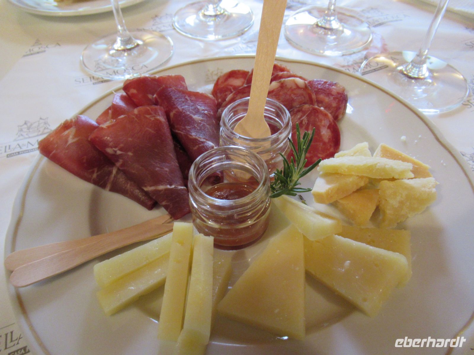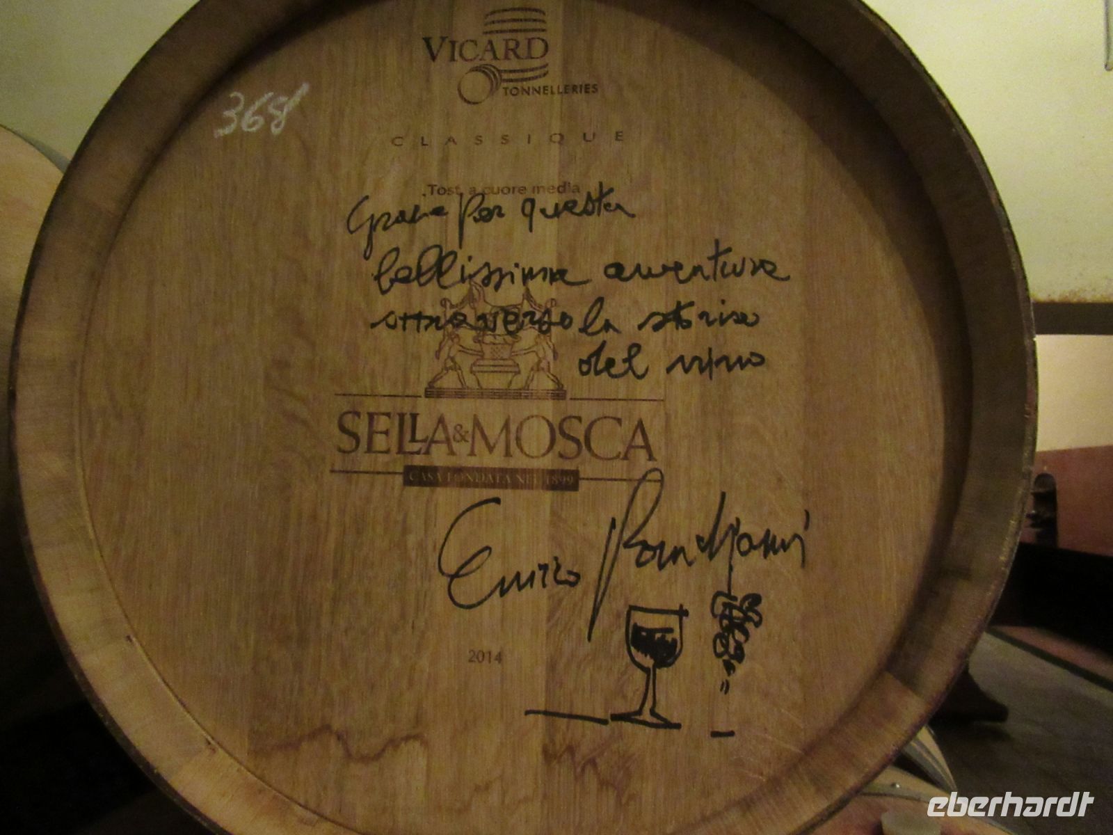 Unser zweiter historischer Besichtigungspunkt stand nun auf dem Programm, die Nuraghe Palmavera. Hierbei handelt es sich um prähistorische turmartige Rundbauten aus großen Steinblöcken ohne Mörtel. Es ist faszinieren was bereits zur Bronze- und frühen Eisenzeit geschaffen wurde. Nach der Mittagspause zum Verschnaufen wurde es kulinarisch, das größte Weingut Sardiniens - Sella & Mosca – erwartete uns. Das 1899 von 2 Piemontesern, Ingenieur Sella und Rechtsanwalt Mosca, gegründete Weingut verfügt bei Alghero über 520 Hektar Rebflächen. Unser Fahrer hat Paolo hat uns supersicher über die schmalen Wege zwischen den Weinstöcken chauffiert. Wir erfuhren viel über Alter, Pflege, Art und Bewässerung der Weinstöcke. Nach der ausführlichen Besichtigung des riesigen Weinkellers und des dazugehörigen Museums verkosteten wir vier der hier produzierten Weine - Terre Bianche Cuvée 161, Cala Reale, Rosatodi Alghero und Dimonios. Dazu wurden uns sardische Wurst-, Käse- und Marmeladenspezialitäten serviert.