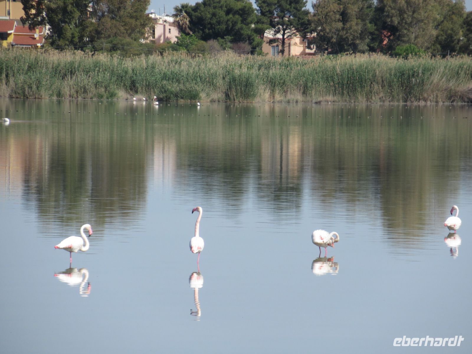 Sardiniens Hauptstadt Cagliari ist seit der Antike eine bewohnte Siedlung. Nach ca. 1 Stunde Busfahrt von Castiadas nach Cagliari bei strahlendem Sonnenschein erreichten wir die Salinen-Felder am Poetto-Strand. Seit vielen Jahren werden diese von rosafarbenen Flamingos zum Brüten bevölkert. Das salzhaltige Wasser bieten den Vögeln perfekte Bedingungen.
