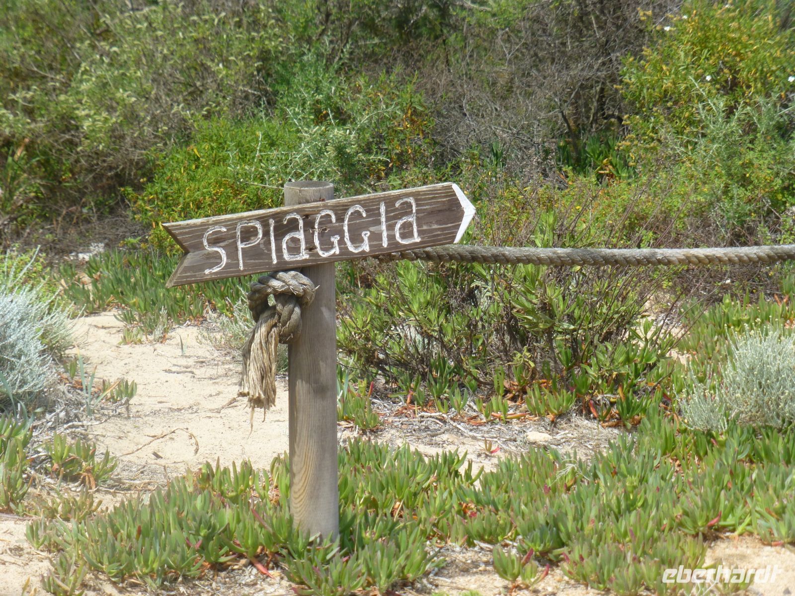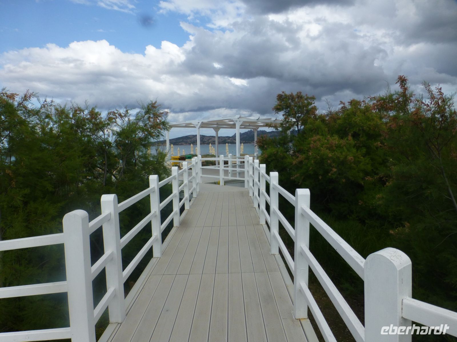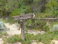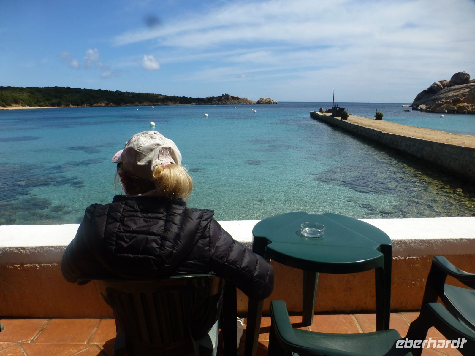 Es geht wieder zurück auf die Hauptinsel und dann entlang der Küste. Die Farbe des Wassers setzt uns in Verzücken. Und der Gedanke, mal im Sommer eine ganze Woche hier am und im Wasser zu verbringen, kommt hoch. Wir machen einen Stopp an der Spiaggia di Cala Spalmatore, fahren ein Stück und halten an der Spiaggia di Trinità. Hier gibt es ein gut sortiertes großes Strandcafé mit Blick auf die kleine Dünenlandschaft, durch die ein Holzsteg an den Strand führt. Einfach nur zauberhaft.