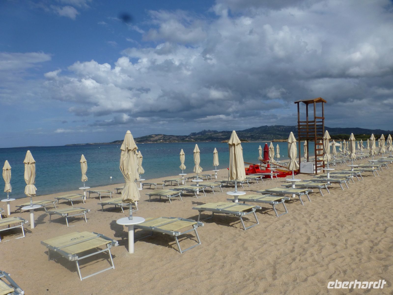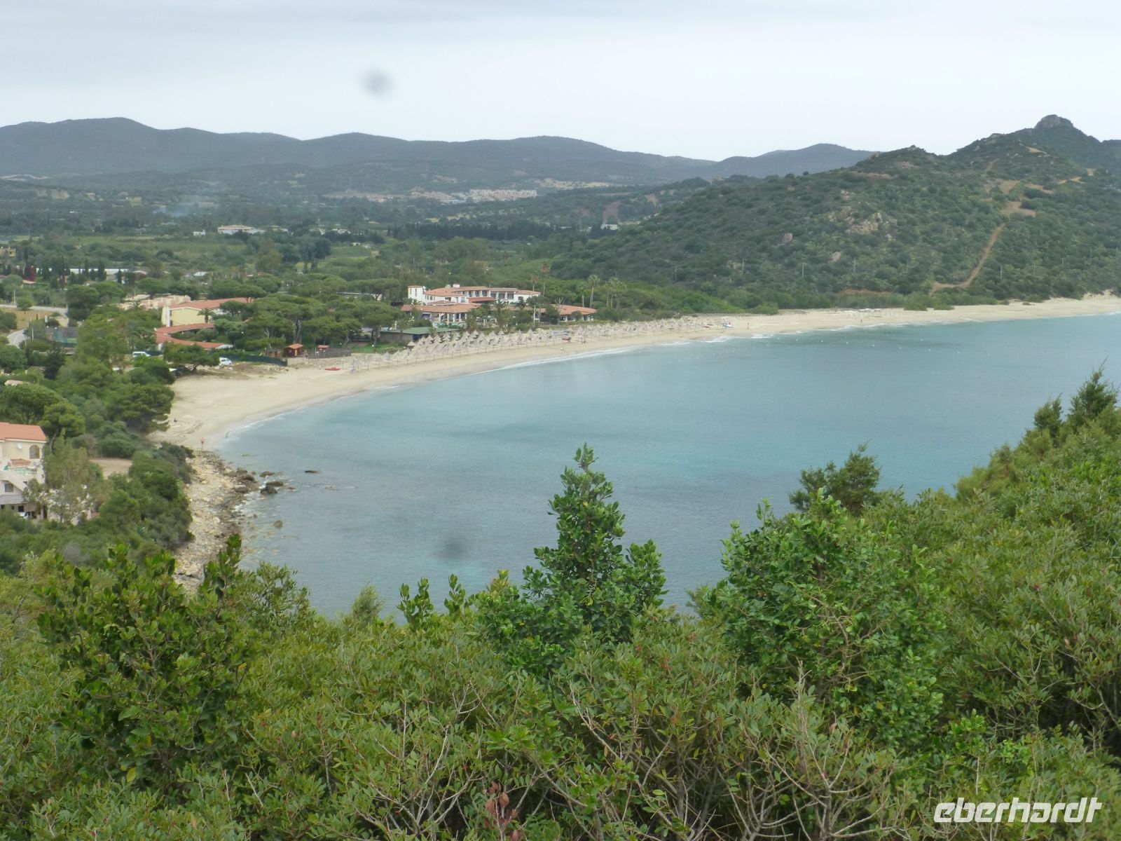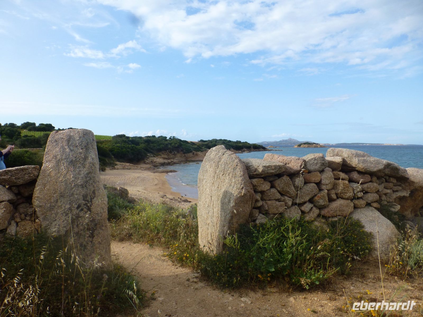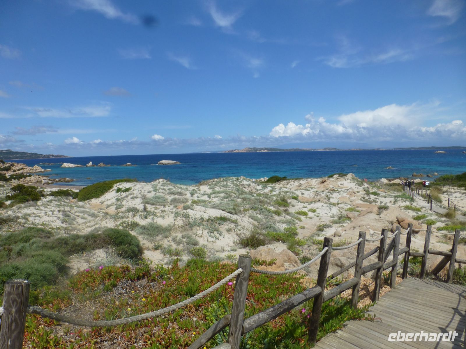 Es geht wieder zurück auf die Hauptinsel und dann entlang der Küste. Die Farbe des Wassers setzt uns in Verzücken. Und der Gedanke, mal im Sommer eine ganze Woche hier am und im Wasser zu verbringen, kommt hoch. Wir machen einen Stopp an der Spiaggia di Cala Spalmatore, fahren ein Stück und halten an der Spiaggia di Trinità. Hier gibt es ein gut sortiertes großes Strandcafé mit Blick auf die kleine Dünenlandschaft, durch die ein Holzsteg an den Strand führt. Einfach nur zauberhaft.
