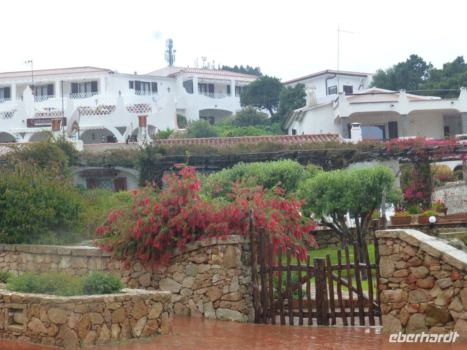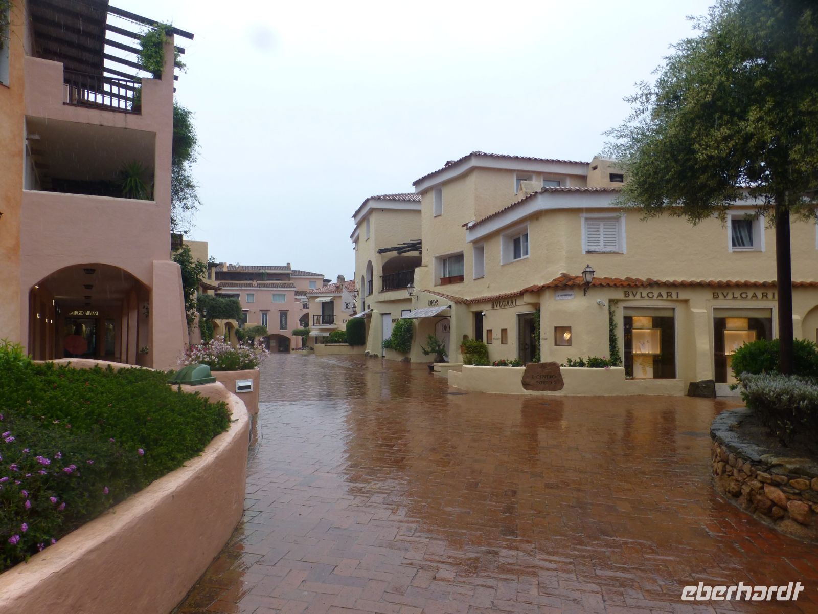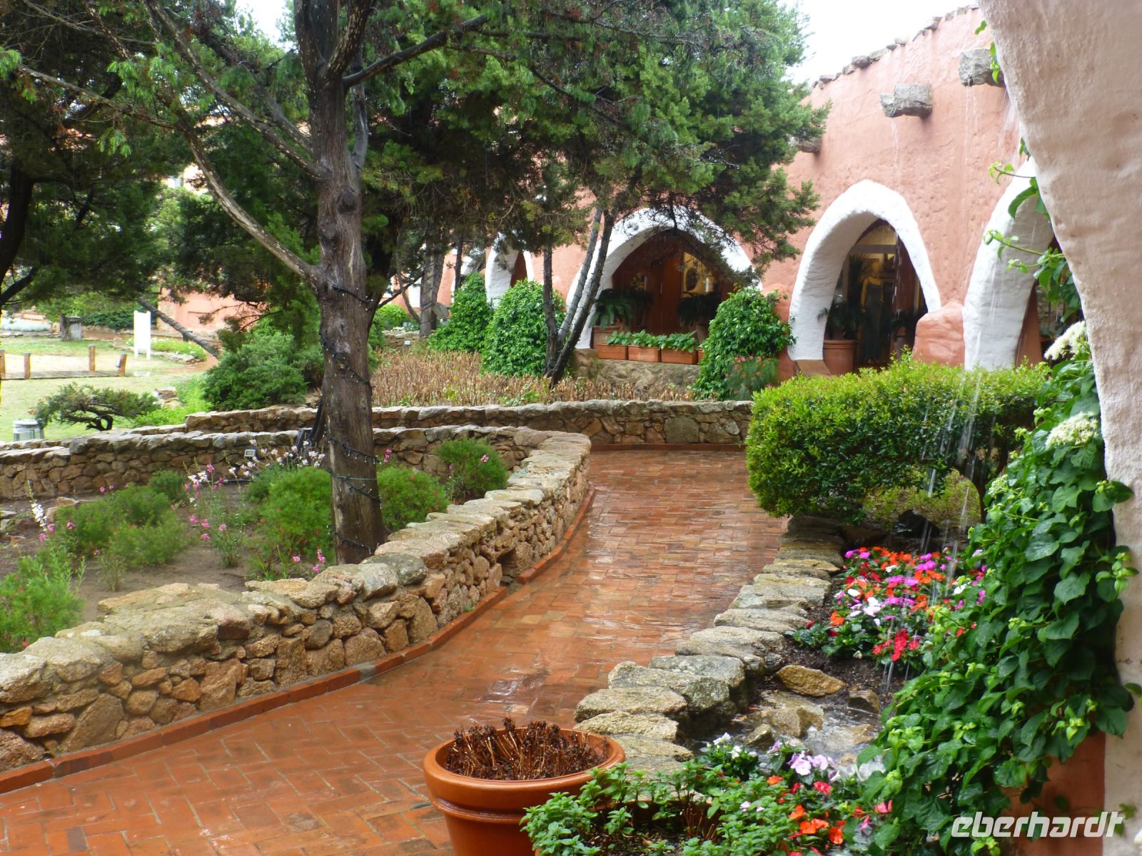 In Porto Cervo steigen wir vom Bus in ein Touristenbähnchen um, das uns durch den Ort und zum neuen wie alten Hafen fährt. Die teuren Villen liegen versteckt hinter dichten Oleanderhecken und Mäuerchen. Ein Tor aus dem heimischen Wacholderholz kostet locker 20.000 Euro, doch was ist das schon gegenüber dem Wert des dahinterliegenden Besitzes. Dann geht es zu Fuß weiter. entlang der Fußgängerzone La Passeggiata. Gucci, Versace, Hermes, Louis Vuitton u.a. Luxuslabels warten auf das große Geschäft in der kurzen Saison. Dahinter liegt die Piazzetta mit schönem Blick auf den alten Hafen. Einen Stock tiefer liegt die Portico Sottopiazza, ein Arkadengang mit Geschäften und nettem Café. Über Treppen und Laubengänge, unterbrochen von malerischen Blicken auf den Hafen, kommen wir zur Kirche Stella Maris. Ein anmutiger Bau in Weiß mit einem Vorbau, der über die gesamte Breite geht, mit großen Granitblöcken als Säulen, die einen Architrav aus Wacholderstämmen tragen.