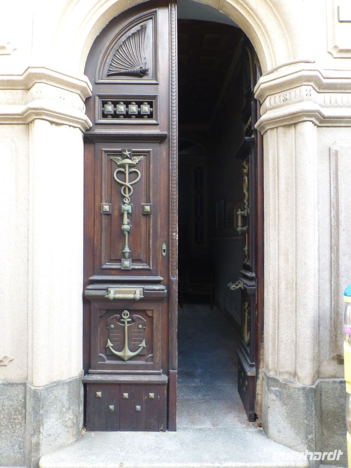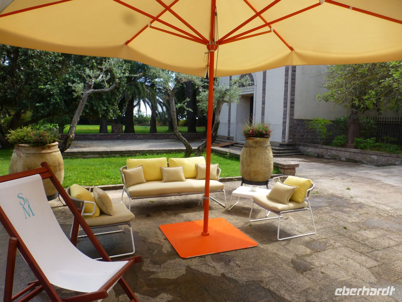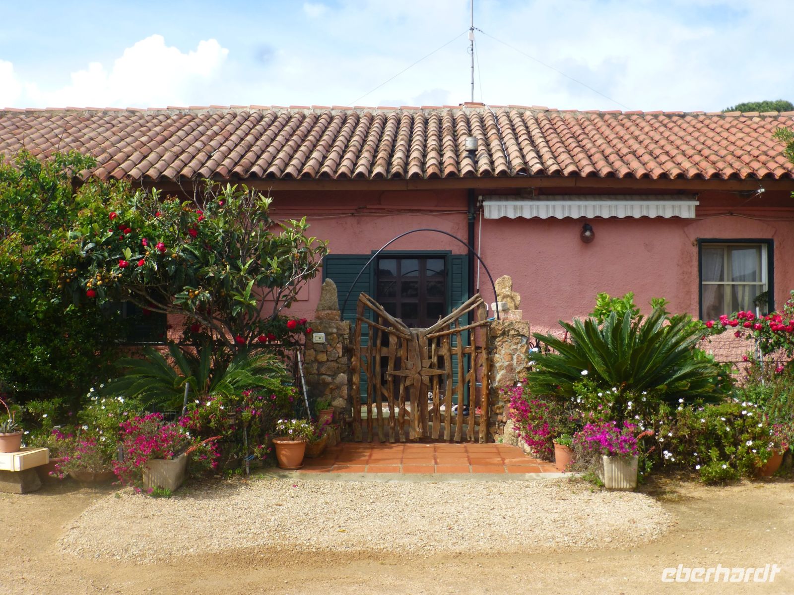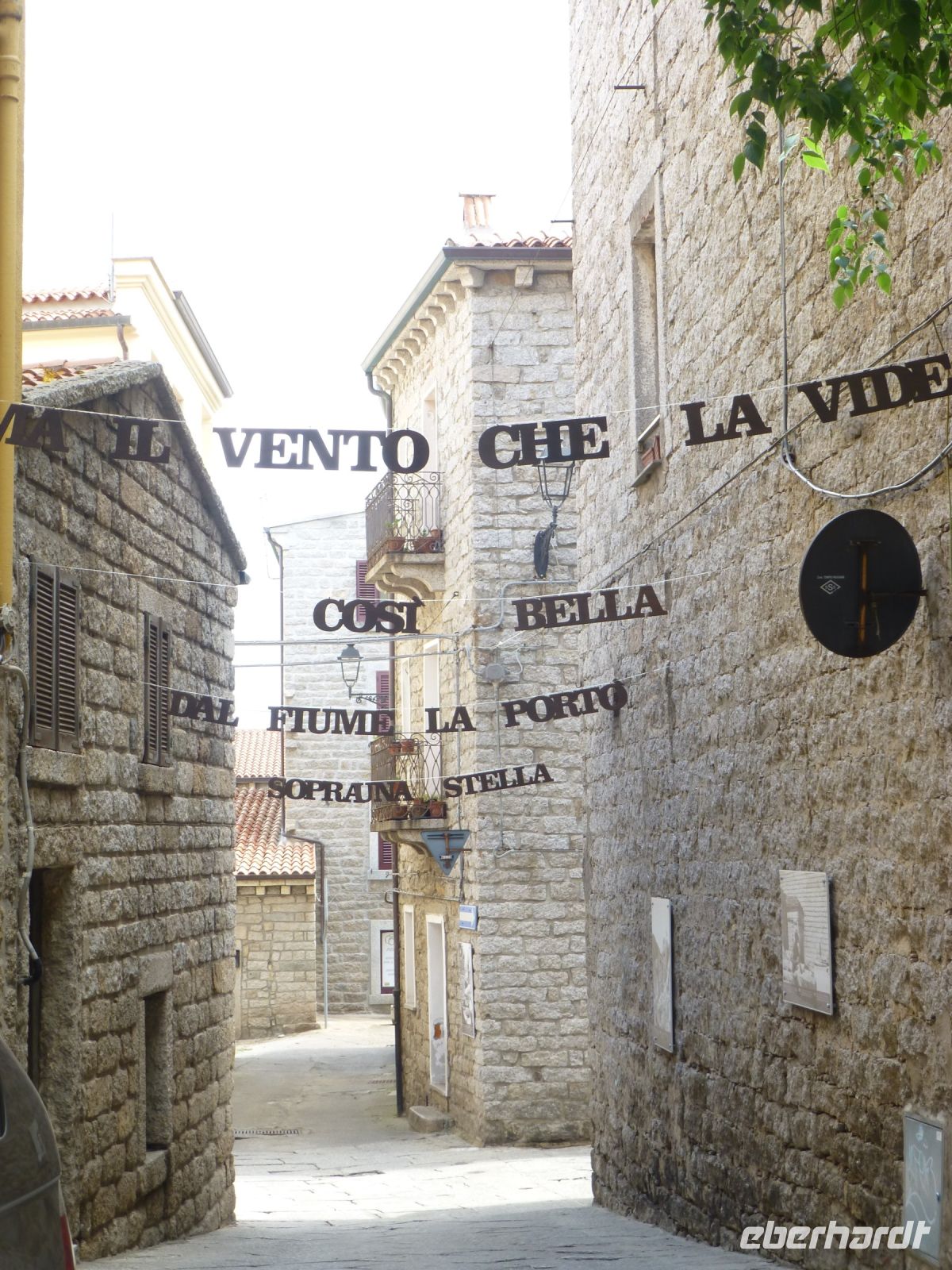 In Porto Cervo steigen wir vom Bus in ein Touristenbähnchen um, das uns durch den Ort und zum neuen wie alten Hafen fährt. Die teuren Villen liegen versteckt hinter dichten Oleanderhecken und Mäuerchen. Ein Tor aus dem heimischen Wacholderholz kostet locker 20.000 Euro, doch was ist das schon gegenüber dem Wert des dahinterliegenden Besitzes. Dann geht es zu Fuß weiter. entlang der Fußgängerzone La Passeggiata. Gucci, Versace, Hermes, Louis Vuitton u.a. Luxuslabels warten auf das große Geschäft in der kurzen Saison. Dahinter liegt die Piazzetta mit schönem Blick auf den alten Hafen. Einen Stock tiefer liegt die Portico Sottopiazza, ein Arkadengang mit Geschäften und nettem Café. Über Treppen und Laubengänge, unterbrochen von malerischen Blicken auf den Hafen, kommen wir zur Kirche Stella Maris. Ein anmutiger Bau in Weiß mit einem Vorbau, der über die gesamte Breite geht, mit großen Granitblöcken als Säulen, die einen Architrav aus Wacholderstämmen tragen.