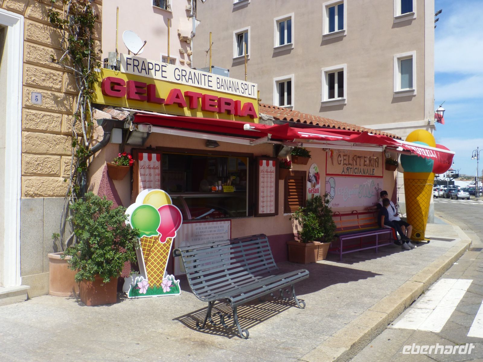 Zur Mittagszeit sind wir in La Maddalena. Anja gibt uns einen Überblick über die Stadt, dann ist Freizeit, die einen gehen essen, die anderen bummeln und setzen sich an den Hafen. Ein Sonntagmittag in Italien, auf Sardinien. Und danach ein Eis.
