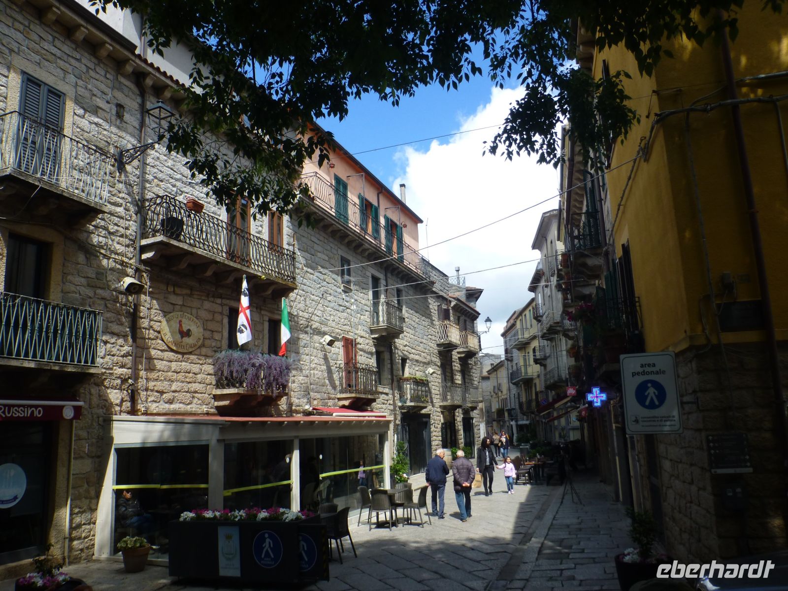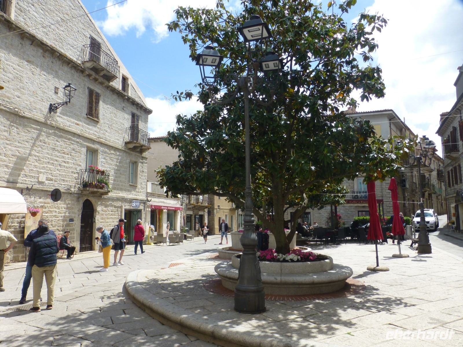 Und inmitten der Korkwälder auf einer Hochebene liegt Tempio Pausania, das Zentrum der Gallura. Ein mittelalterlich anmutender Ort mit grauen Fassaden aus Granit. Große Granitplatten im Fischgrätemuster pflastern die Straße. Die Innenstadt ist Fußgängerzone, Männer sitzen vor dem Café und plaudern, die Frauen sieht man mit Einkäufen. Ein freundlicher Ort. Hier gab es mal Zuwachs, Neubauten aus den 60-er Jahren stehen am Rand der Altstadt. Nun sind Immobilen mittendrin für kleines Geld zu kaufen. Ein Laden mit hochwertigen Erzeugnissen, in denen Kork verarbeitet ist, wird von uns gestürmt. Von Schmuck über Taschen und schicke Abendkleidung reicht das Angebot.